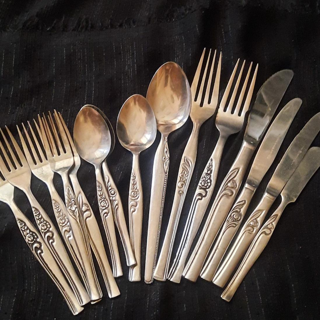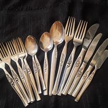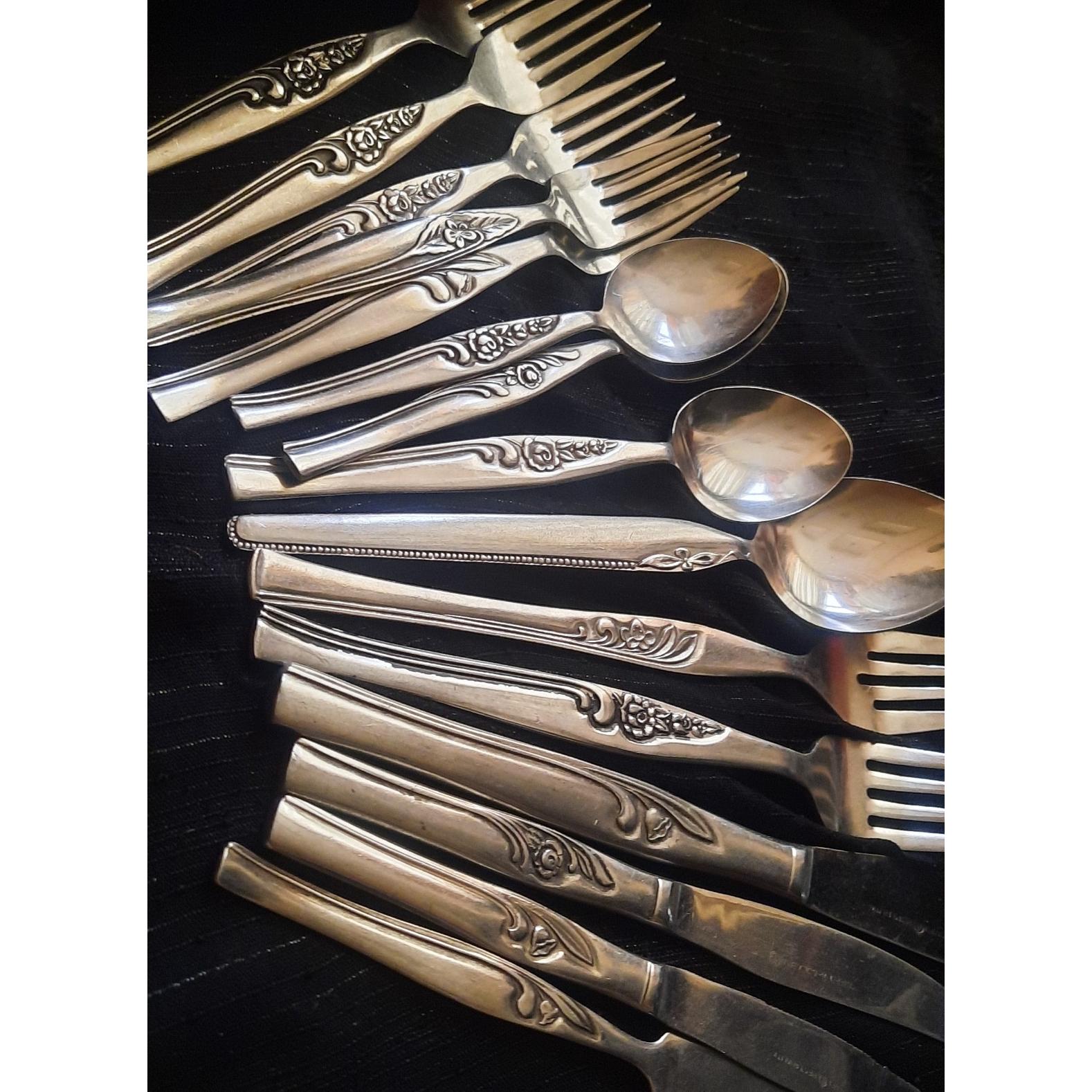 یک قاشق غذاخوری  دو چنگآل غذا و پنج چنگال میوه یکیش لک داره حساب نکردم دو کارد کره خوری و یک کارد استیک یک کارد کیک  یک قاشق مربا بزرگ و وو قاشق مربا کوچک طرح و گل و مارک متفاوت خط و خش ممکن است دیده شود عمر 60 دست دوم به گلها توجه کنید جهت باغ یا کسری