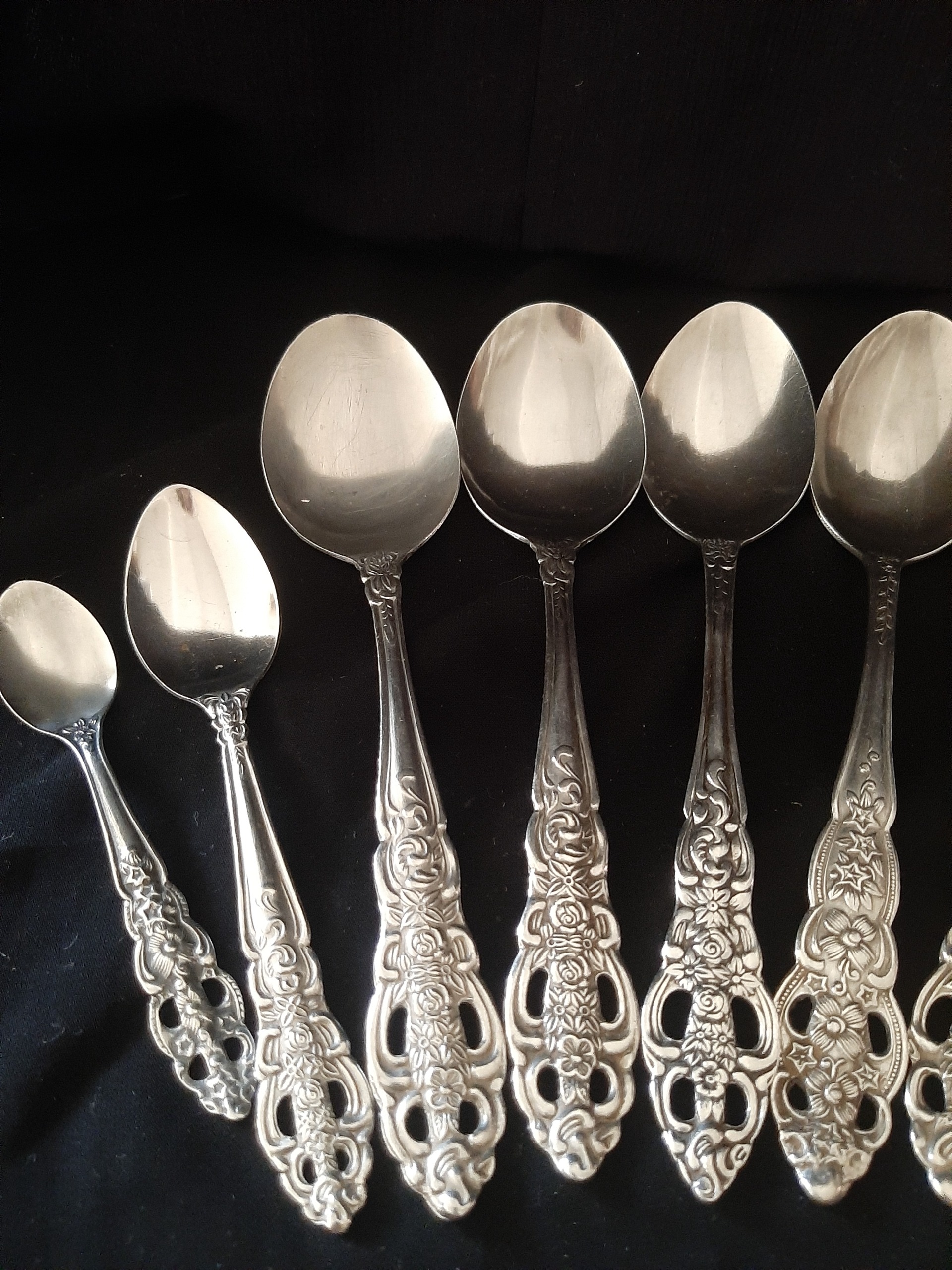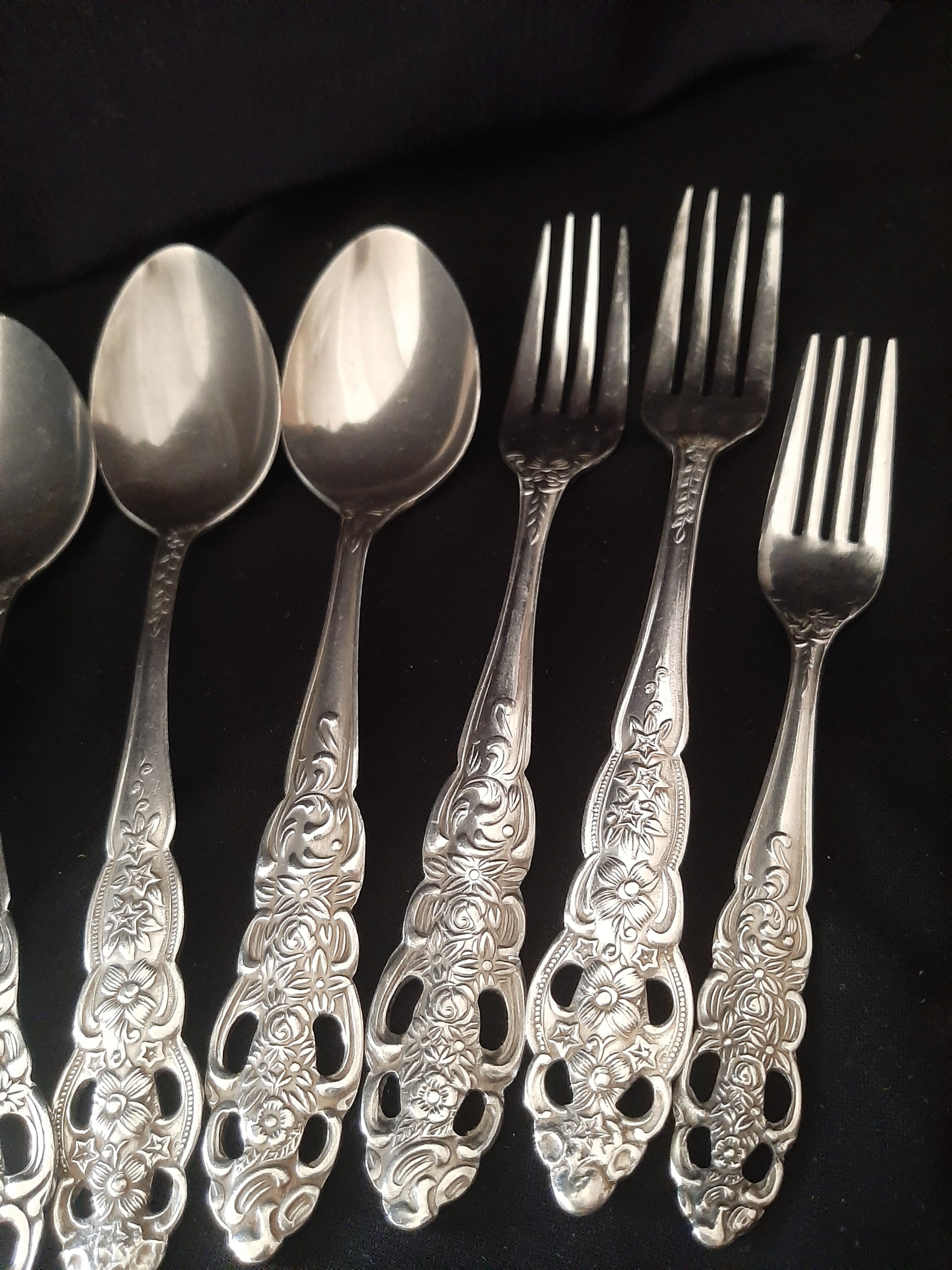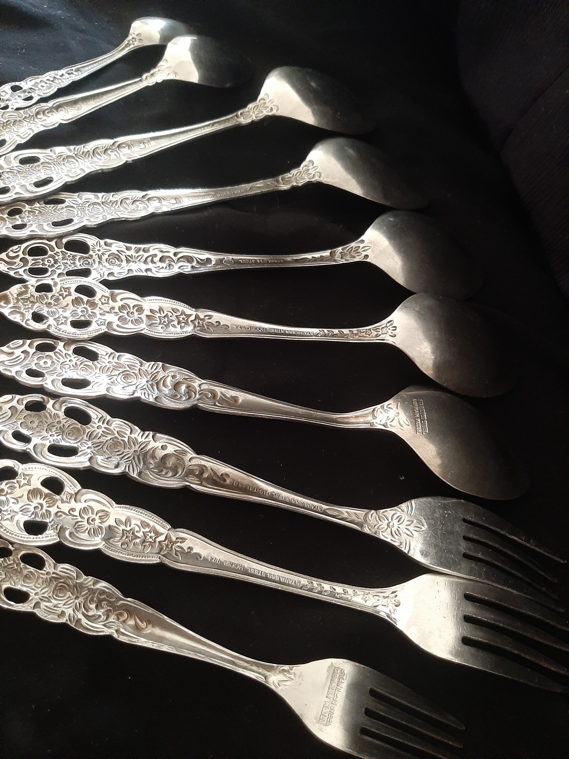 5 قاشقغذا 2 چنگال غذا و 1 چنگال میوه یک قاشق مربا و یک قاشق چایخوری گل و مارک متفاوت جهت کم و کسری و باغ یکی دو تا کمی سیاه شده خط و خش ممکن است دیده شود عمر 60