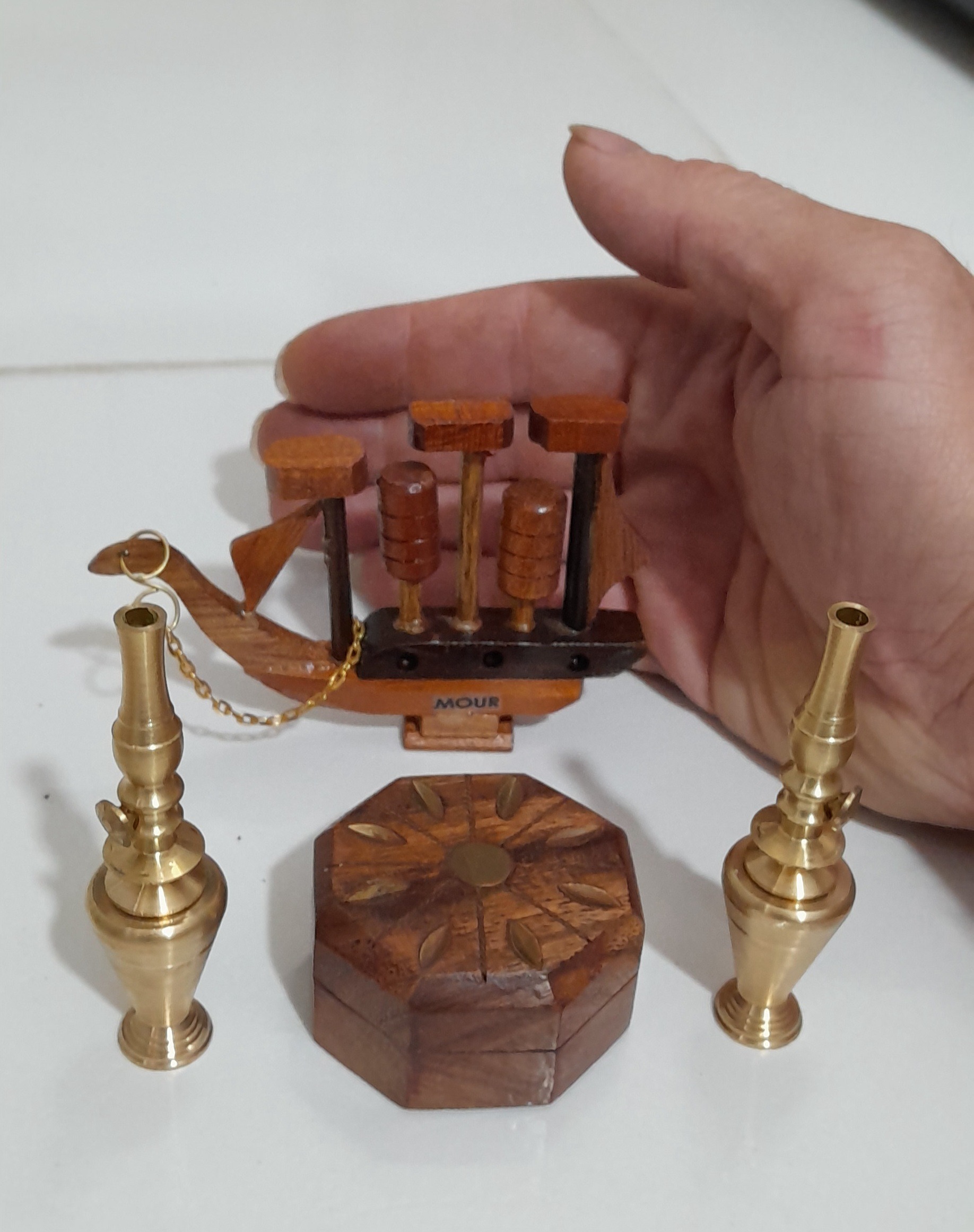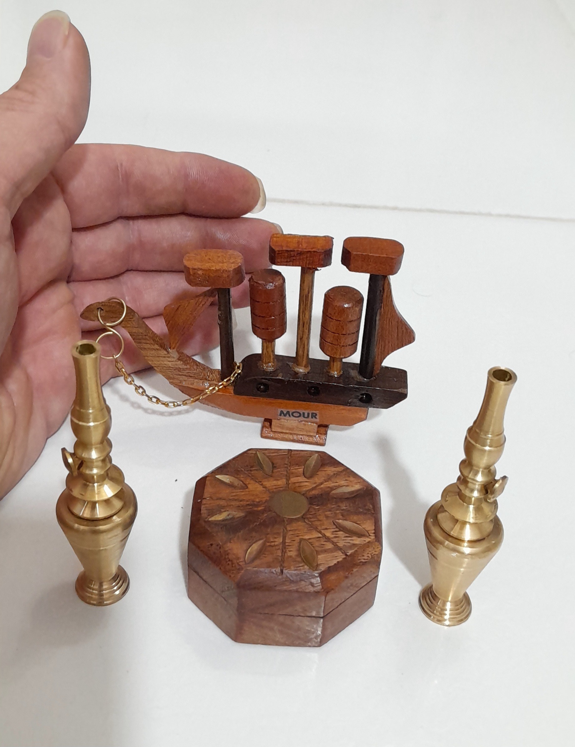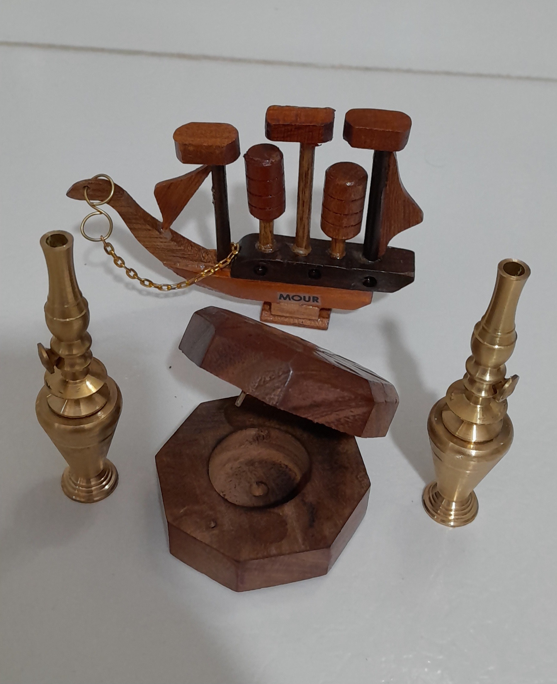 دو عدد گردسوز برنجی 7 سانتی توپُر محکم و جعبه جواهر کوچک و کشتی چوبی.