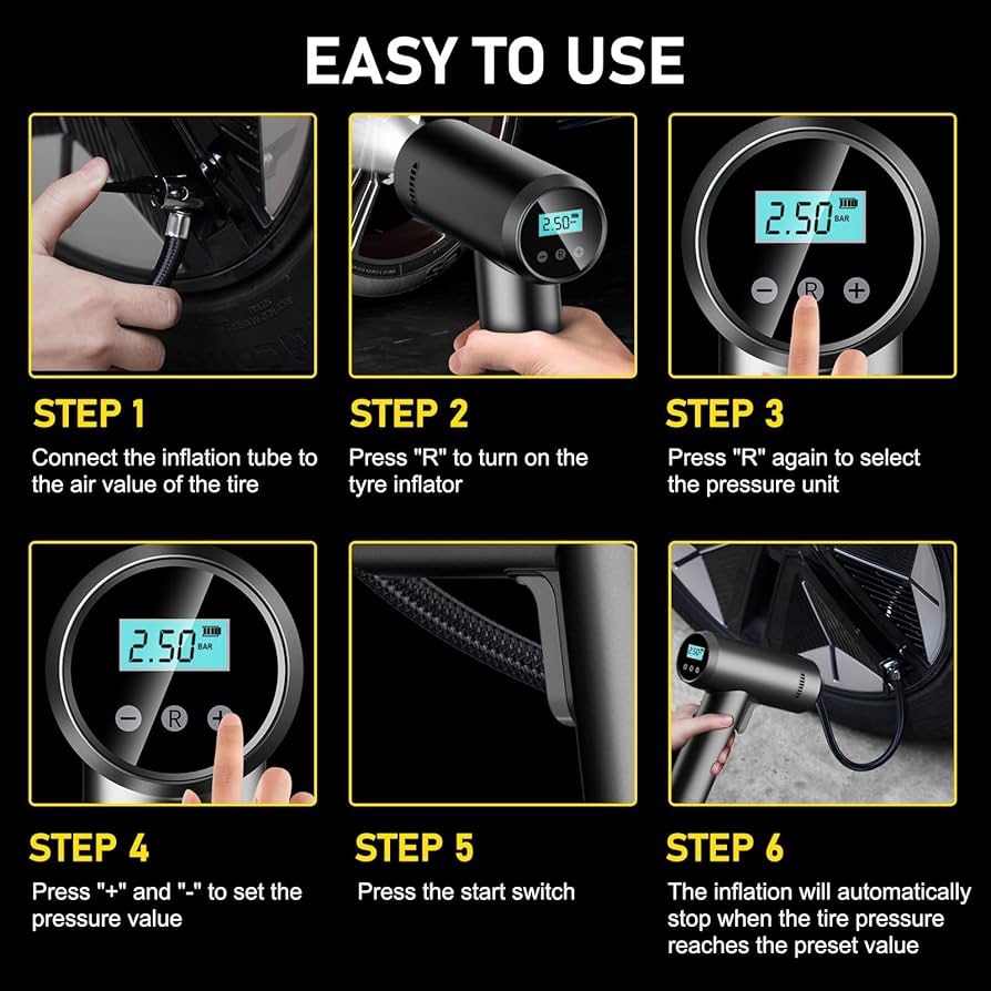 کنترل راحت بیسیم: بادکننده دستی تایر ما با طراحی سبک و ارگونومیک، باد کردن در حین حرکت را آسان و راحت میکند. از آزادی باد کردن بیسیم لذت ببرید!