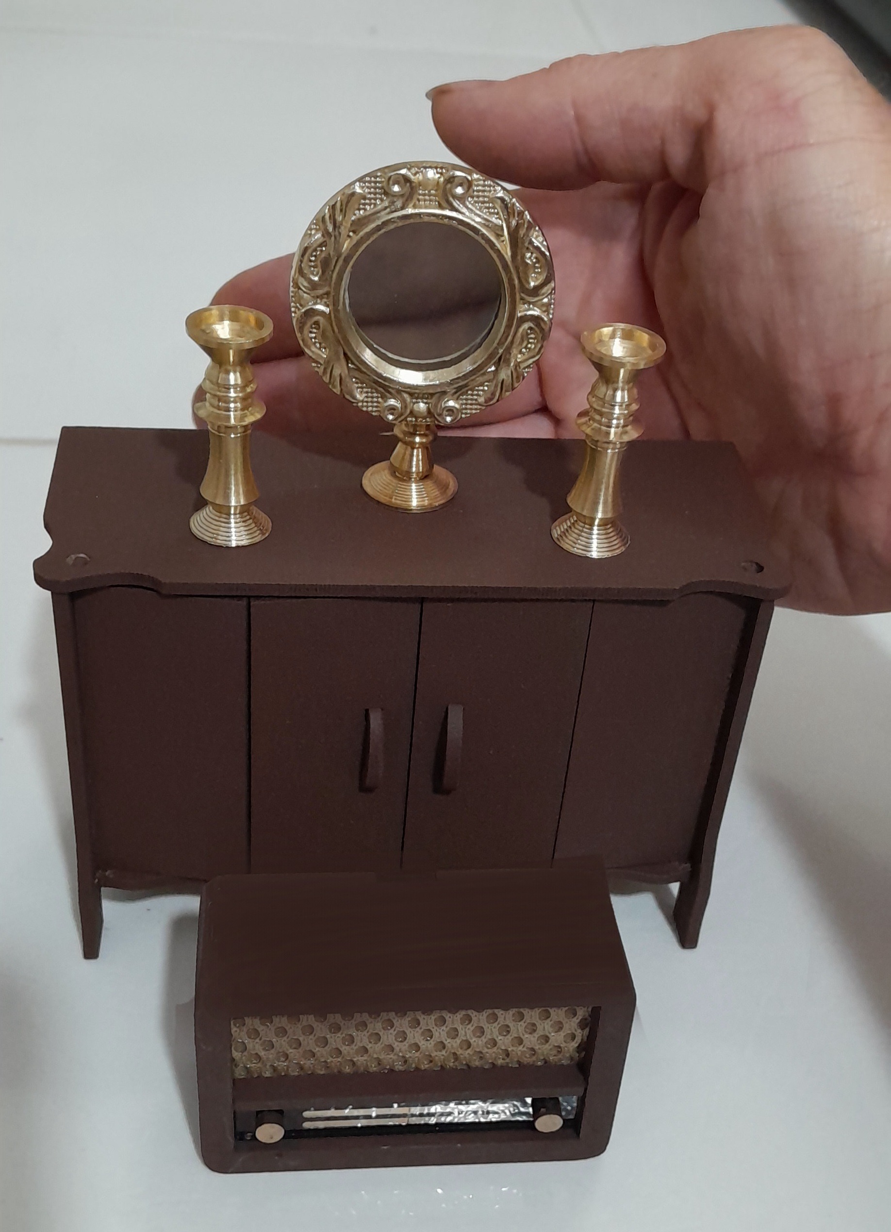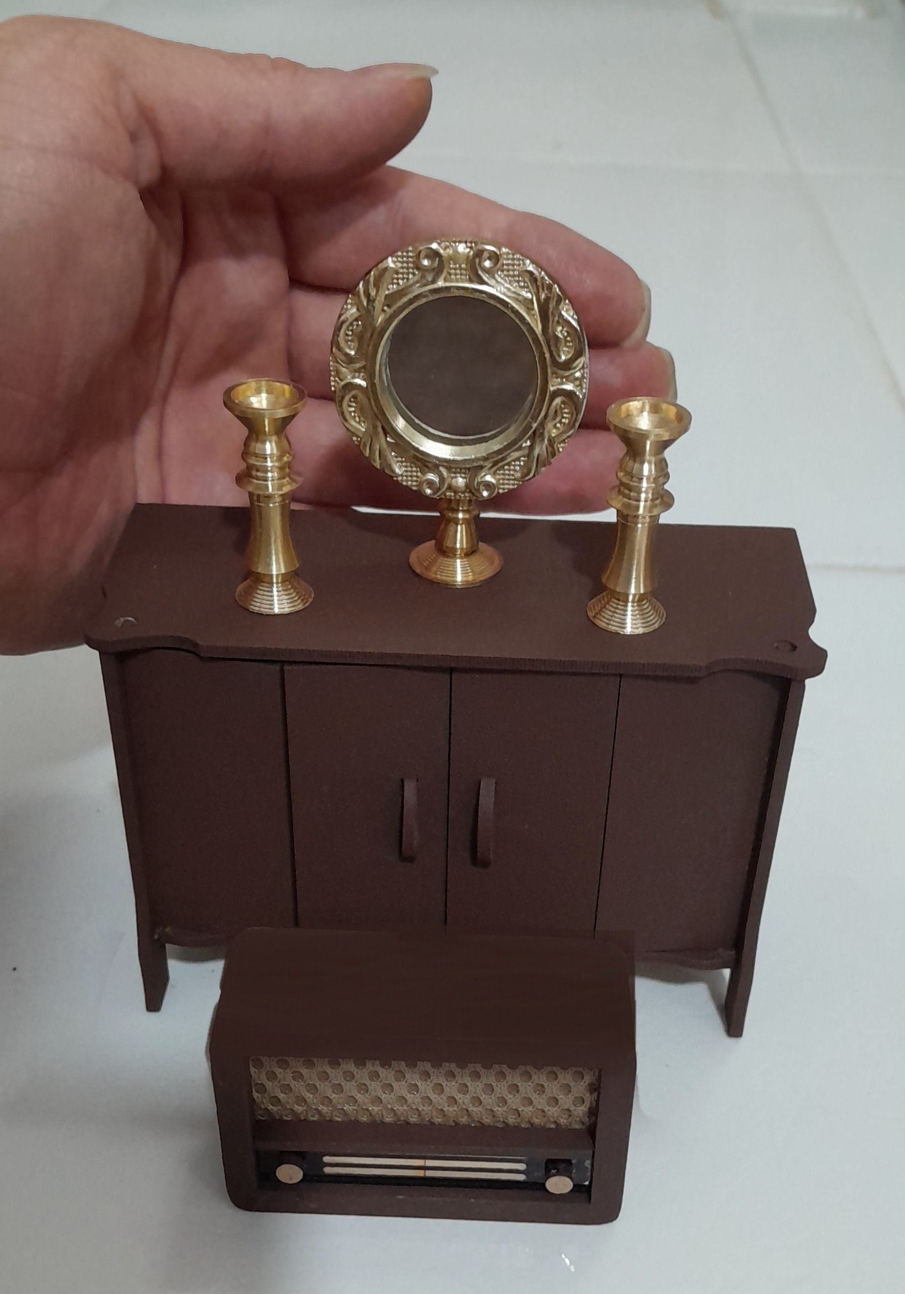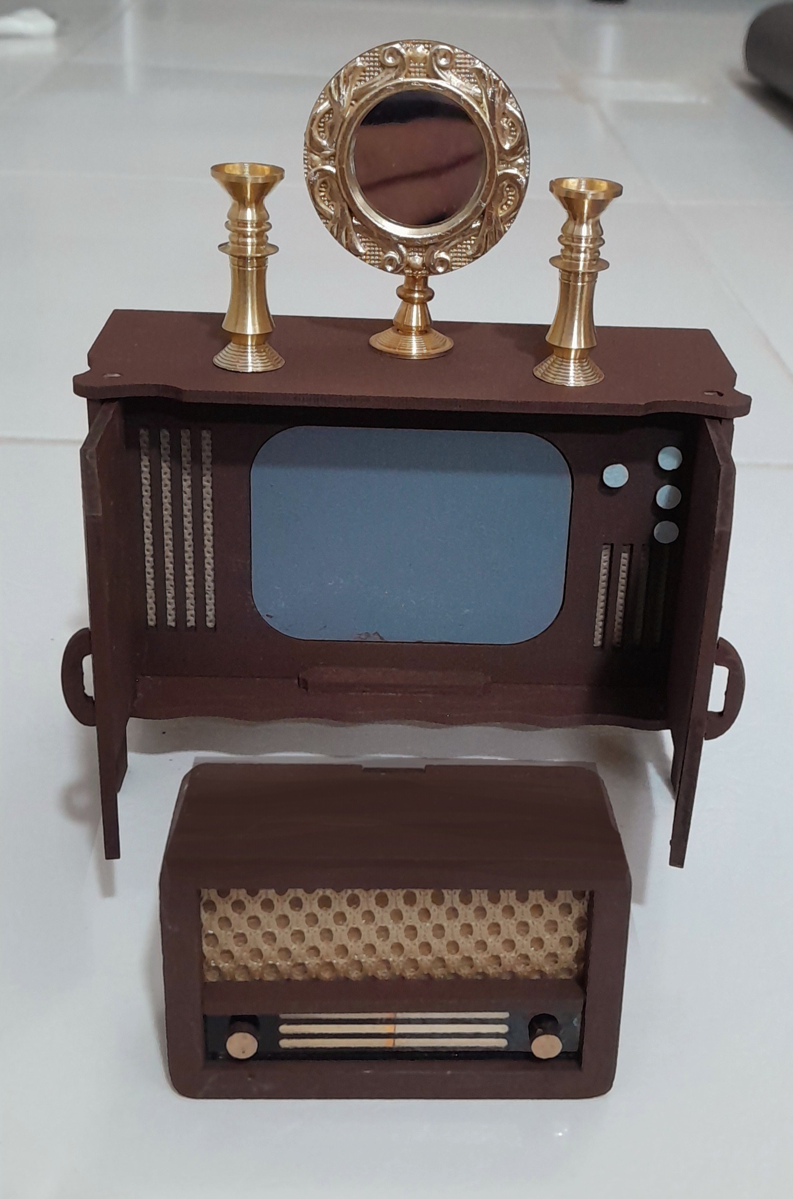 مجموعه دکوری های کوچک شامل آینه شمعدان برنجی و رادیو تلویزیون چوبی درب دار باهم به قیمت فوق.