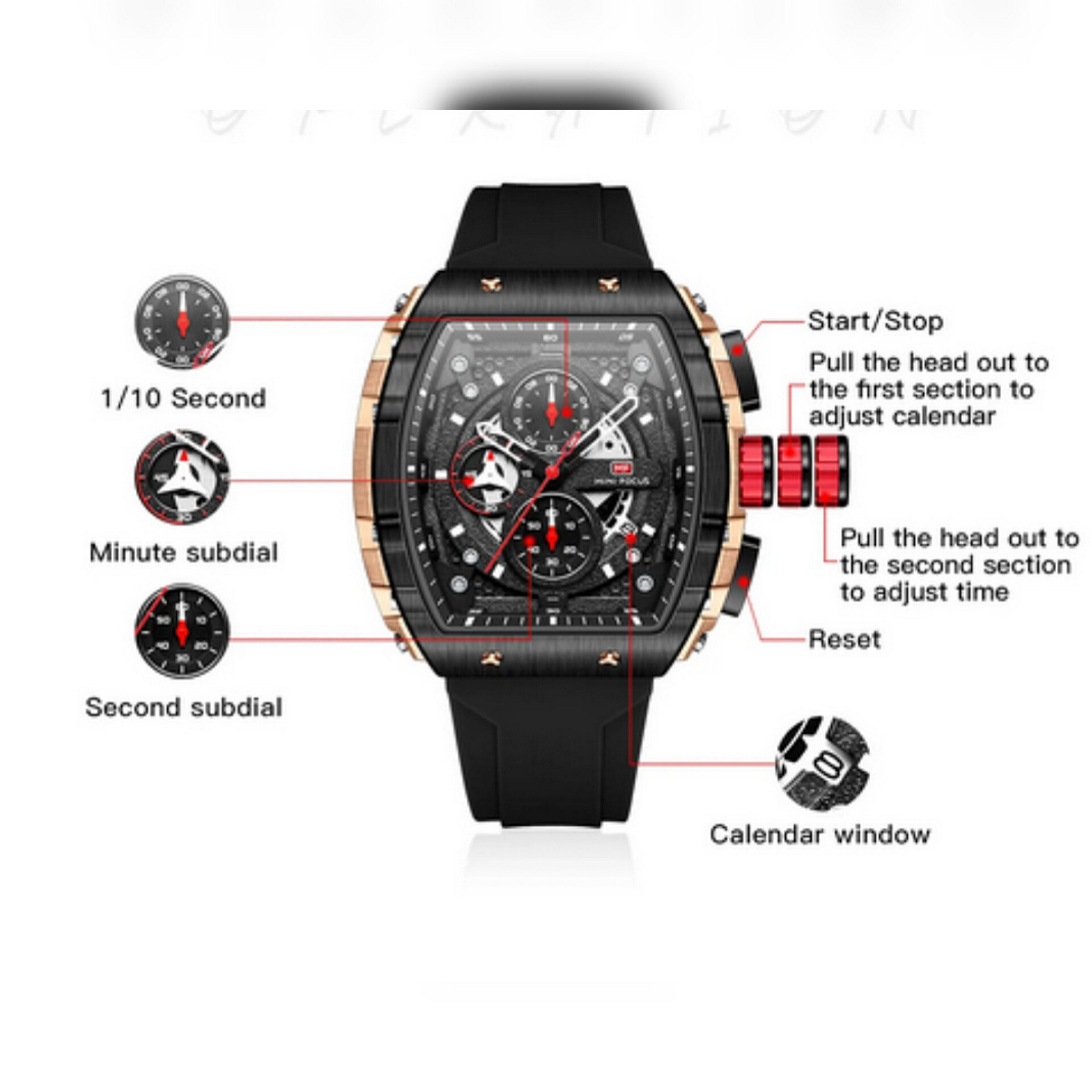 دارای سه موتور قدرتمند کرنوگراف و تقویم روزشمار که تمام عقربه های روی صفحه ساعت فعال هستند