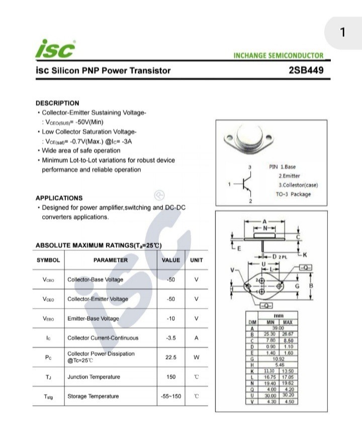 ترانزیستور قابلمه ای 50V/3.5A 22W 2SB449 اوریجینال