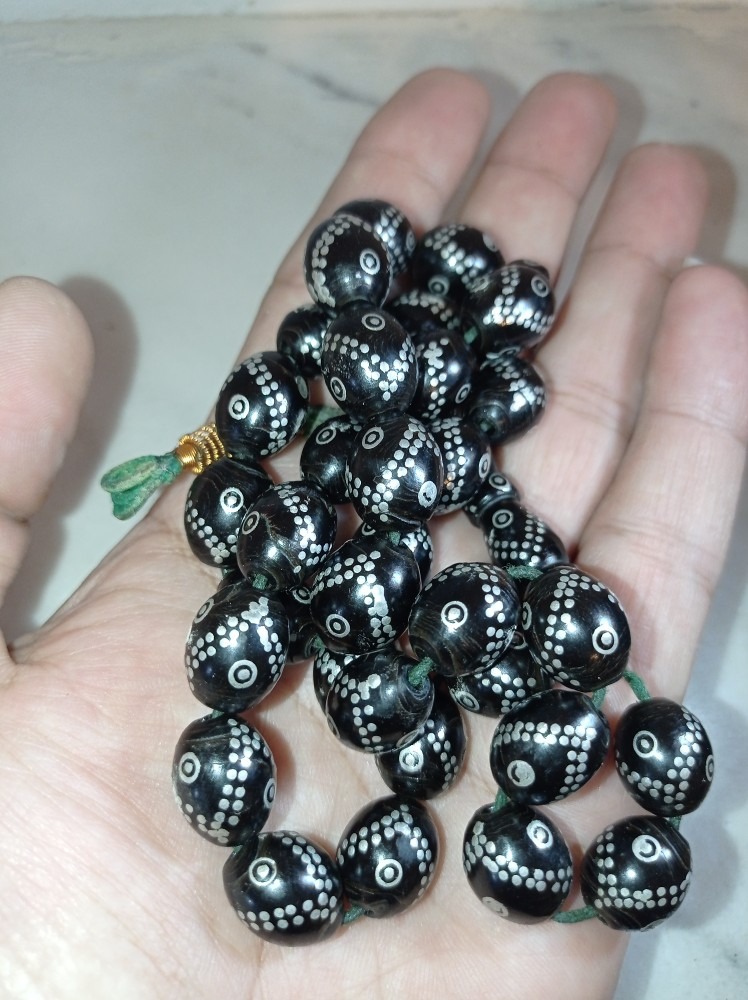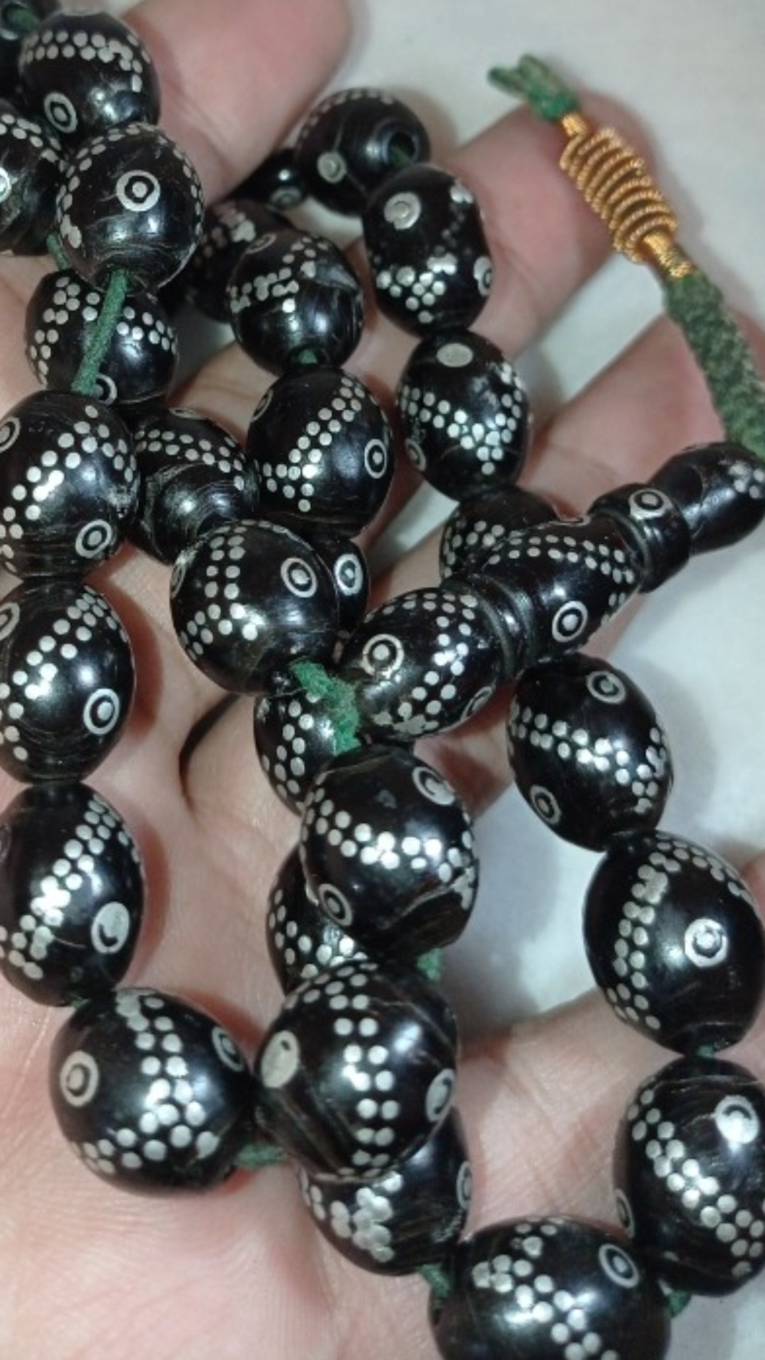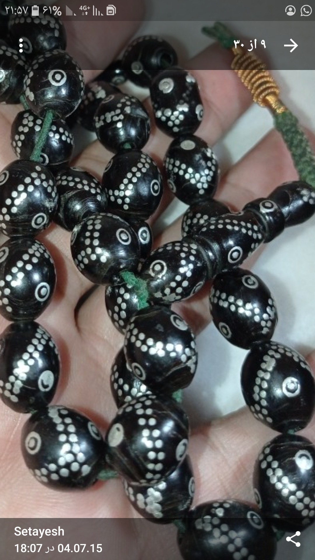تسبیح یسر حجازنقره کوب کهنه از زمان پهلوی هستش ک دست خودمون بوده مال پدر بزرگم بود 69گرم وزنشه بسیار ر فقط یدونه کم داره ک میشه از شایخک بزرگ جداکرد اضافه کنیم