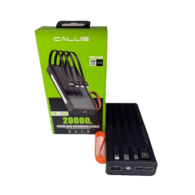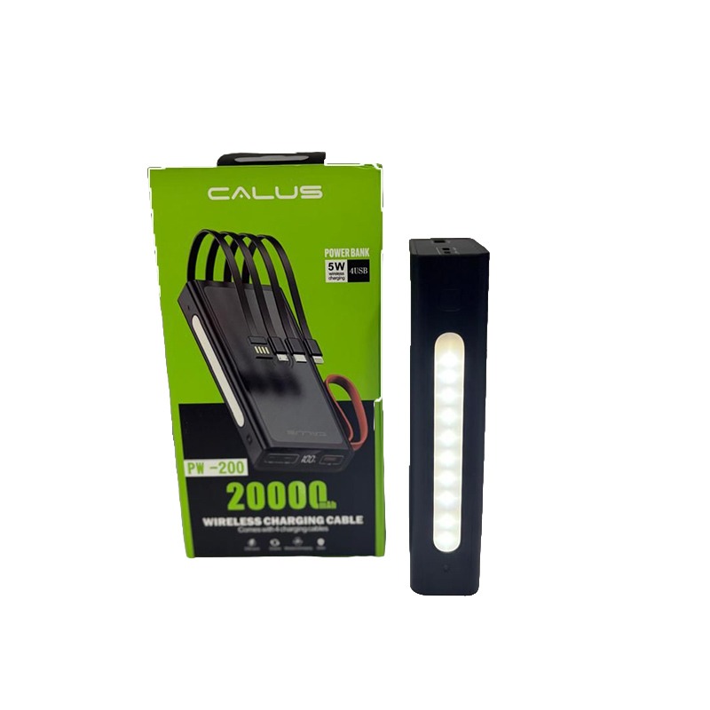 پاوربانک Calus مدل PW200 یک پاوربانک قدرتمند با ظرفیت 20000 میلی آمپر ساعت است که از فناوری شارژ سریع  پشتیبانی میکند و دارای نشانگر LED برای نشان دادن درصد شارژ، چراغ قوه با نور با کیفیت و یک بند برای اتصال به کوله است. این محصول معمولاً دارای دو پورت USB و یک کابل تایپ سی برای شارژ است.
