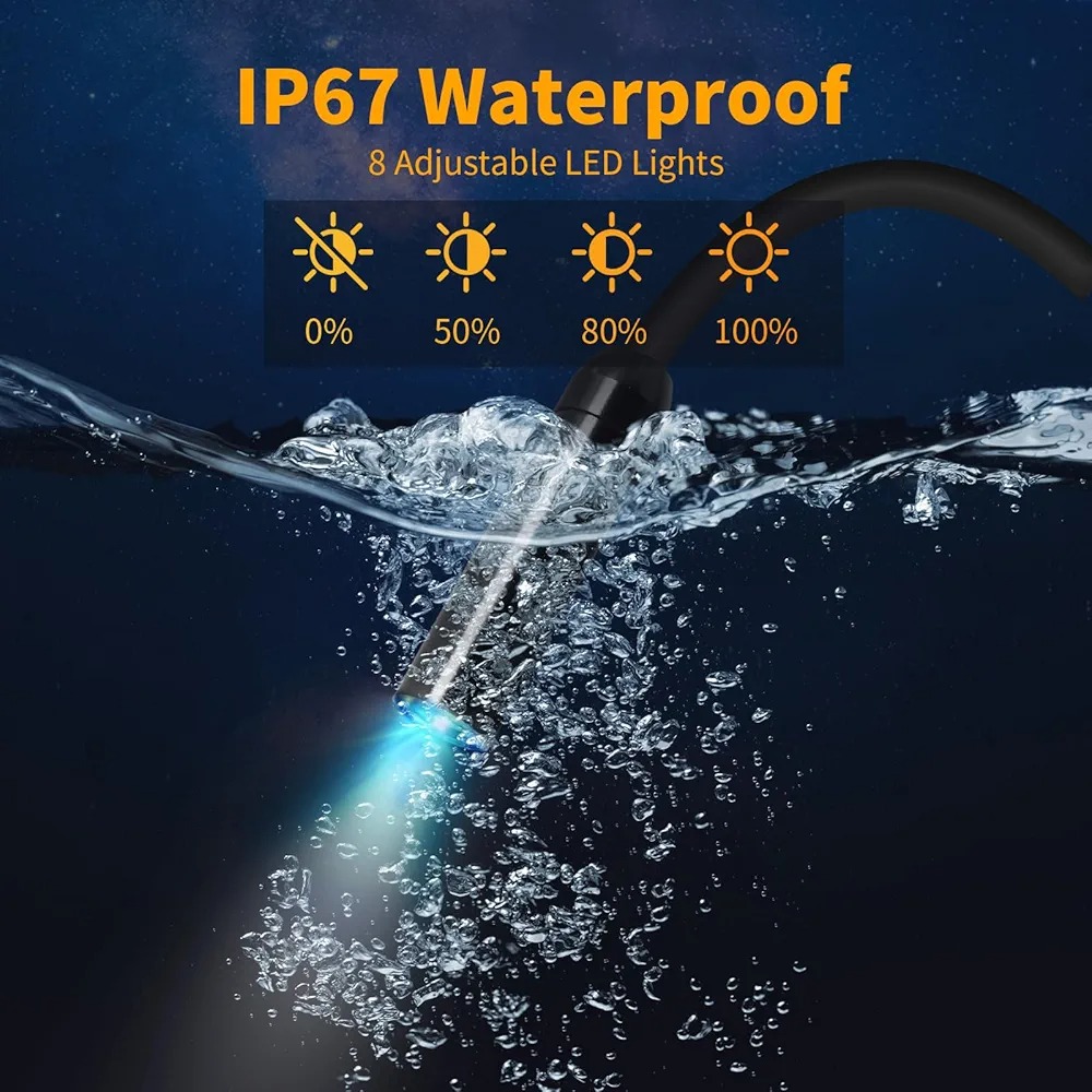 ضد آب با استاندارد IP67 این آندوسکوپ مجهز به یک دوربین ضد آب با استاندارد IP67 و 8 چراغ LED است که به شما امکان میدهد به راحتی در زیر آب و در محیطهای تاریک کار کنید.