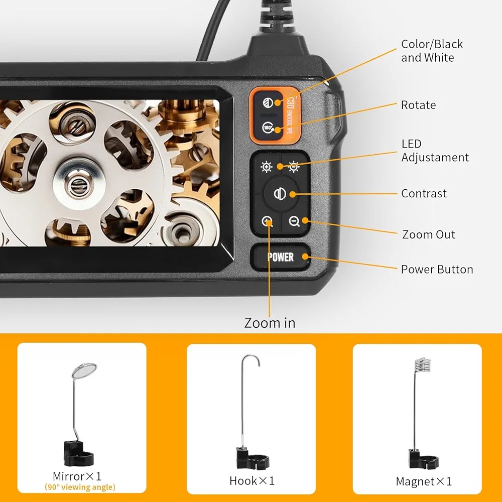 کاربرد گسترده این آندوسکوپ صنعتی میتواند به طور گسترده در بازرسی خودرو، تعمیر خانه، تعمیر لوله و غیره مورد استفاده قرار گیرد. همچنین دارای 3 ابزار مفید است: آهنربا، قلاب و آینه بغل. آنها میتوانند به ترتیب در جذب، قلاب کردن و مشاهده از پهلو به شما کمک کنند.