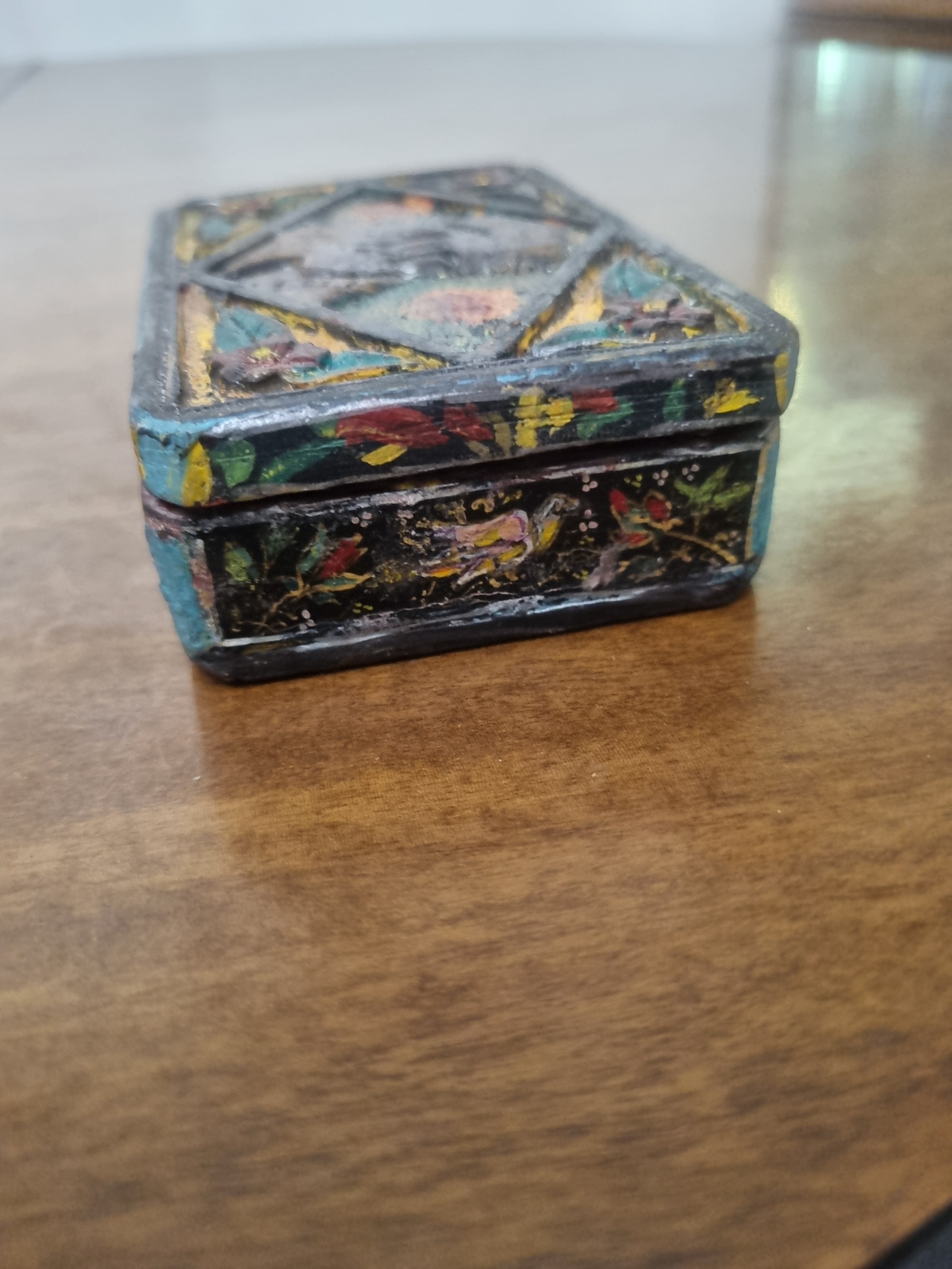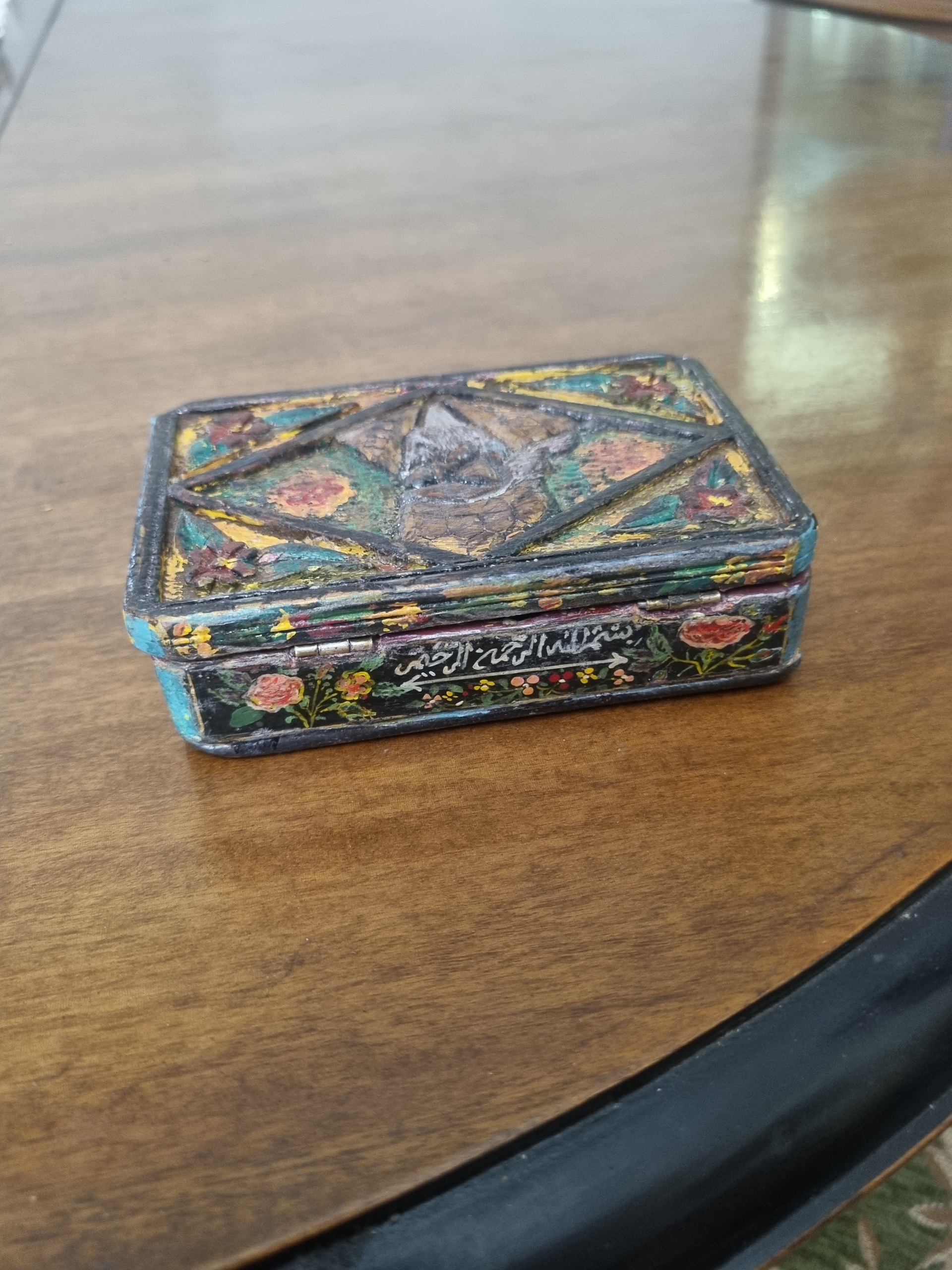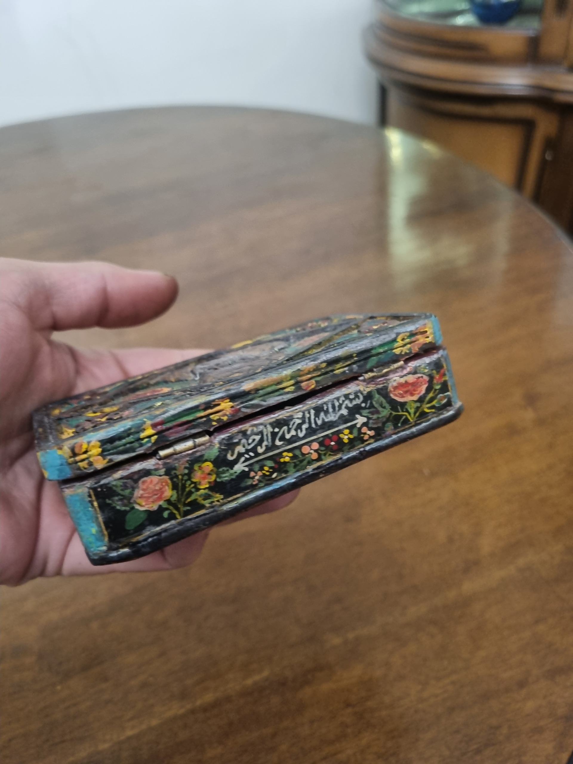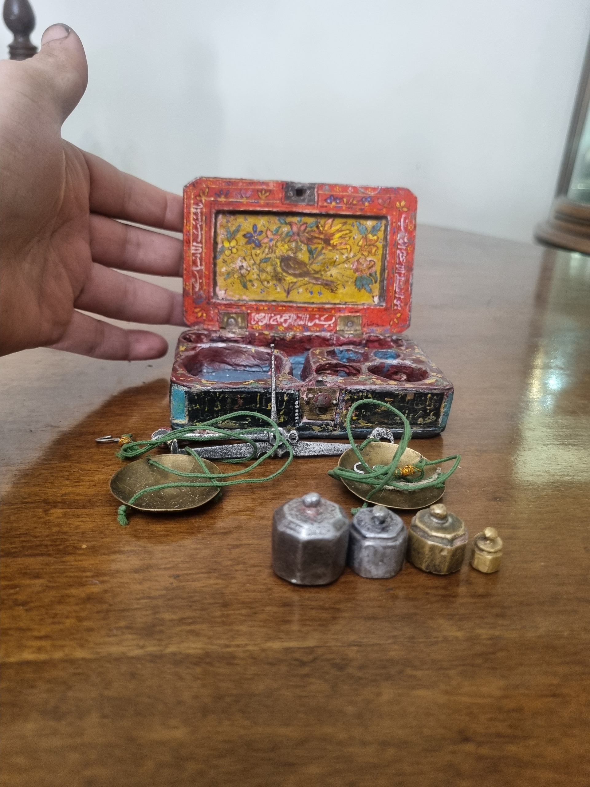 جعبه ترازوی ده سانتی نقاشی قاجاری دو سنگ فولادی و قلمزنی شده و دو سنگ برنجی تراشدار