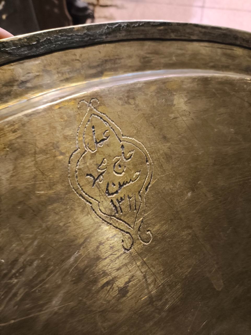 شاهکار قلم زنی و کار کمیاب. سینی برنجی پهلوی. تمام قلم دست. سایز بزرگ. مهردار. و کاملا سالم و استثنایی و بی نظیر. یک ردیف شعر و یک ردیف صلوات. قطر 83.