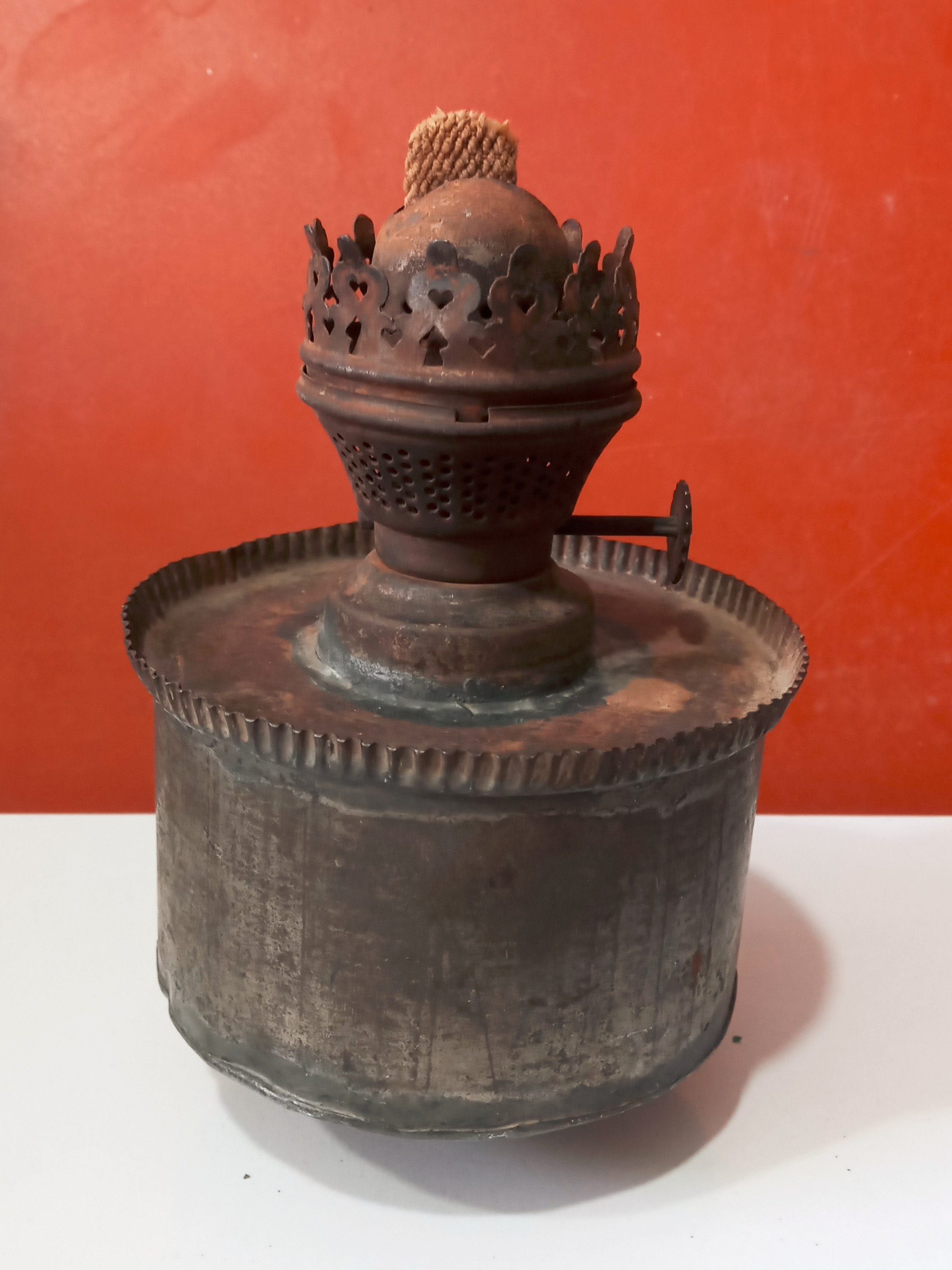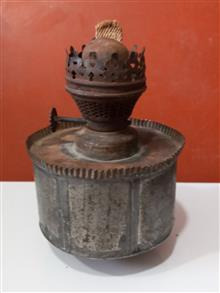 کیفیت مطابق تصویر .این چراغ قدمتش حدود 80 ساله و کاملا دستسازه .جنس بدنه فلز سیمکوب و موتورشم اهنه در زیر مخزن یک قسمت لوله مانند داره که احتمالا روی چیزی قرار میگرفته .سالم و قابل استفاده البته بدلیل قدمت دارای زنگار است که. احت تمیز میشه سایز ارتفاع 13 و قطر مخزن 9 سانته .در عین حال کاری خاص و کمیابه
