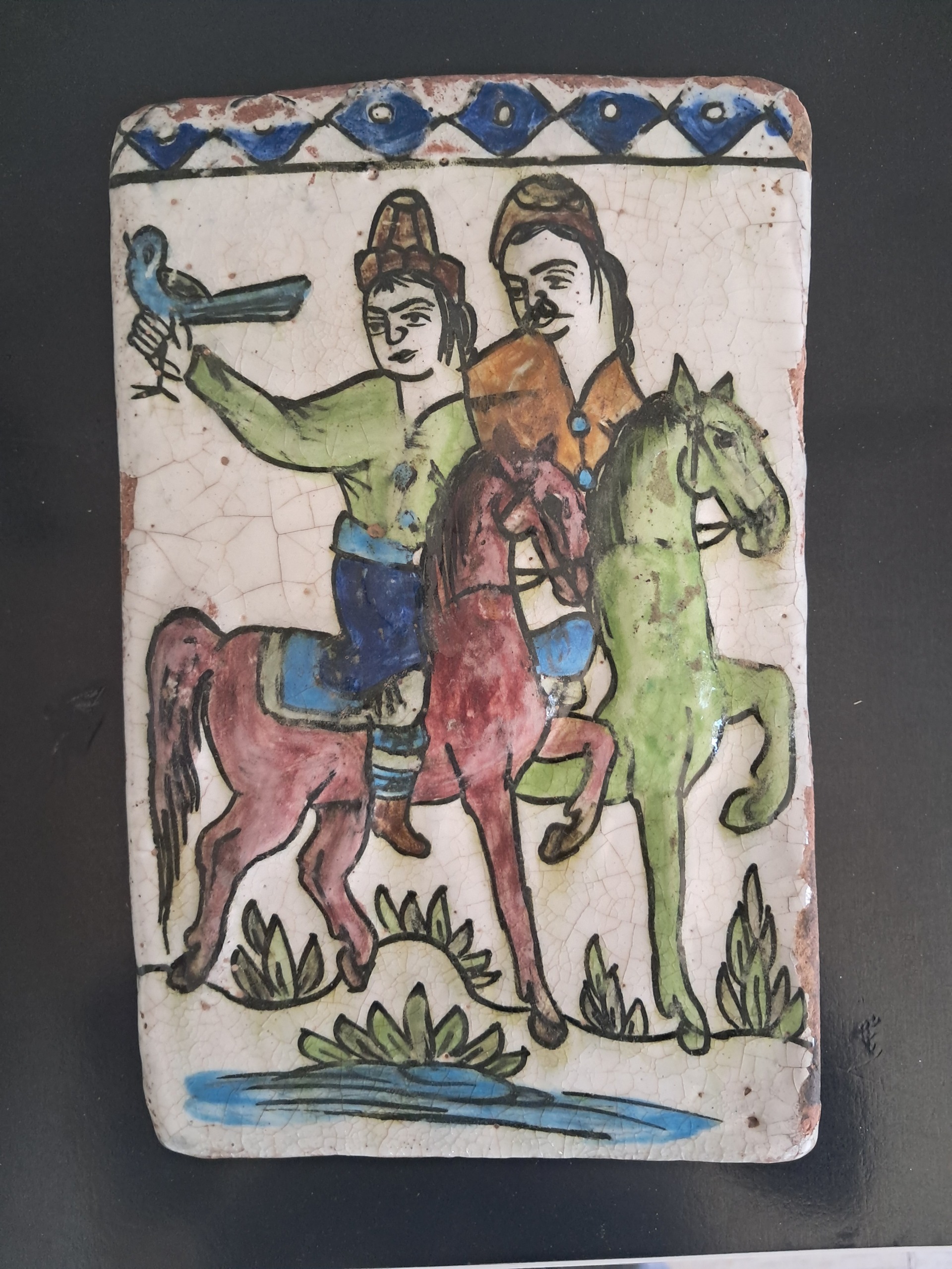 کاشی کهنه و قدیمی. 15 در 25 با طرح لیلی و مجنون. متعلق به دوره صفوی. کمیاب و کلکسیونی. سالم