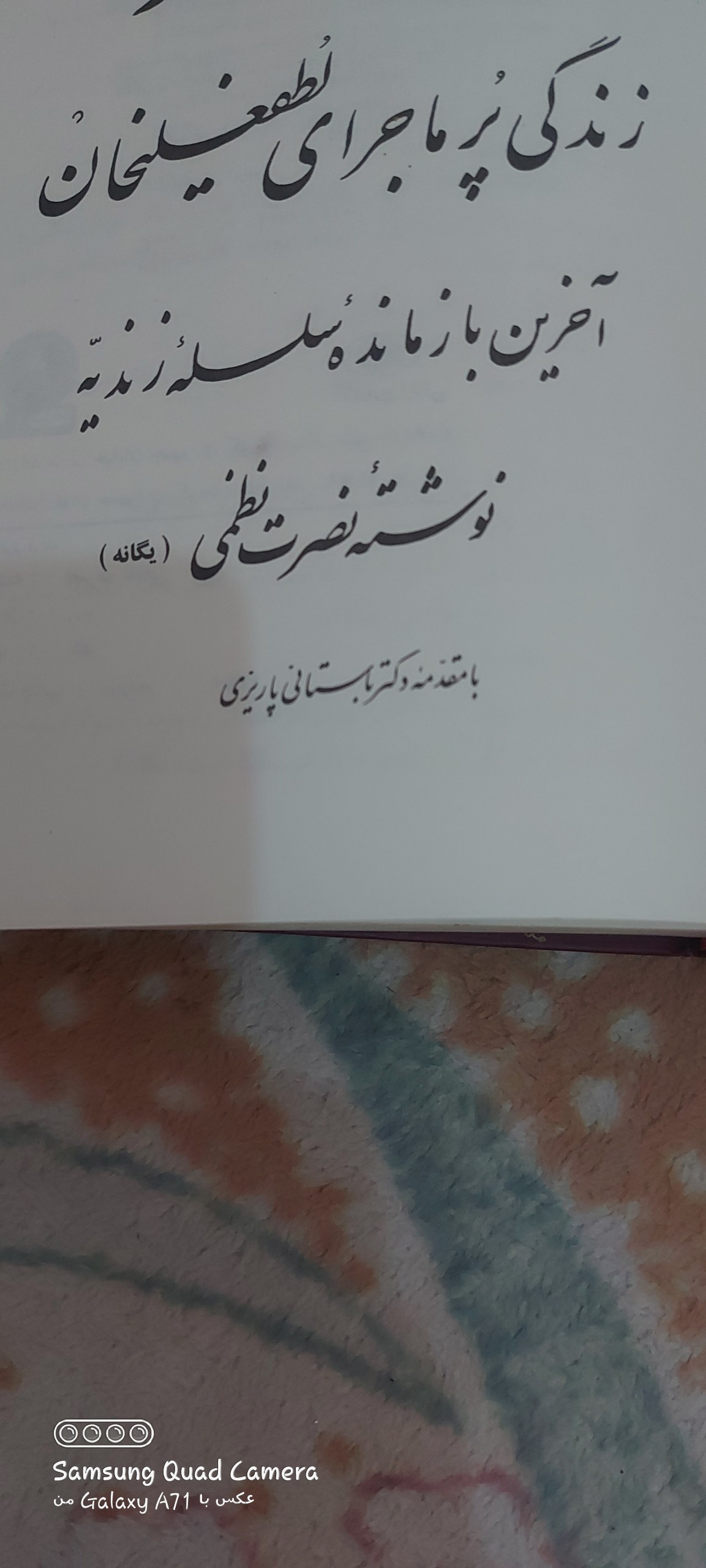 دراین کتاب قسمتهایی از زندگی پراز ماجرای لطفعلیخان آخرین بازمانده زندیه را توضیح میدهد وکتاب درحدود نگهداری شده