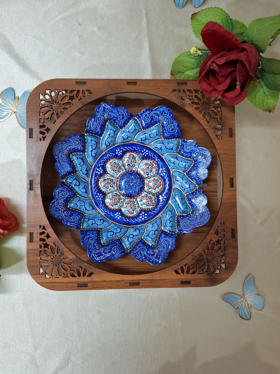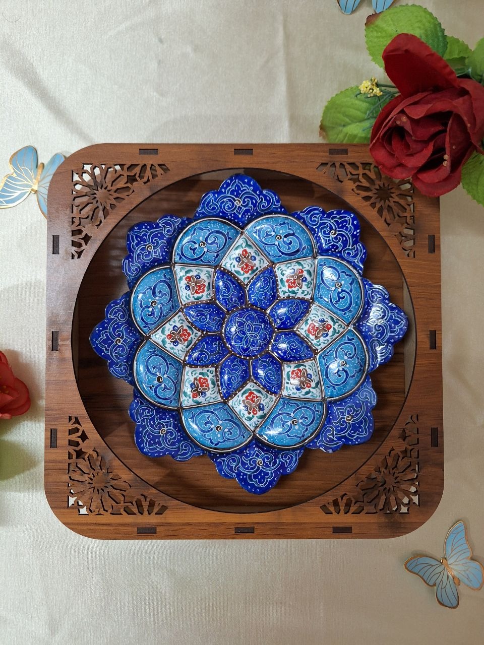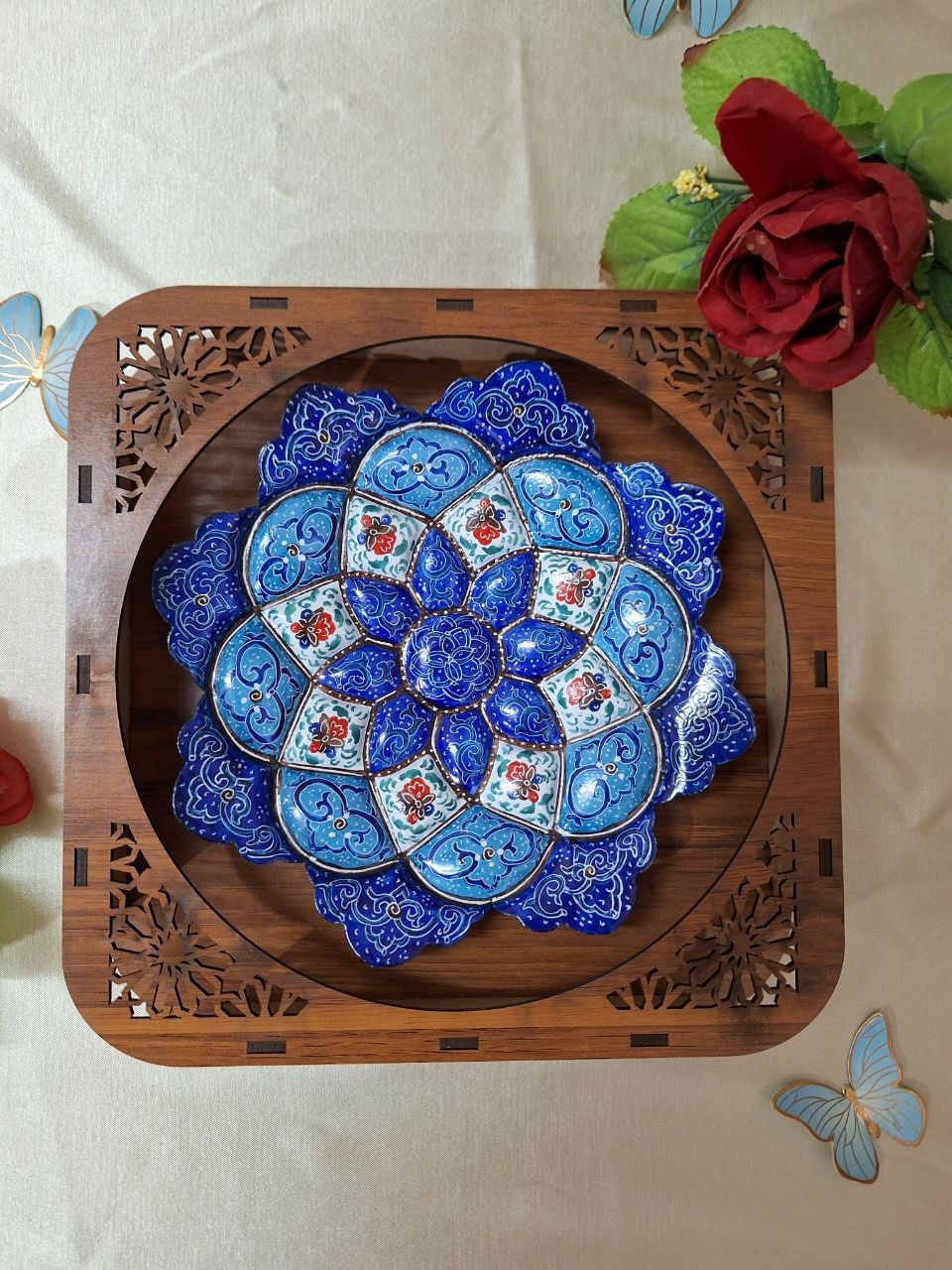 بشقاب میناکاری از جنس مس مناسب هدیه جهاز و تزیین منزل