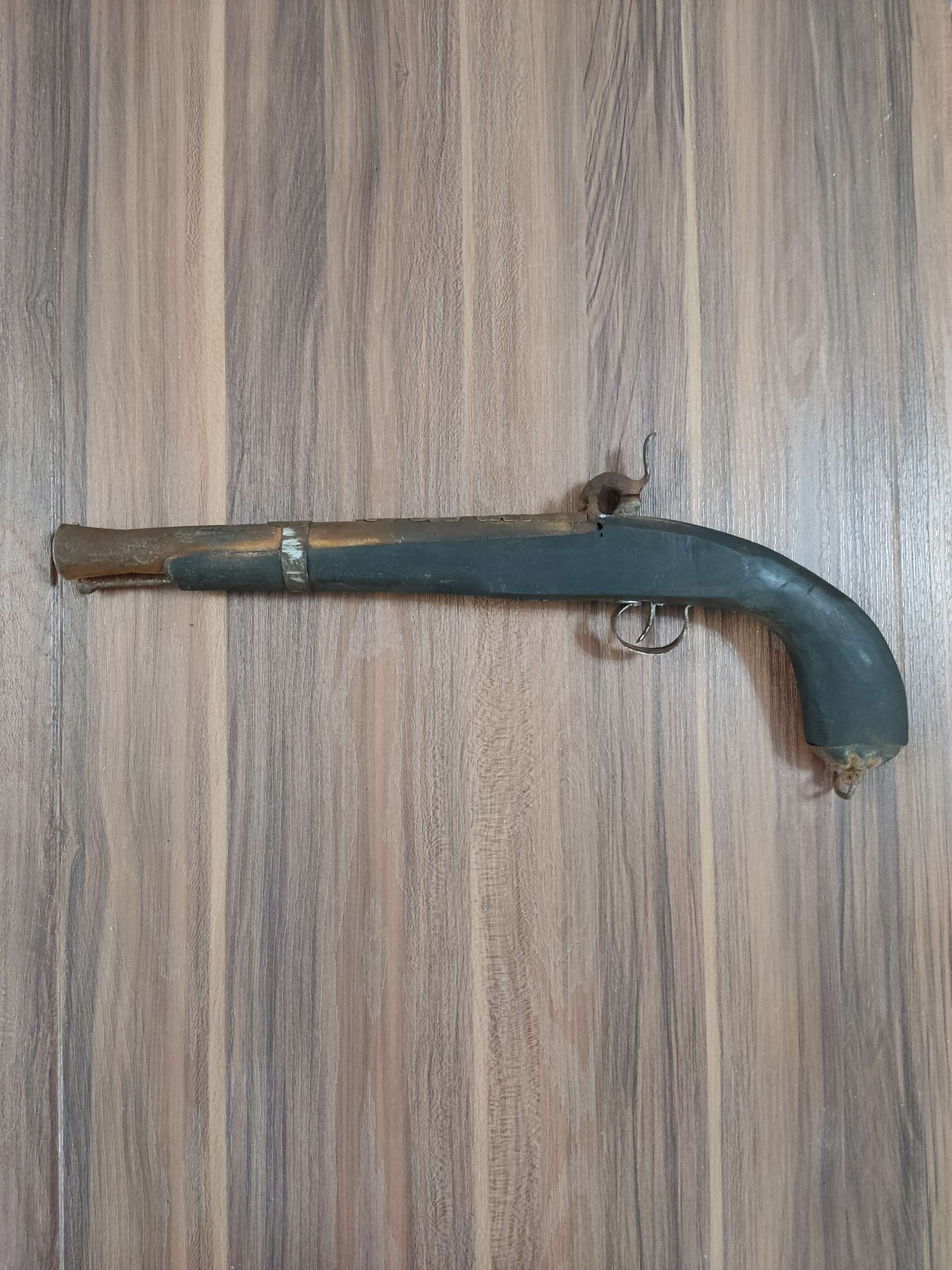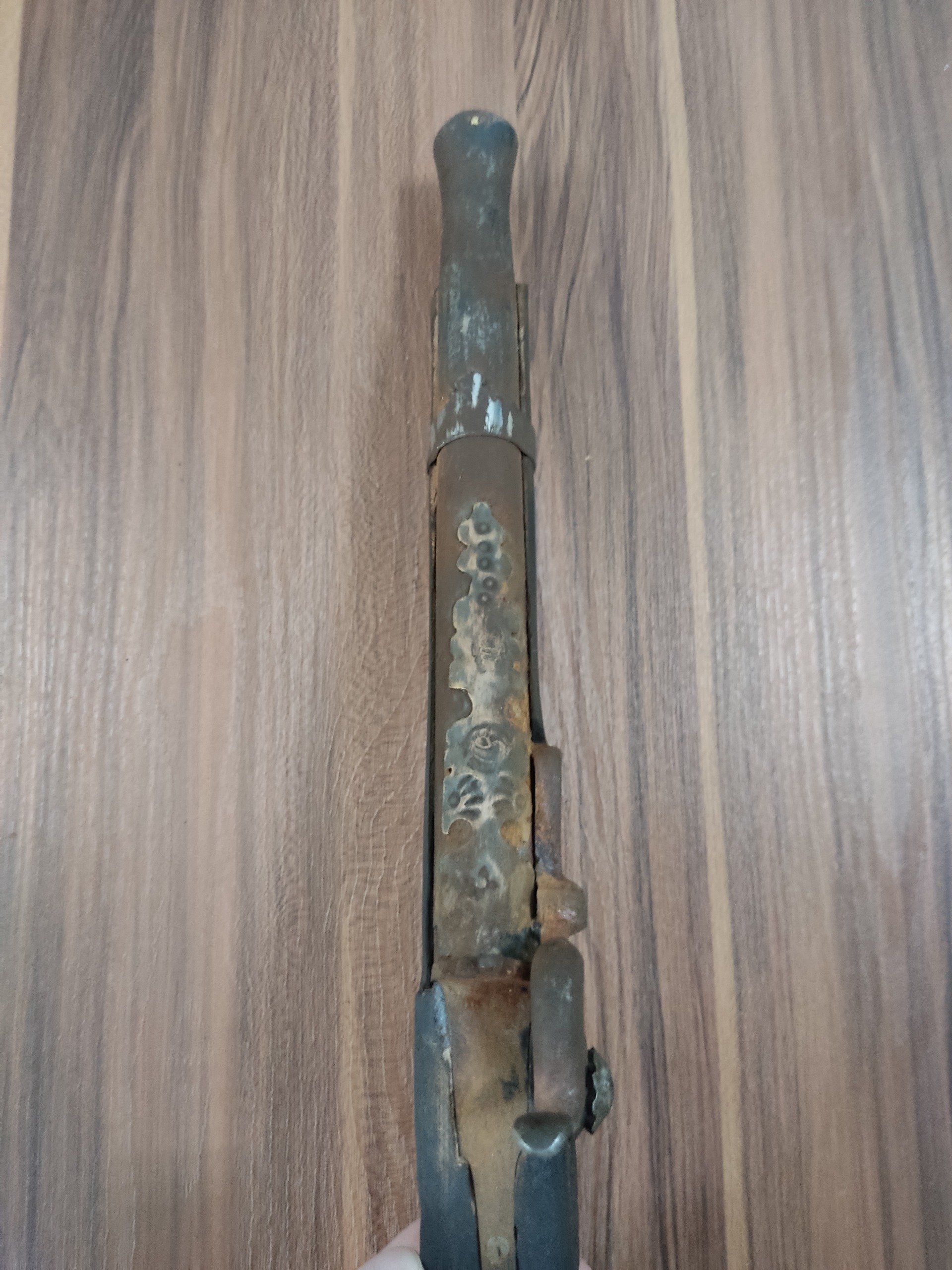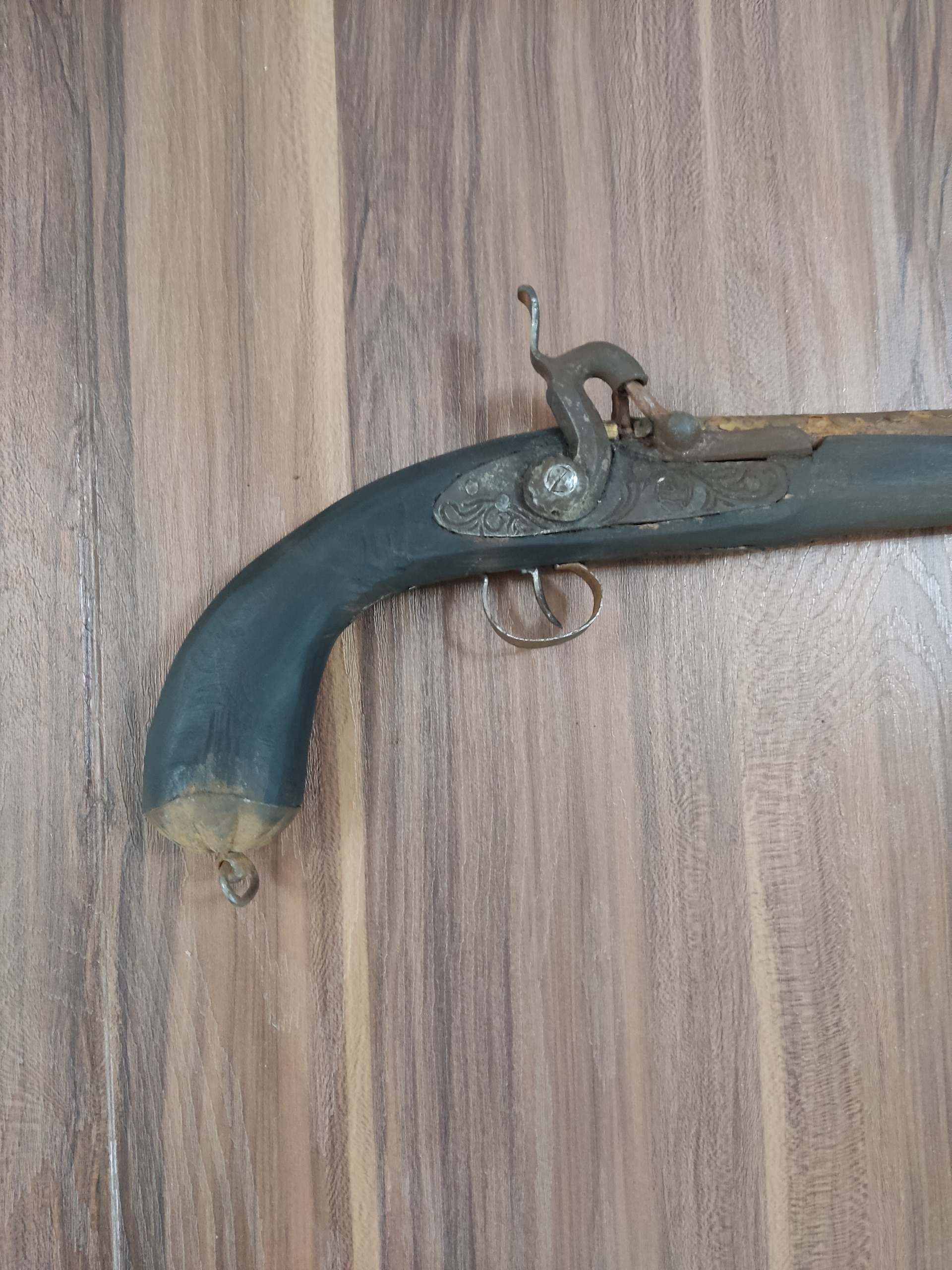 تپانچه دکوری و کلکسیونی ساخته شده از فولاد و چوب دارای نقش بر روی لوله و بدنه چخماق و ماشه کار میکند به طول 47 سانتیمتر سمبه ای طرح قاجار و جدید می باشد خواهشمندم از دیگر کالاهای اینجانب دیدن فرمایید.