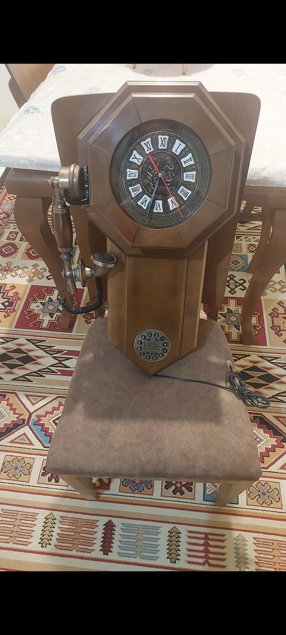 تلفن ساعت سلطنتی چوبی دیواری کاملن صحیح سالم هم ساعت هم تلفن در حال کار کردن هستش بدون هیچ گونه ایرادی یه کار زیبا و جالب هستش حدود57 سانت ارتفاعش وحدود35 سانت عرض کار هستش کالا دقیقن مطابق عکسهای اگهی هستش