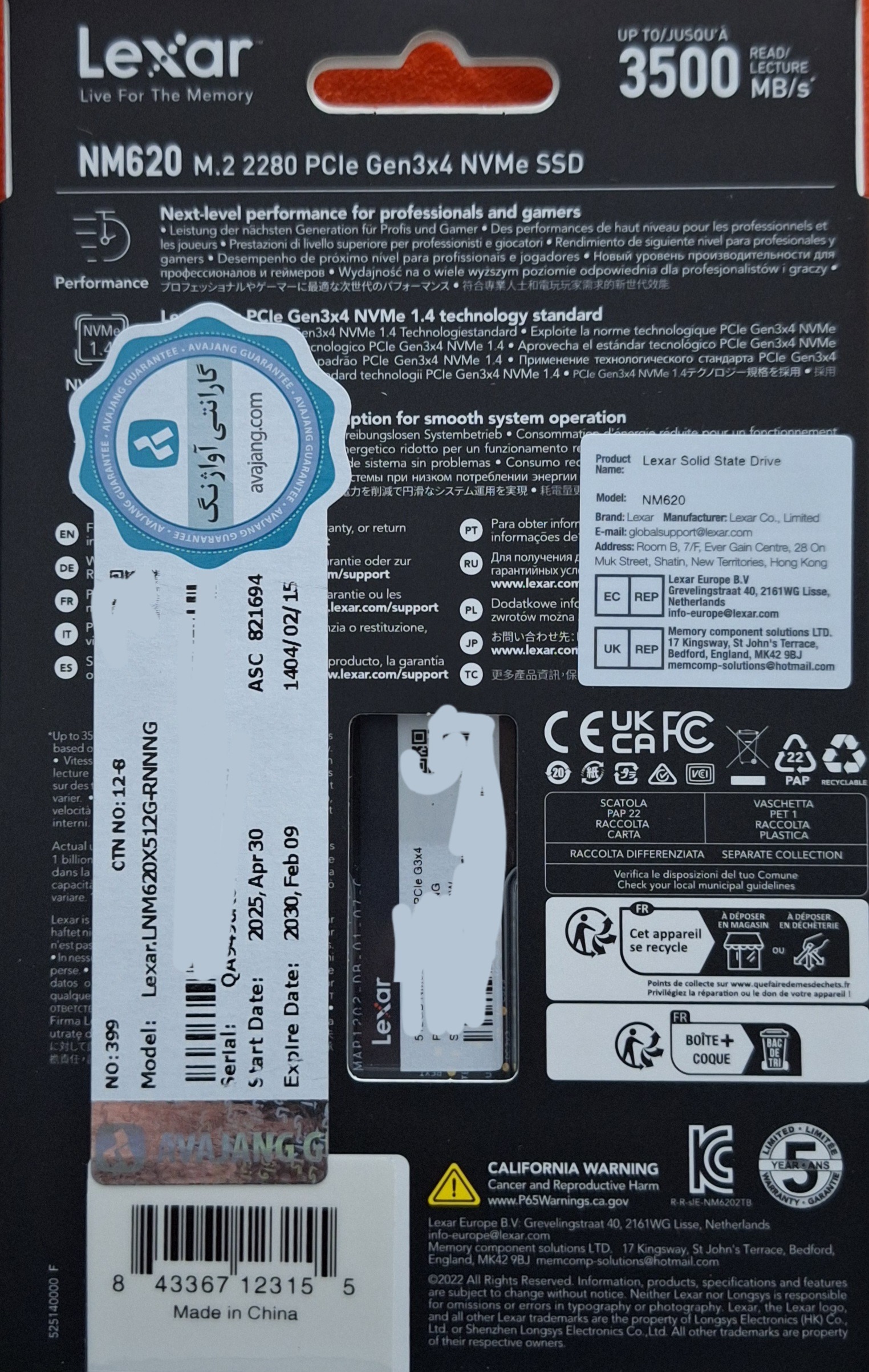 حافظه SSD لکسار مدل NM620 M.2 2280 NVMe یک حافظه SSD داخلی با سرعت بالا است که برای کامپیوترهای شخصی و لپ تاپهای مدرن طراحی شده است. این حافظه از رابط PCIe Gen3x4 استفاده میکند و سرعت خواندن و نوشتن ترتیبی تا 3500 و 3000 مگابایت بر ثانیه با طول عمر 1.5میلیون ساعت را ارائه میدهد.