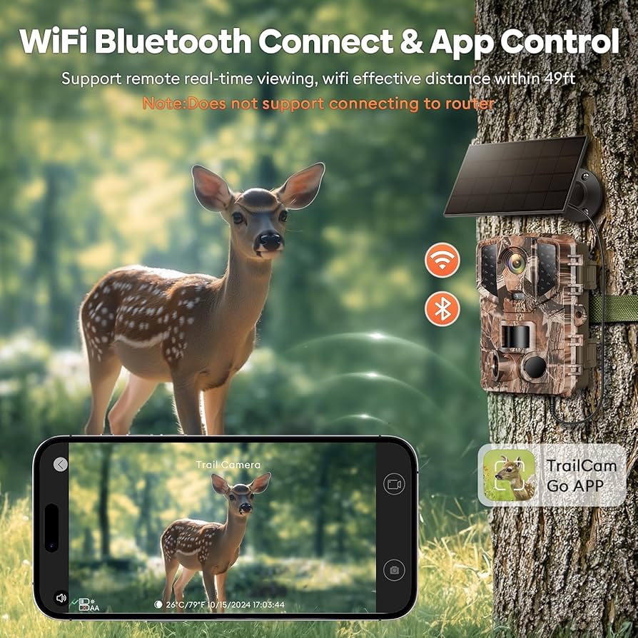 اتصال WiFi و کنترل از طریق برنامه: این دوربین شکاری مجهز به ماژول WiFi و بلوتوث داخلی است که به شما امکان میدهد بدون نیاز به WiFi خانگی به برنامه "TrailCam Go" متصل شوید. این به شما امکان میدهد تا در فاصله 49 فوتی به برنامه دسترسی داشته باشید، ویدیوها