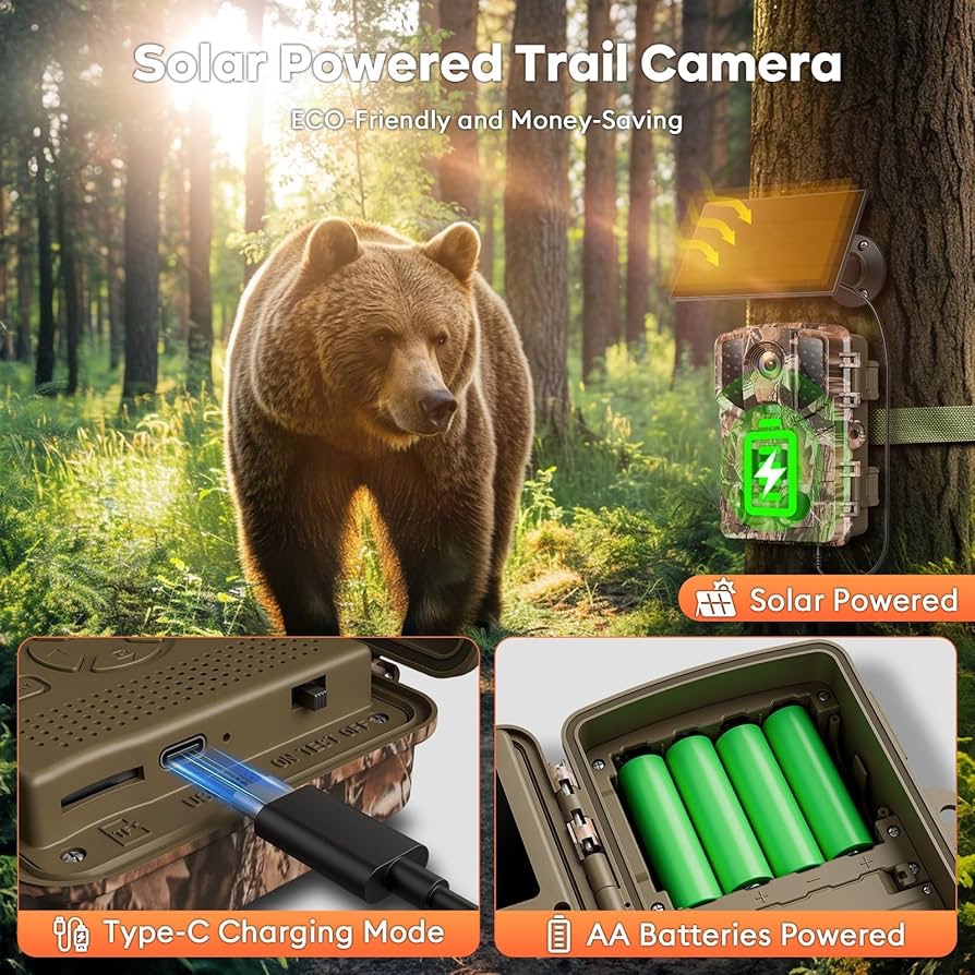 دوربین ترکری با انرژی خورشیدی و قابل شارژ: دوربین حیات وحش Solareye با دید در شب و فعالسازی حرکتی دارای یک باتری داخلی 5000 میلیآمپر ساعتی است که میتواند مستقیماً با کابل داده Type-C شارژ شود. همچنین میتوان آن را به طور مداوم با پنل خورشیدی قابل حمل همراه آن تغذیه کرد. افزایش زمان آماده به کار در فضای باز. باتری قلمی پشتیبان اضافی، منبع تغذیه دوم را برای عمر باتری بسیار طولانی فراهم میکند (باتریهای قلمی شامل نمیشوند).