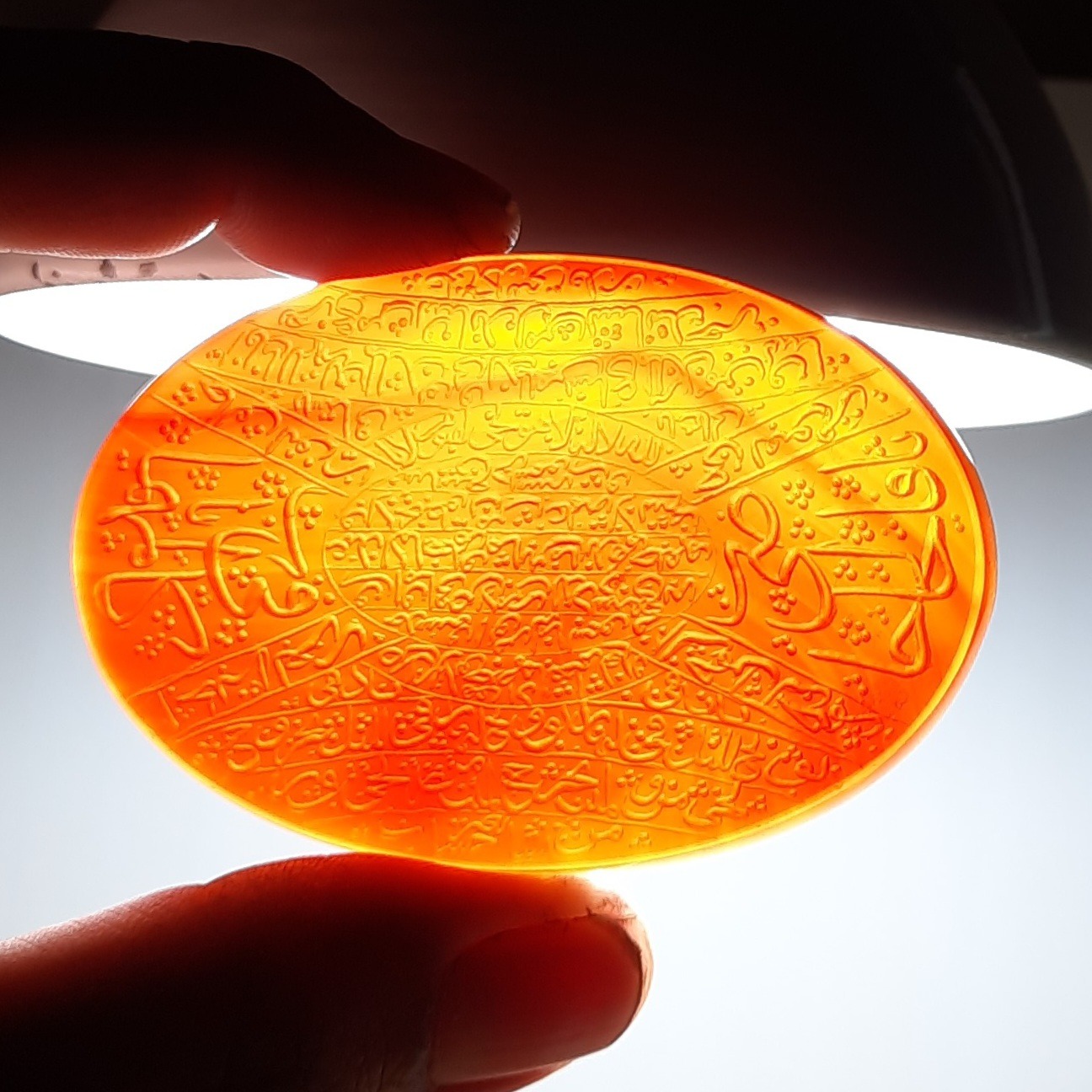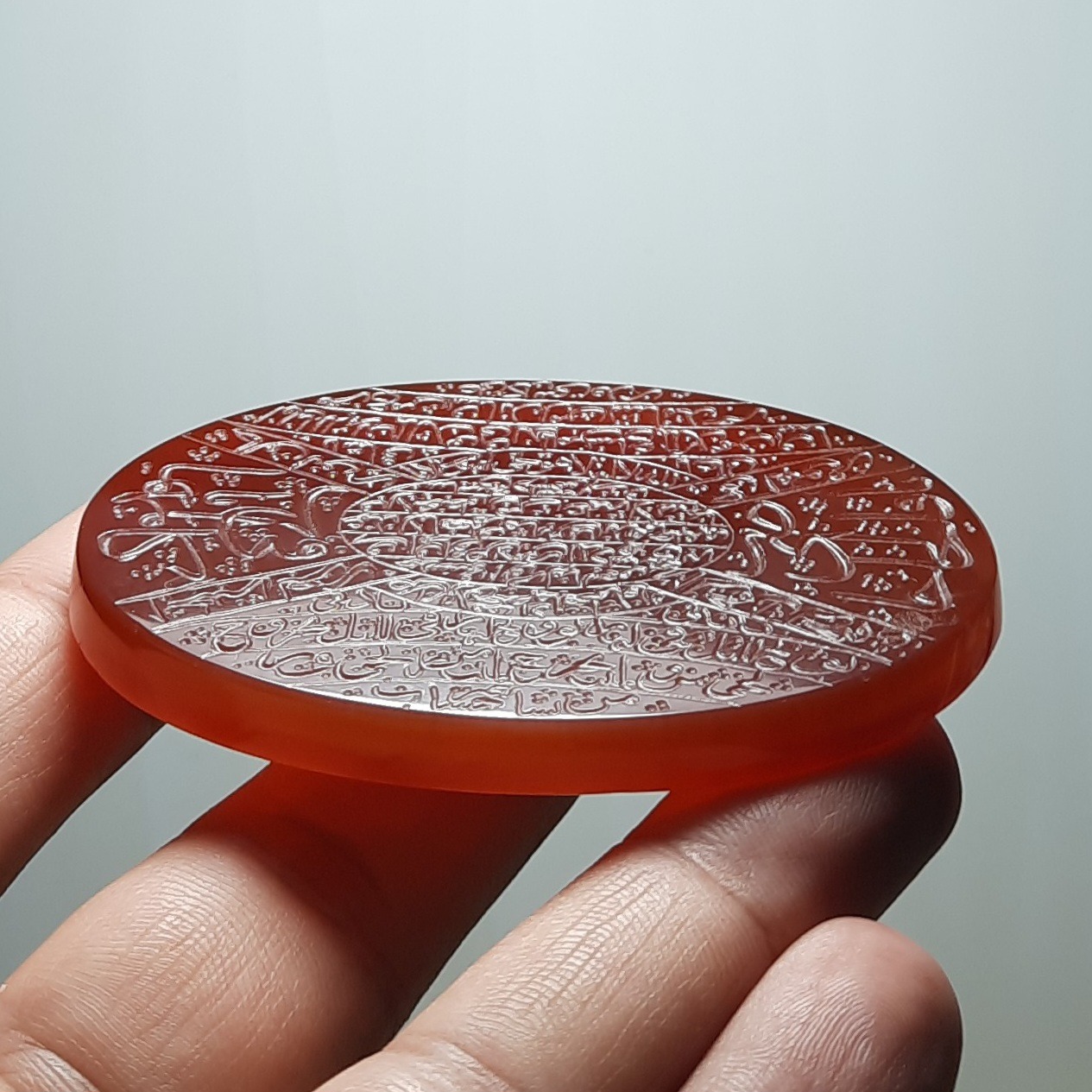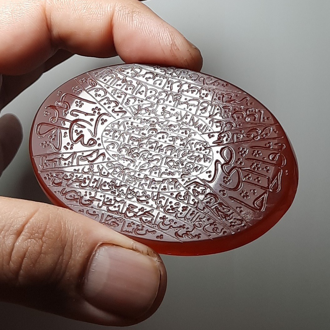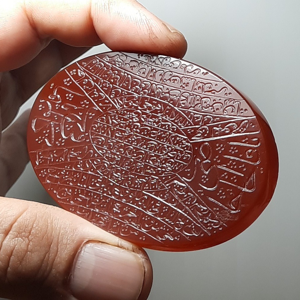 عقیق خطی دارچینی رنگ کلکسیونی غولپیکر 7 سانتی و 50 گرمی اصل معدنی خراسان با حکاکی دستی استادانه امضا دار ( قدیر ) منقش به آیه الکرسی و دعاهای دیگر ، ارزشمند و خاص