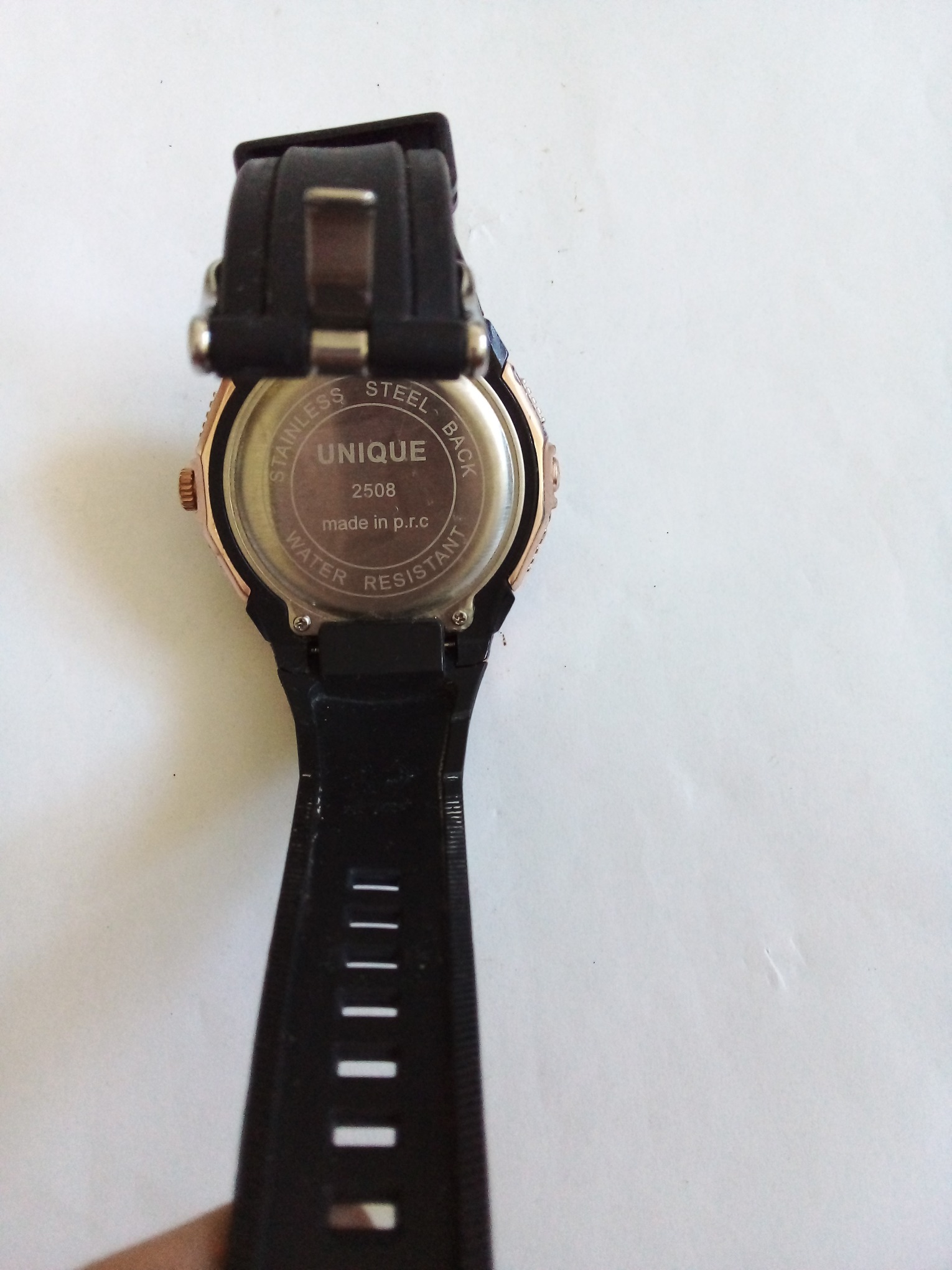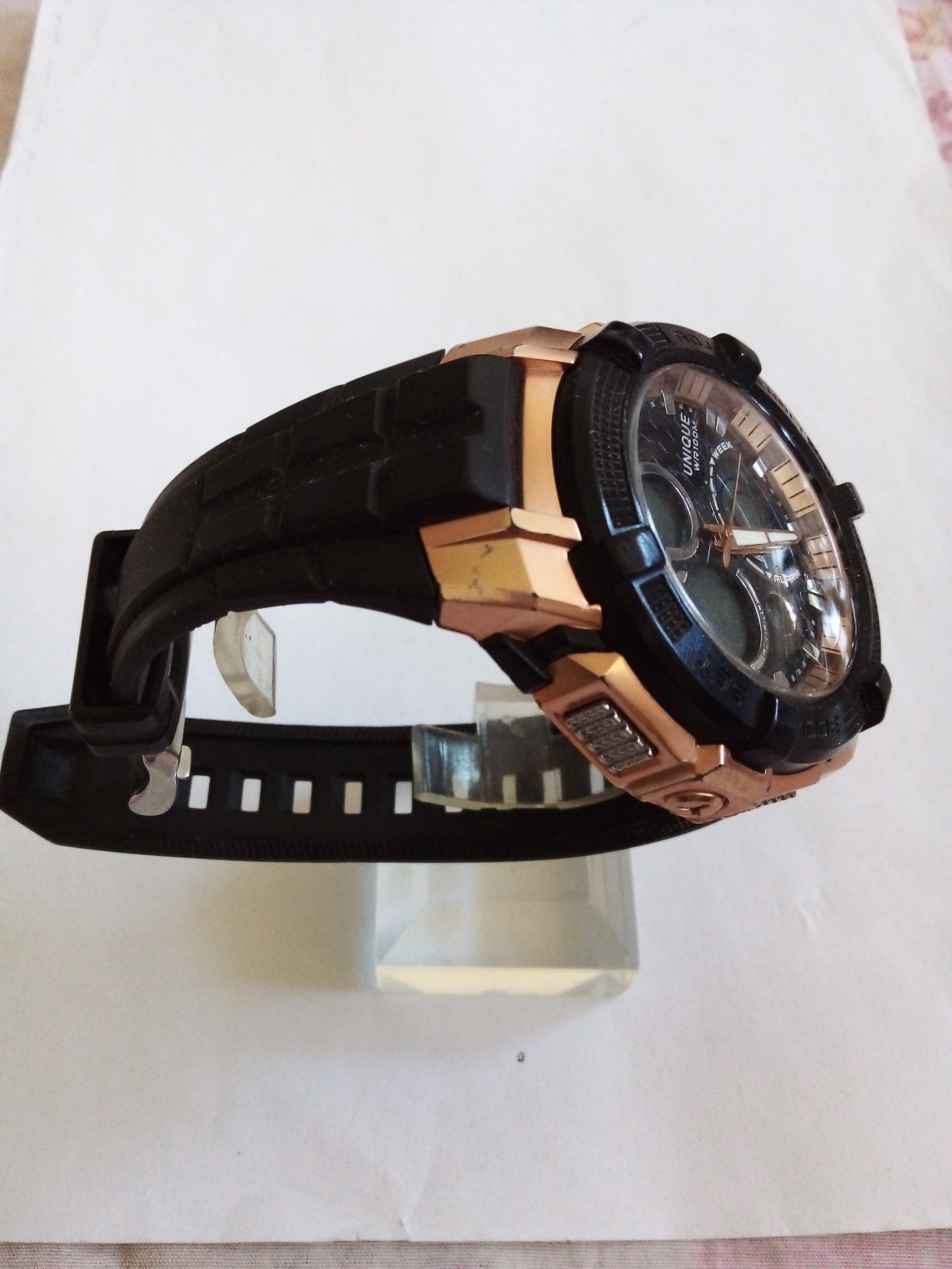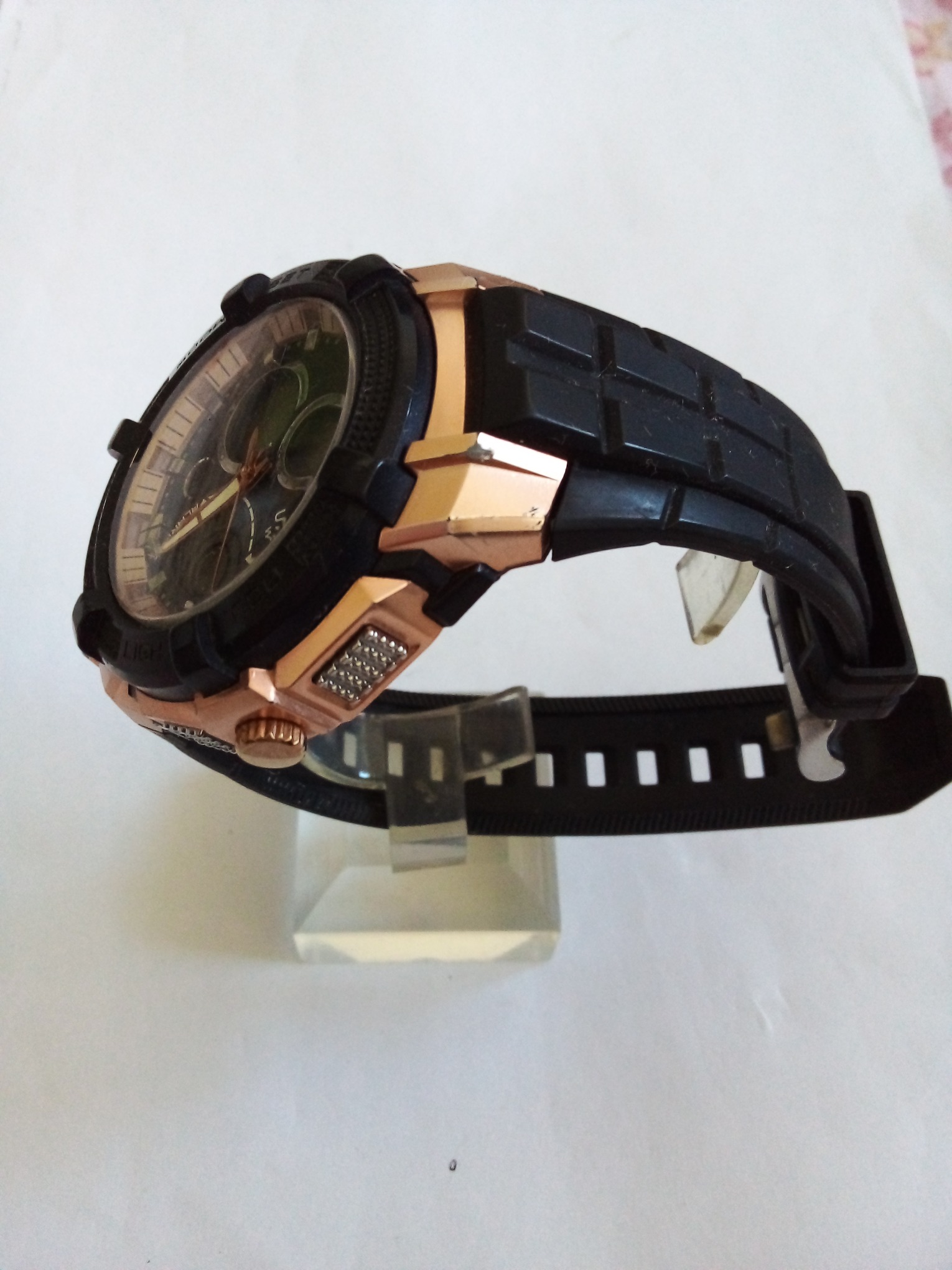 درود وروز بخیر خدمت عزیزان کاربر و سایت محترم ایسام . ساعت مچی پسرانه کوارتز با صفحه نمایش مشکی که یکی از نمایشگرهای اعدادش جدا شده ولی داخل ساعته که تو عکس کاملا معلومه . قاب بدنه دو رنگ مشکی ومسی . پمپ یا شاسی های طرفین سالم هر چهار تا . عزیزان خریدار