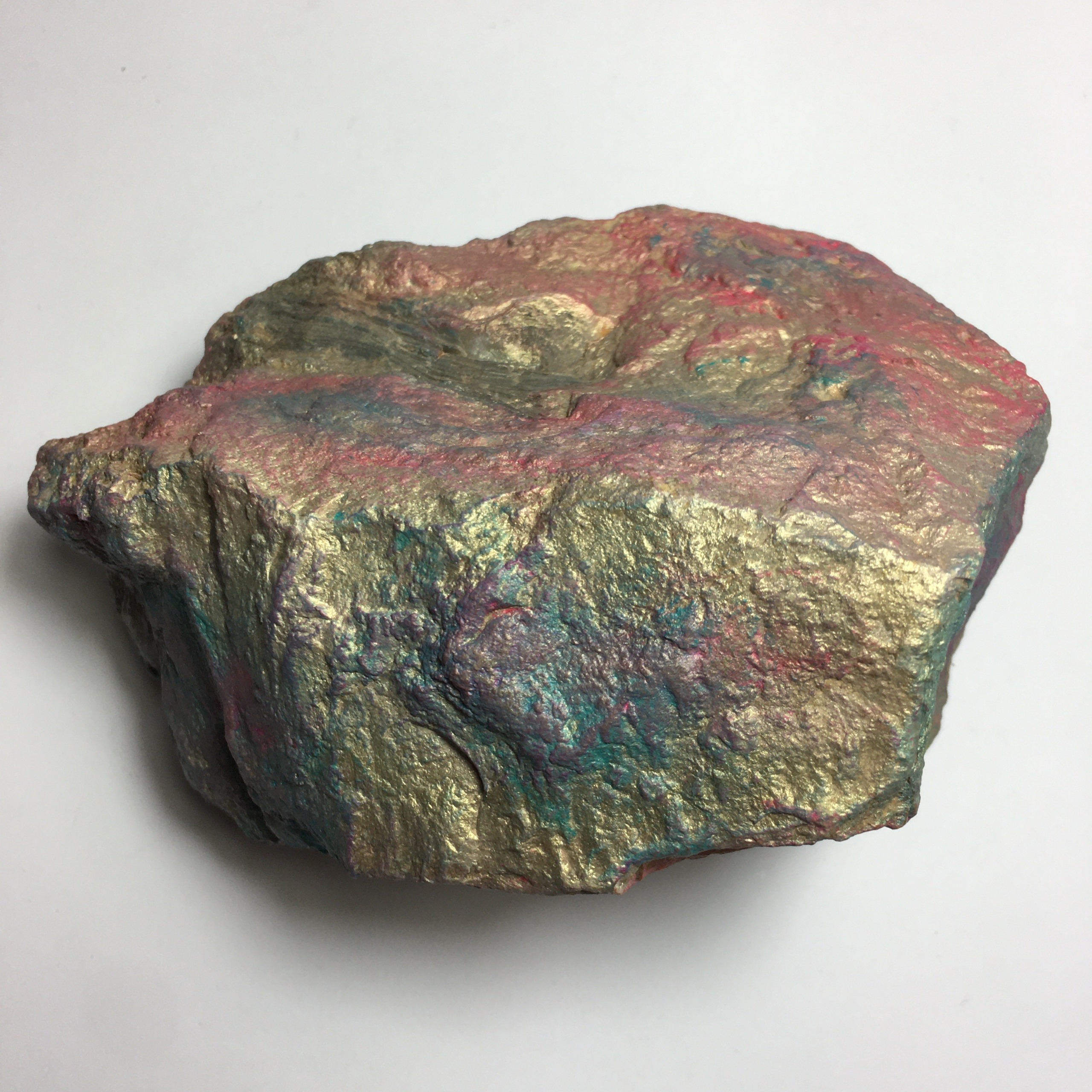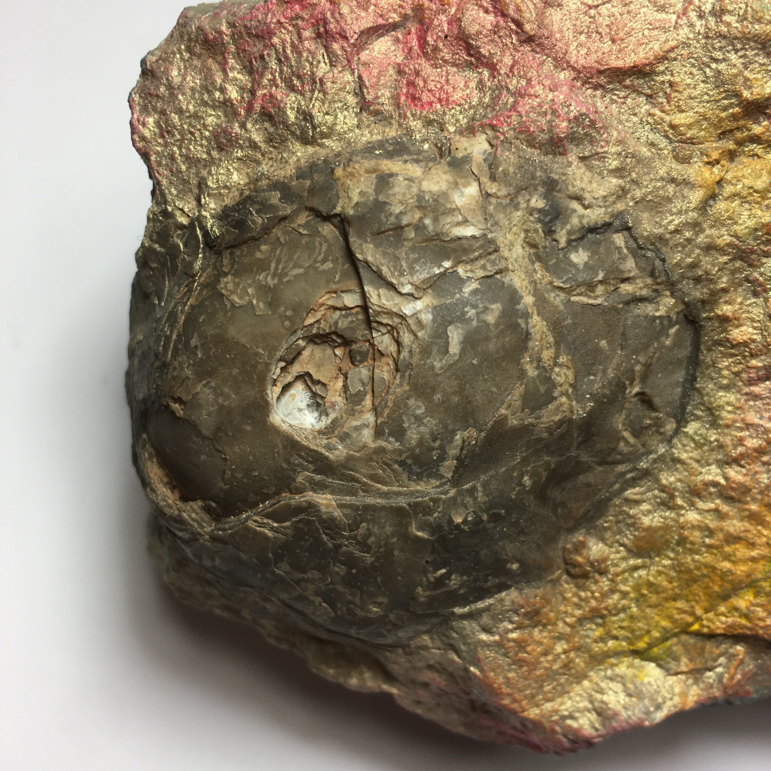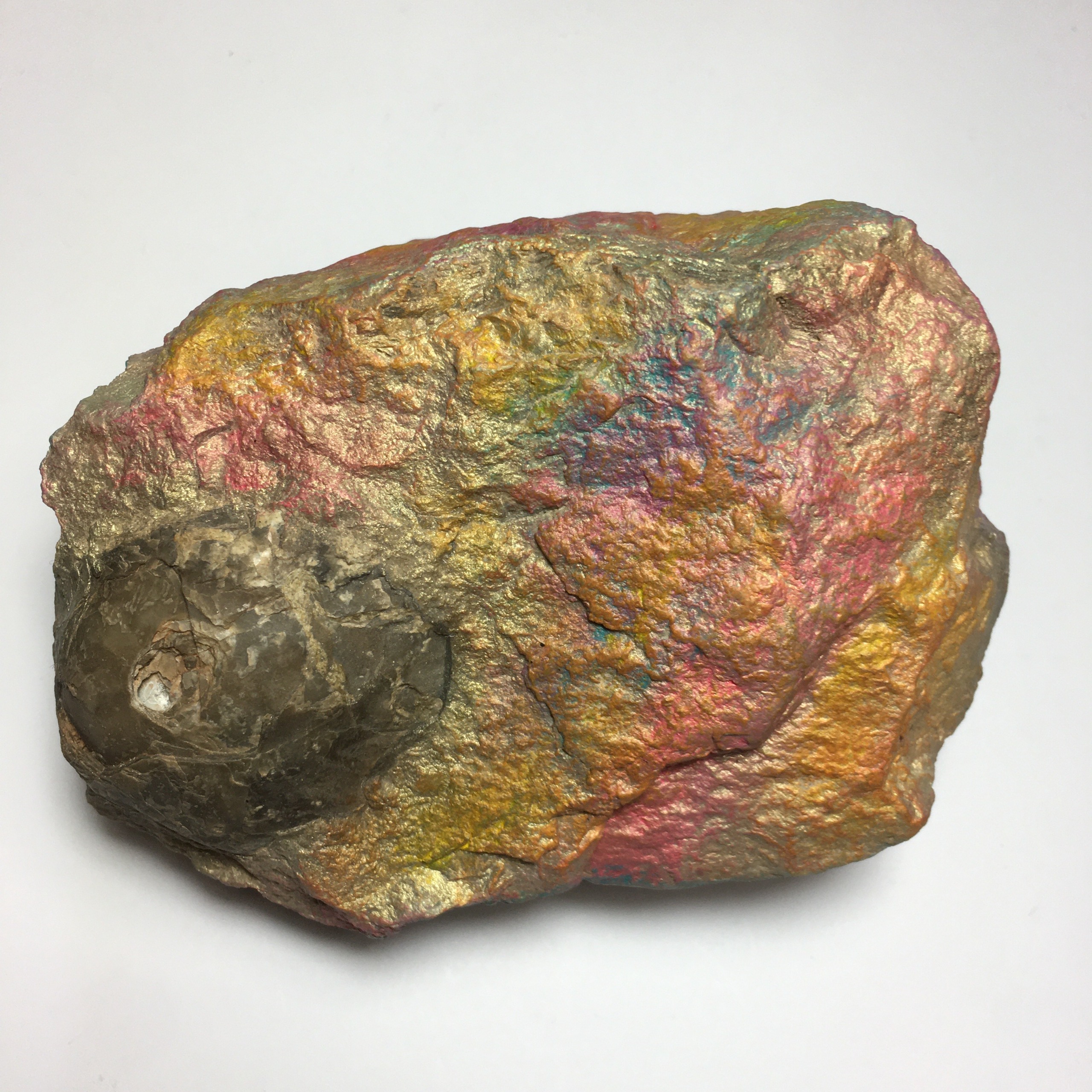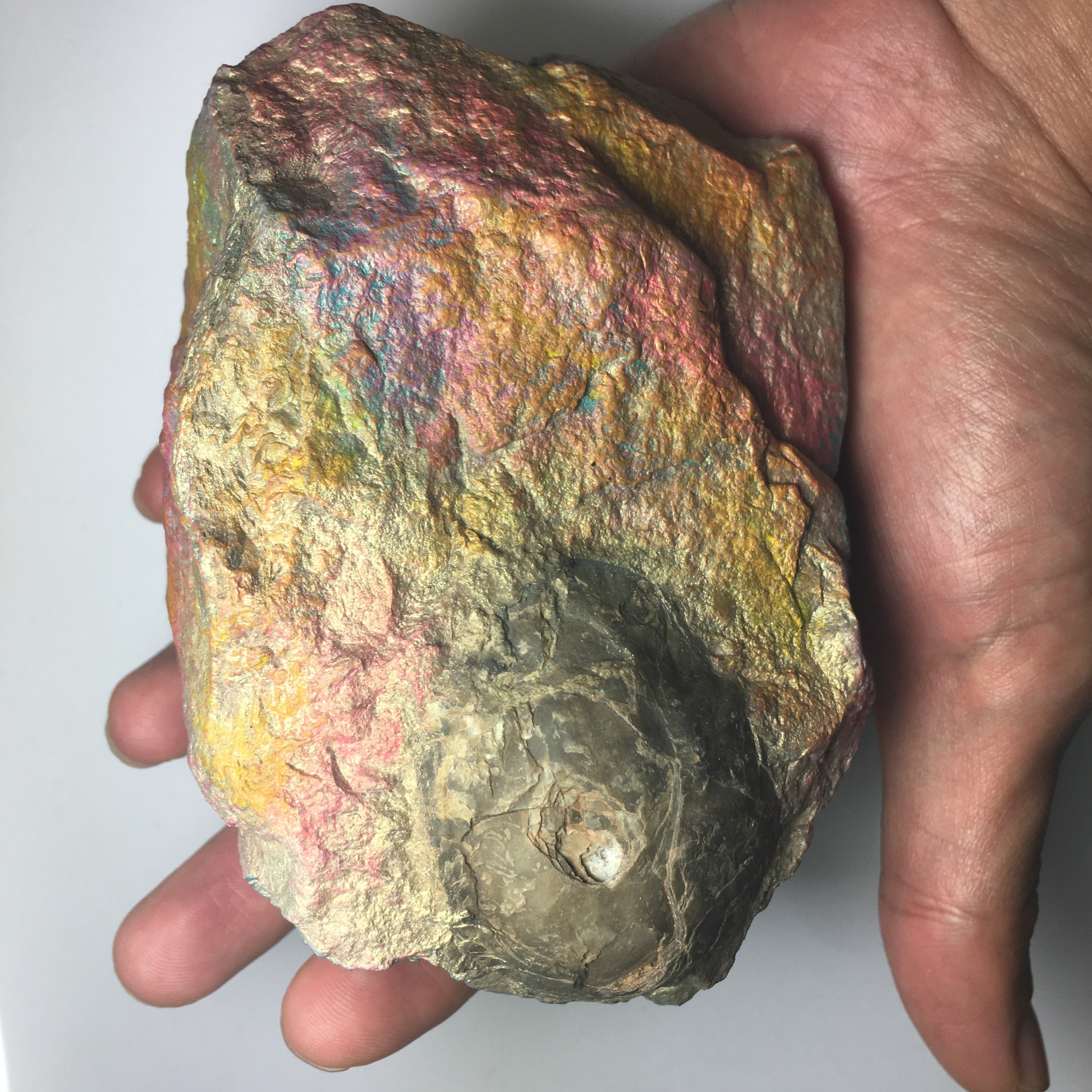 سنگ اطراف فسیل با رنگهای اکریلیک به صورت دستی رنگ آمیزی شده تا جلوه ای خاص، رنگین و کلکسیونی پیدا کند.