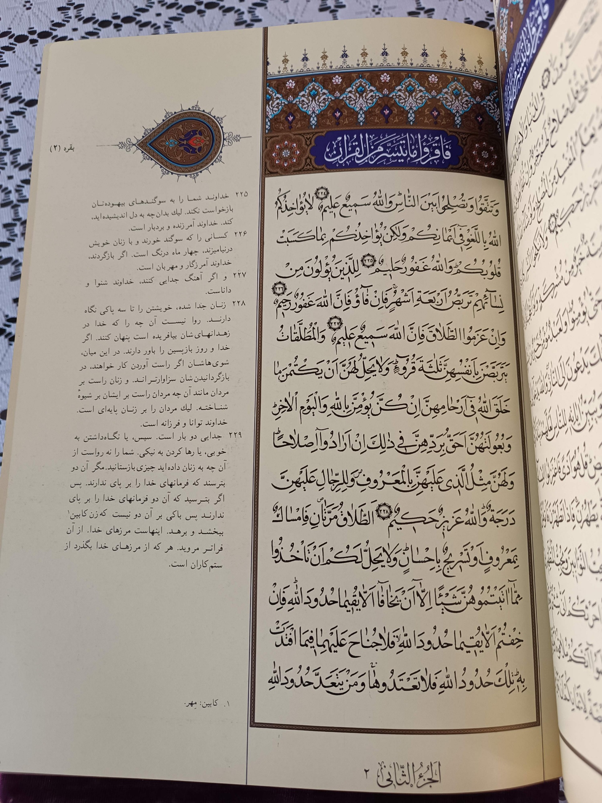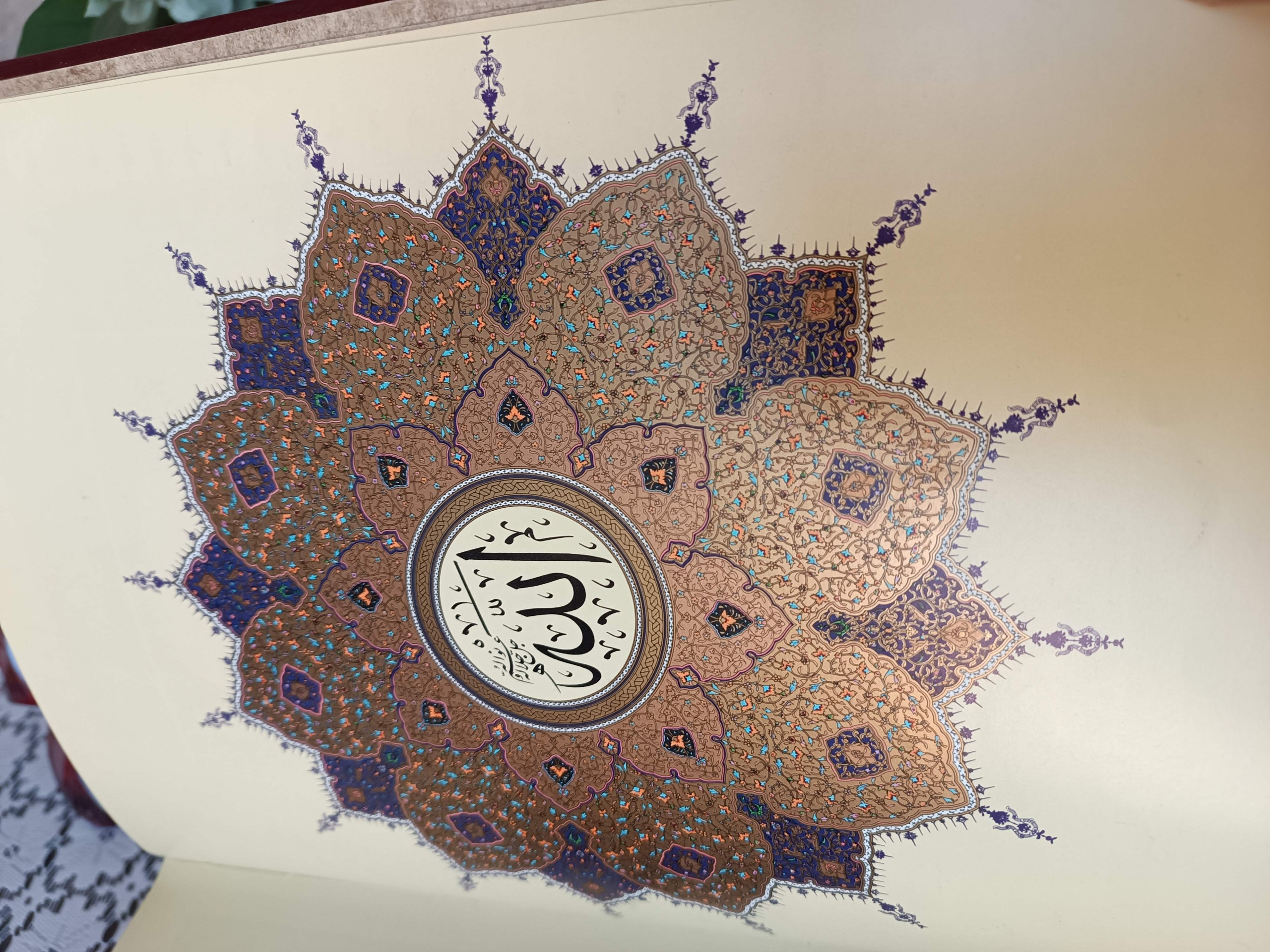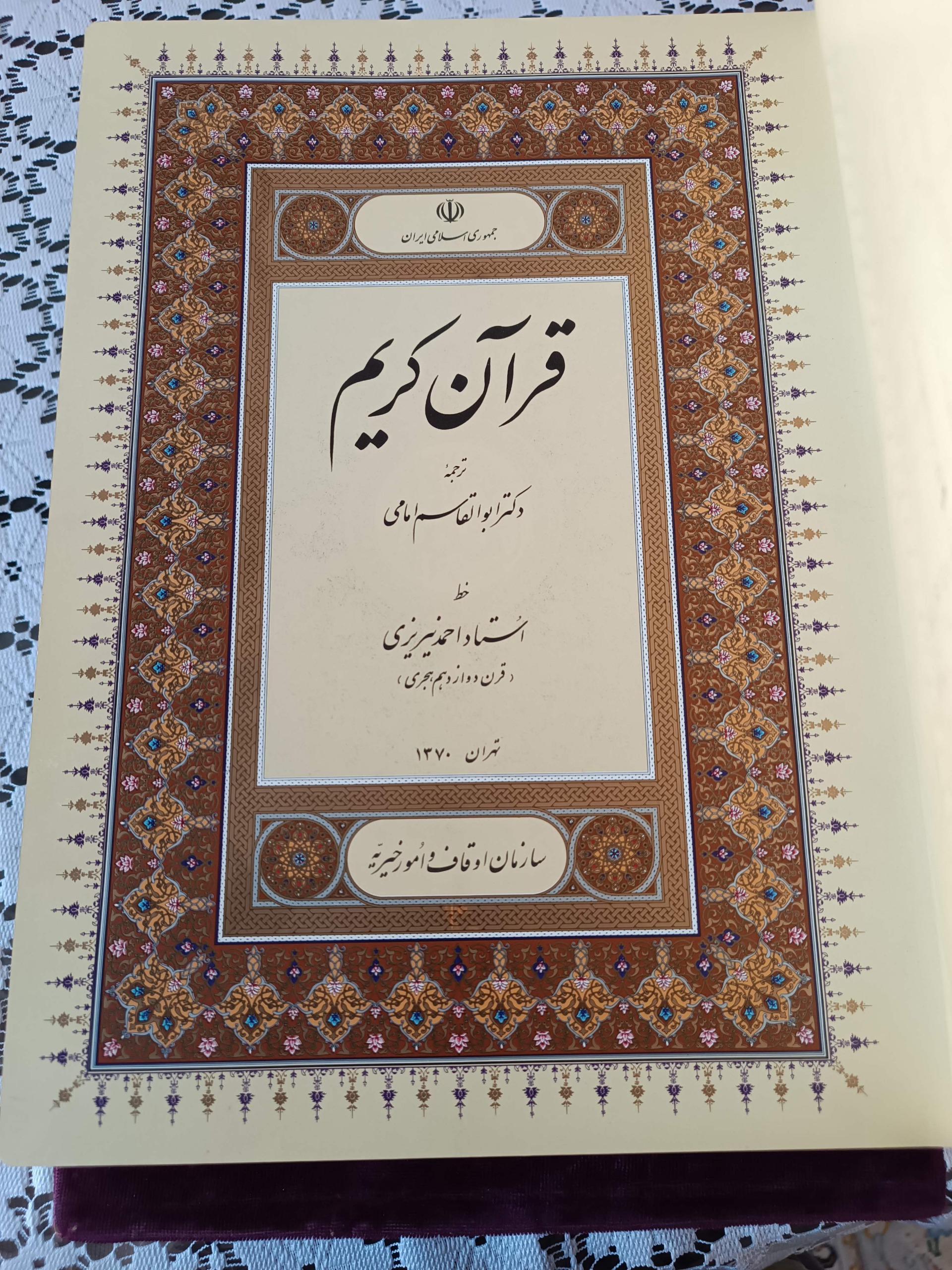 تمام گلاسه و رنگی ، حدود 4 کیلوگرم وزن دارد ، جلد چرمی زرشکی بسیار زیبا که فقط رد کوچکی شبیه رد ناخن دارد ، بسیار تمیز و حفظ شده ، از روی نسخه خط استاد احمد نیریزی توسط سازمان حج و اوقاف در سال 70 با هزینه بالا چاپ شده ،ترجمه منحصر بفرد و خاص استاد ابوالقاسم امامی به زبان صحیح فارسی بدون حشو و زوائد ،داری شرح و کشف الایات و علائم استخاره قطع رحلی بزرگ