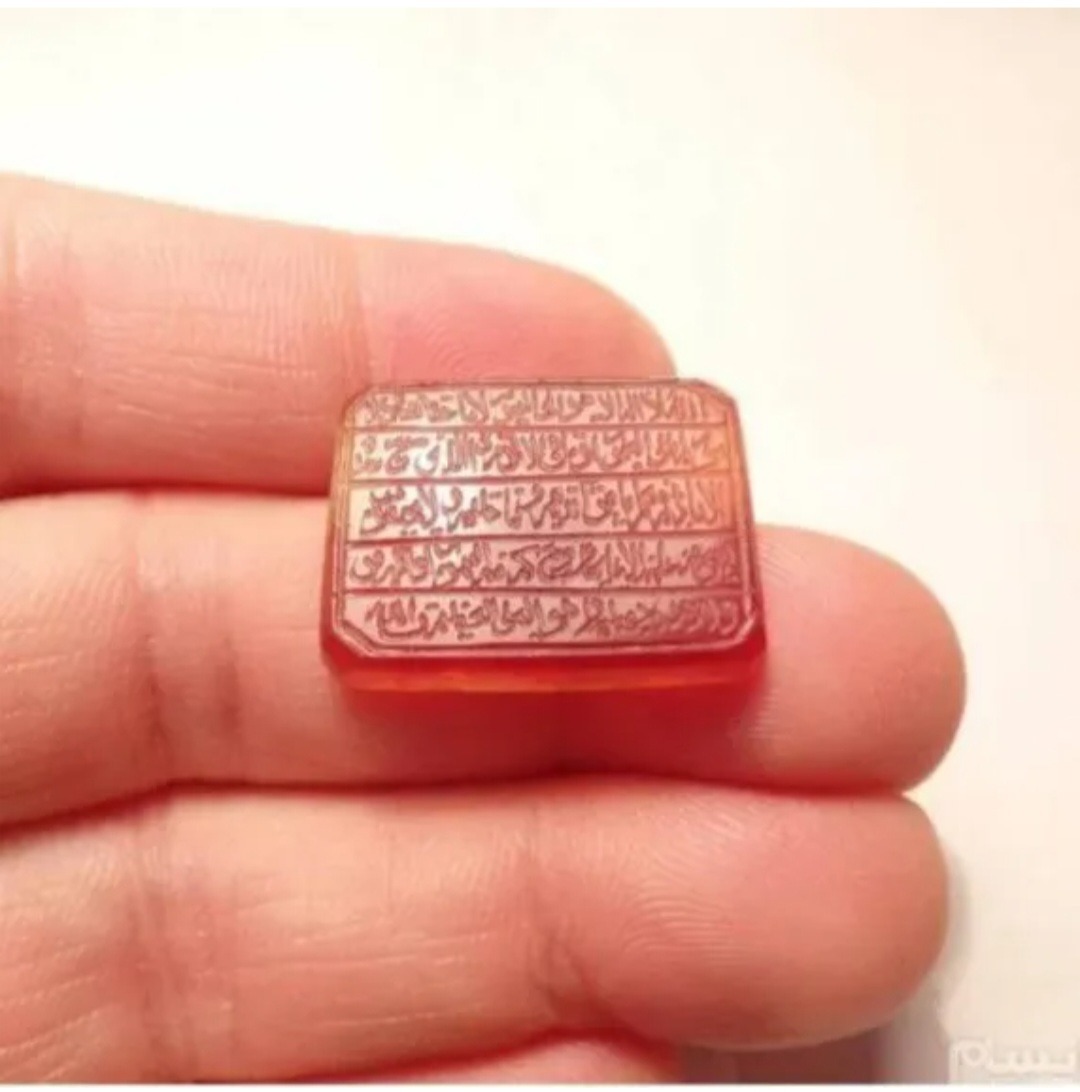 یک قطعه عقیق یمنی کهنه سرخ خوش رنگ و خوش طبع با تراش هشت وجهی رو و زیر نسبتا تخت یمن که بر روی آن با خط قدیمی و به سبک کوپال و بسیار زیبا و عالی با کرسی چینی آیه ( آیتالکرسی) با ابزار قدیمی حکاکی گردیده است