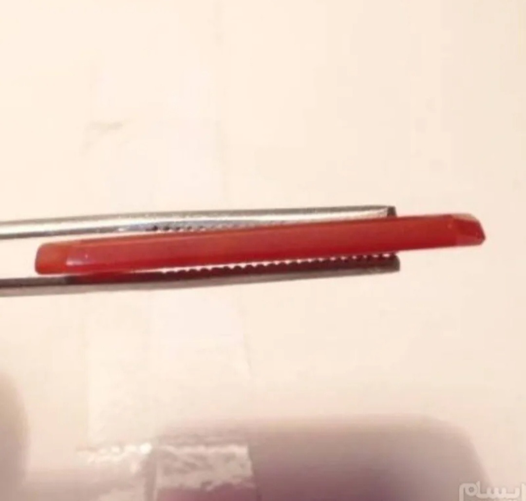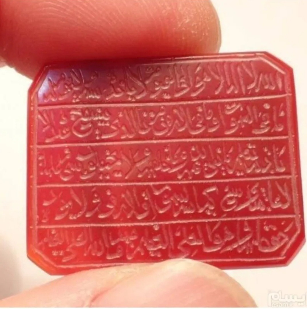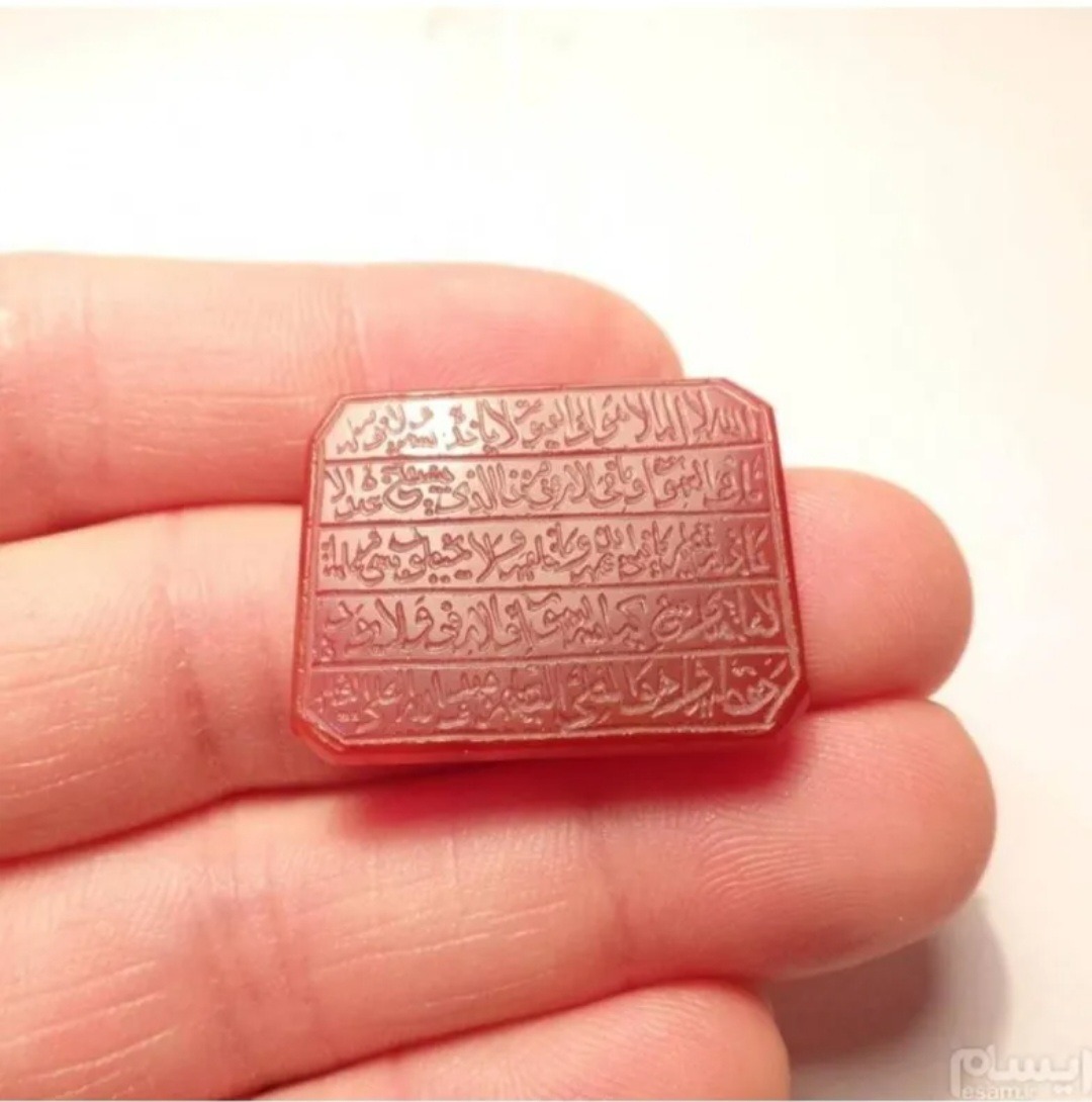 یک قطعه عقیق یمنی کهنه سرخ خوش رنگ و خوش طبع با تراش هشت وجهی رو و زیر نسبتا تخت یمن که بر روی آن با خط قدیمی و به سبک کوپال و بسیار زیبا و عالی