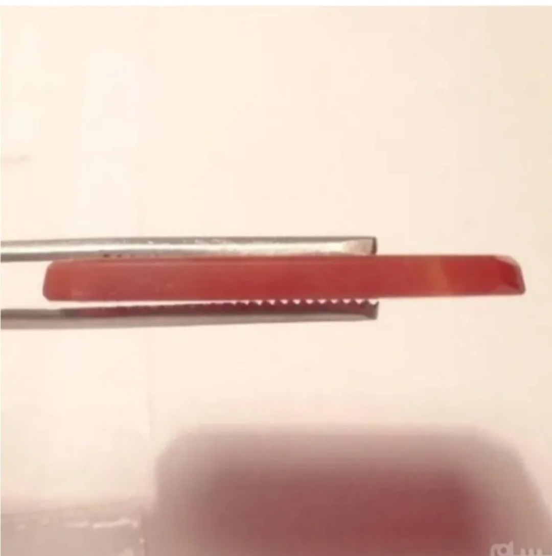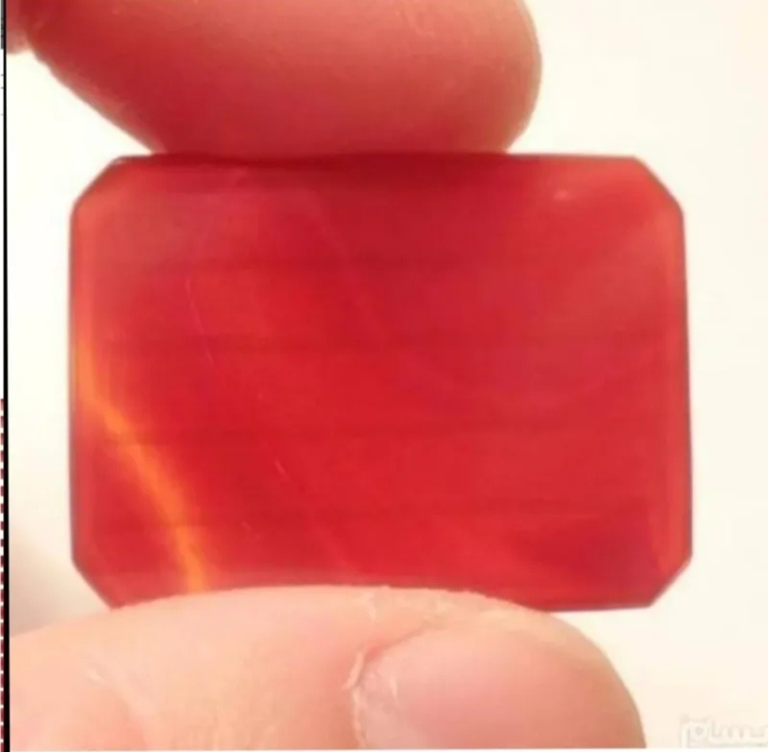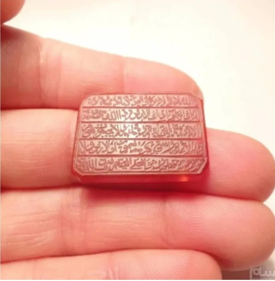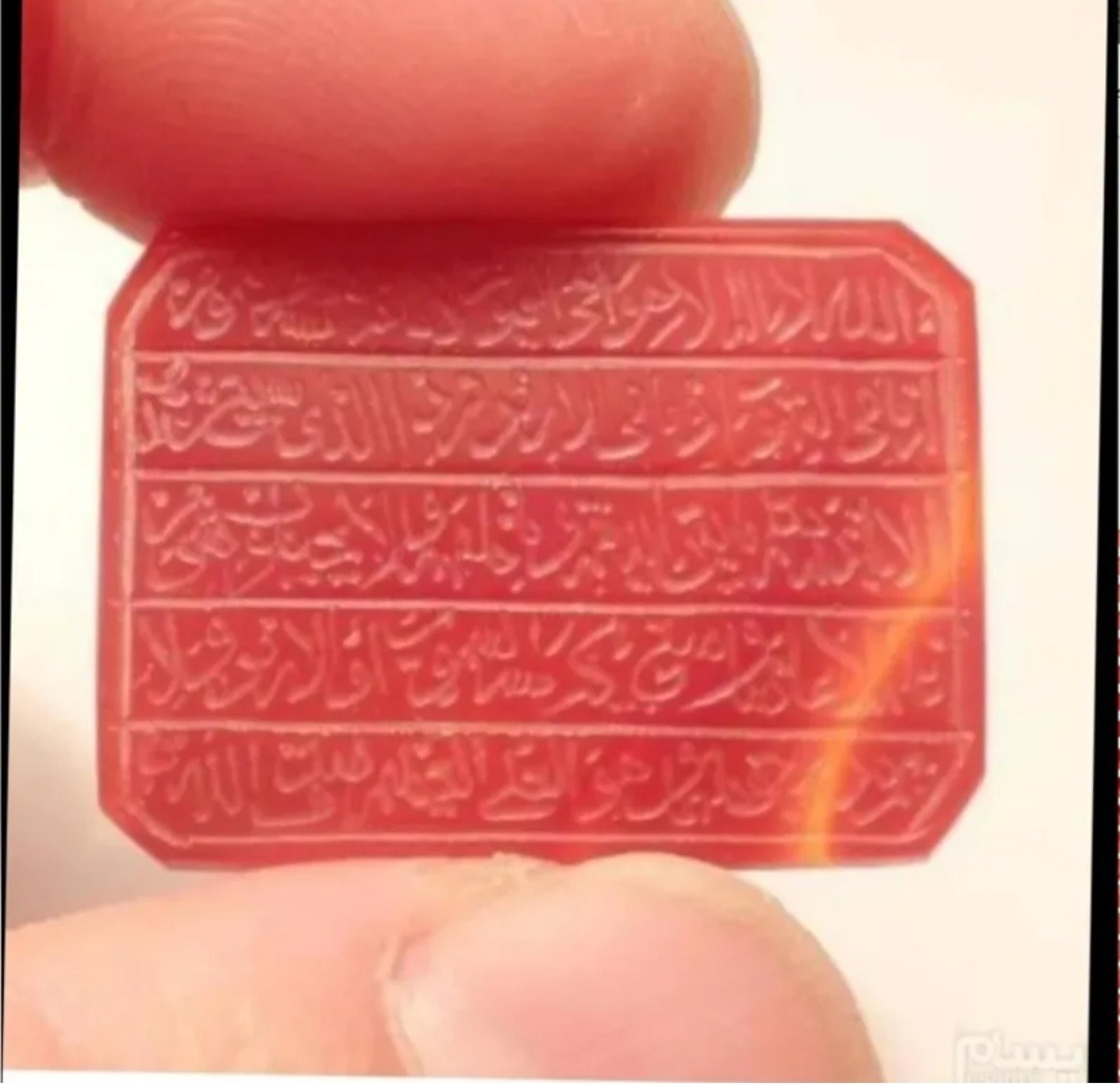 یک قطعه عقیق یمنی کهنه سرخ متمایل به خاکستری خوش رنگ و خوش طبع با تراش هشت وجهی رو و زیر نسبتا تخت یمن که بر روی آن با خط قدیمی و به سبک کوپال و بسیار زیبا و عالی با کرسی چینی آیه ( آیتالکرسی) با ابزار قدیمی  حکاکی گردیده است