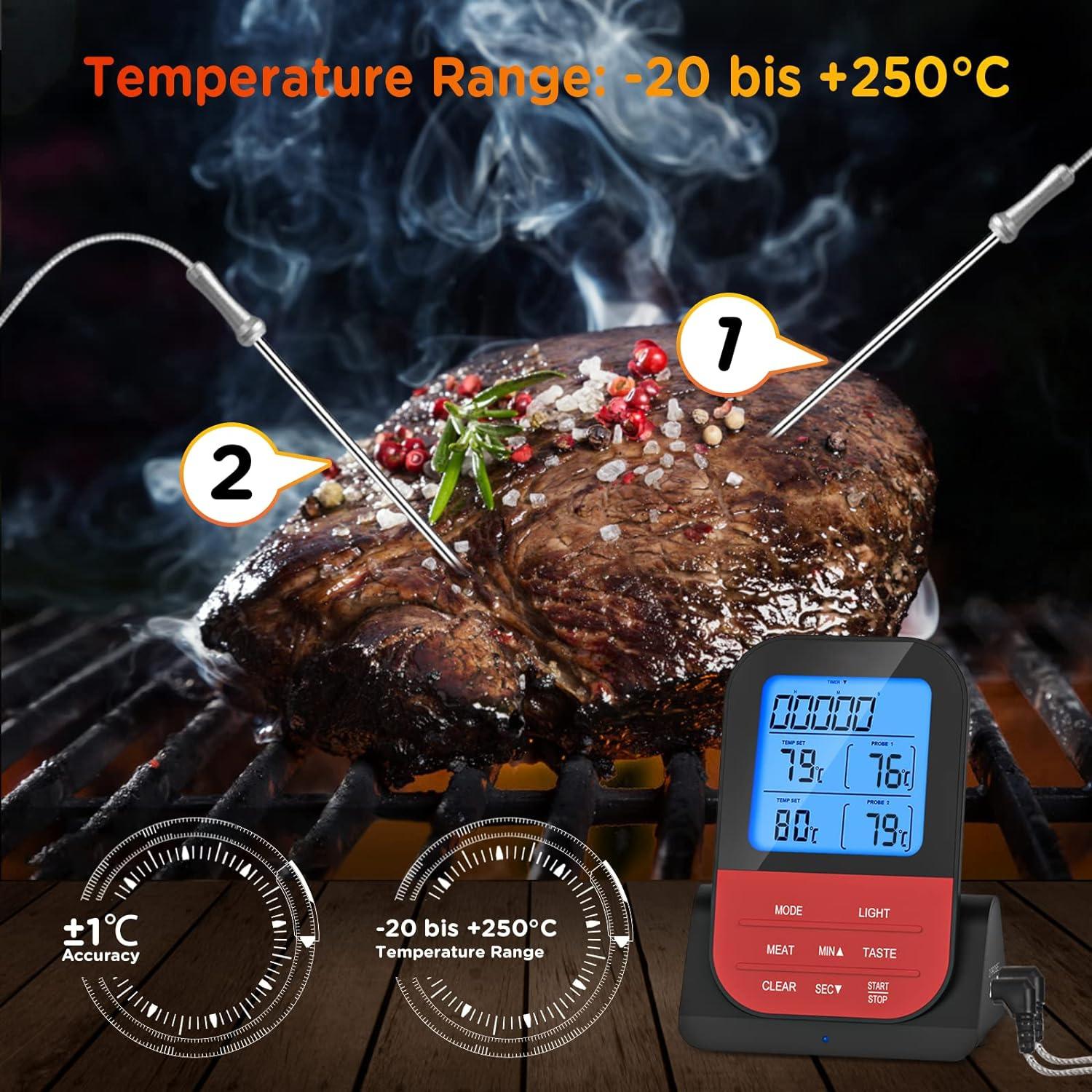 (2 سنسور دما و کابل سنسور دما ساخته شده از فولاد ضد زنگ با حدود. طول 100 سانتیمتر): برای لذت بردن بهینه هنگام استفاده از کباب پز یا کتری، بهتر است از دماسنج گوشت بیسیم با حداقل دو سنسور دما استفاده کنید، بنابراین میتوانید غذا و درجه حرارت را در کبابپز دودیکن BBQ بررسی کنید و اگر آن را تغییر دهید. لازم است. علاوه بر این امکان بررسی همزمان دو نوع گوشت با استفاده از دو سنسور دما وجود دارد