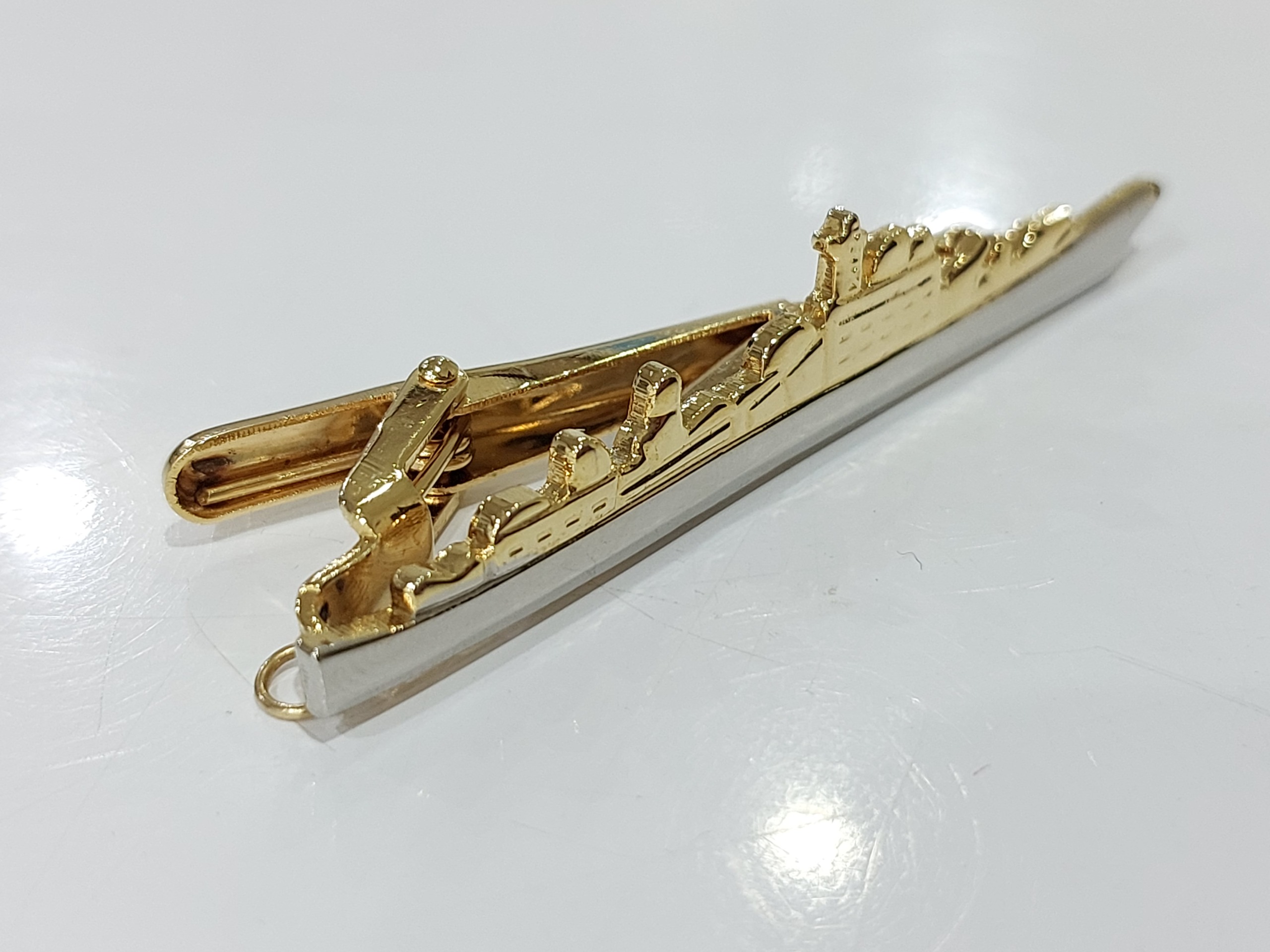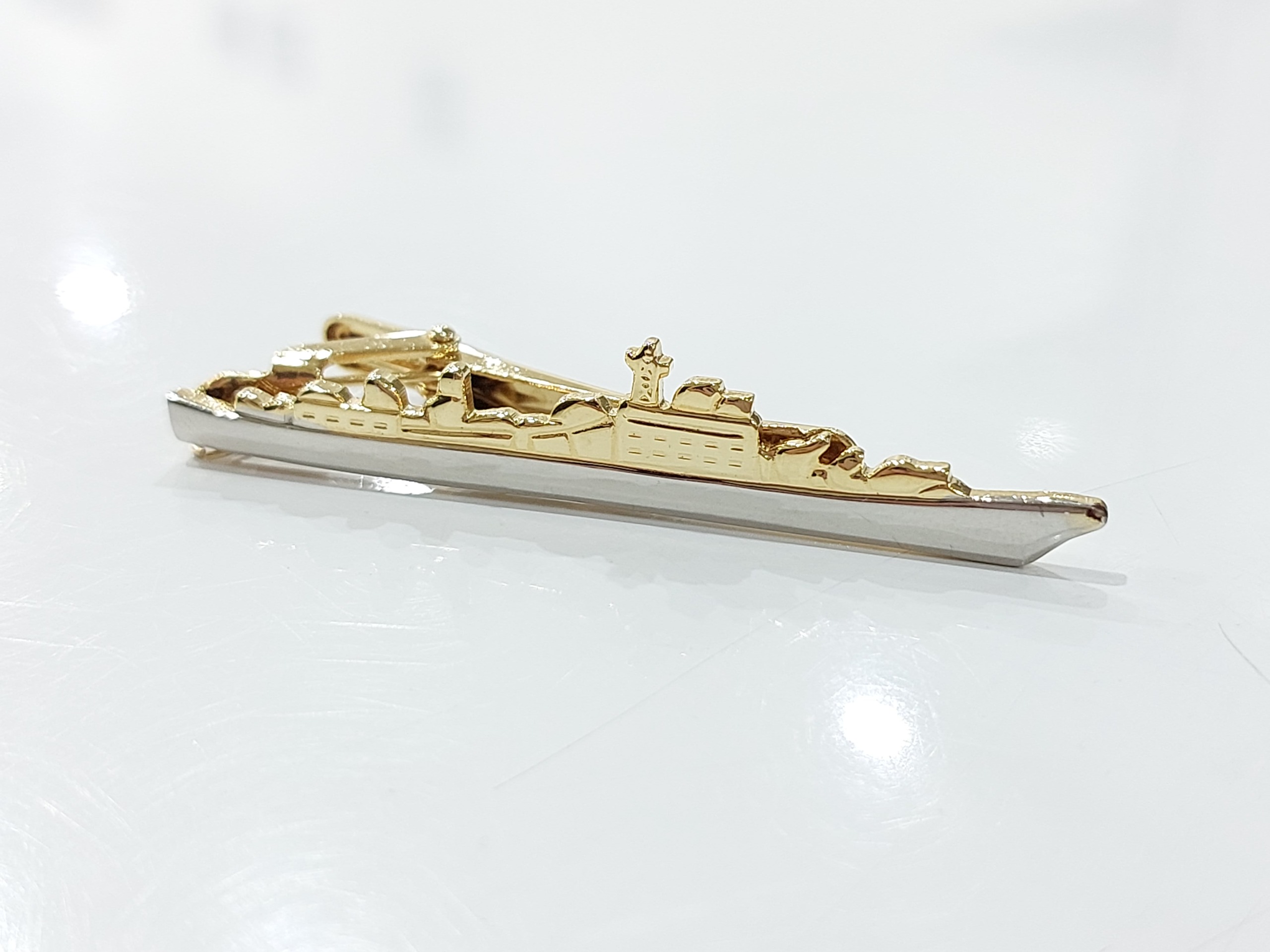 گیره کراوات طرح کشتی ناوگان دریایی آمریکایی اصل با بیش از 50 سال قدمت بینهایت نایاب و کلکسیونی، بسیار زیبا و ارزشمند، خاص و منحصر به فرد میباشد. طول آن 6 سانتیمتر و عرض آن یک سانتیمتر است. جنس گیره از مس بوده و با طلا آبکاری شده است. همراه با طراحی خاص، دقت و ظرافت بسیار بالا در ساخت آن. قیمت این گیره کراوات در سایت های معتبر خارجی بین 15 تا 20 دلار بدون احتساب هزینه حمل و نقل میباشد.