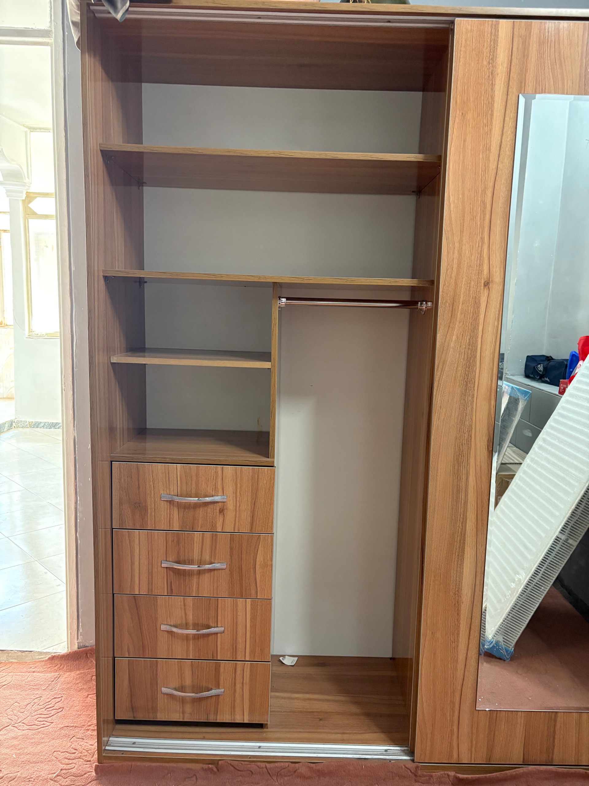 کمد در ابعاد طول 2 متر ارتفاع 180 و عمق 60 سانت و دارای دو درب که روی یکی اینه کار شده و دوطرف جای بزرگ برای اویز لباس و 4 کشو و سه طبقه ی بزرگ و دو طبقه کوچک میباشد