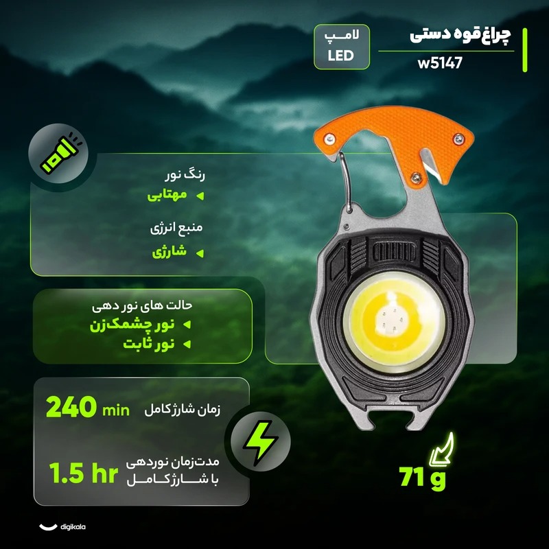 چراغ قوه چند کاره کمپینگ مدل W5147 یک محصول کوچک و جمع و جور است که به راحتی در جیب جا می شود. در سفر، کمپینگ، محل کار، هنگام تعمیرات، در محیطهای باز و هر جایی که نیازمند روشنایی باشید این چراغ قوه مفید خواهد بود.