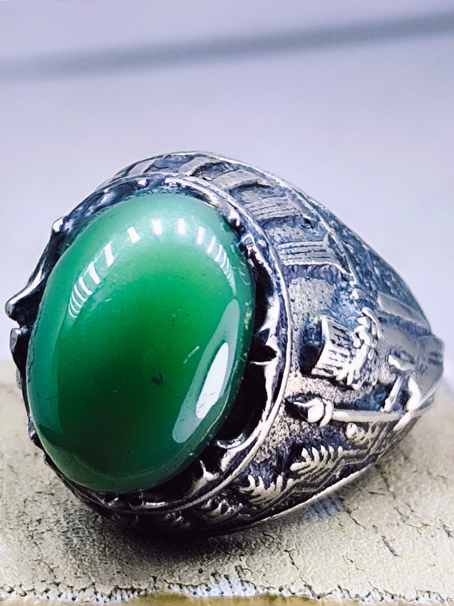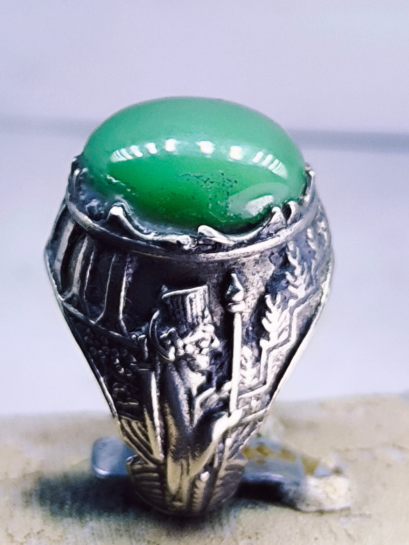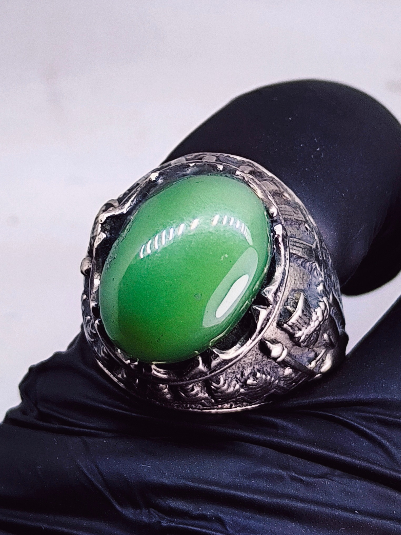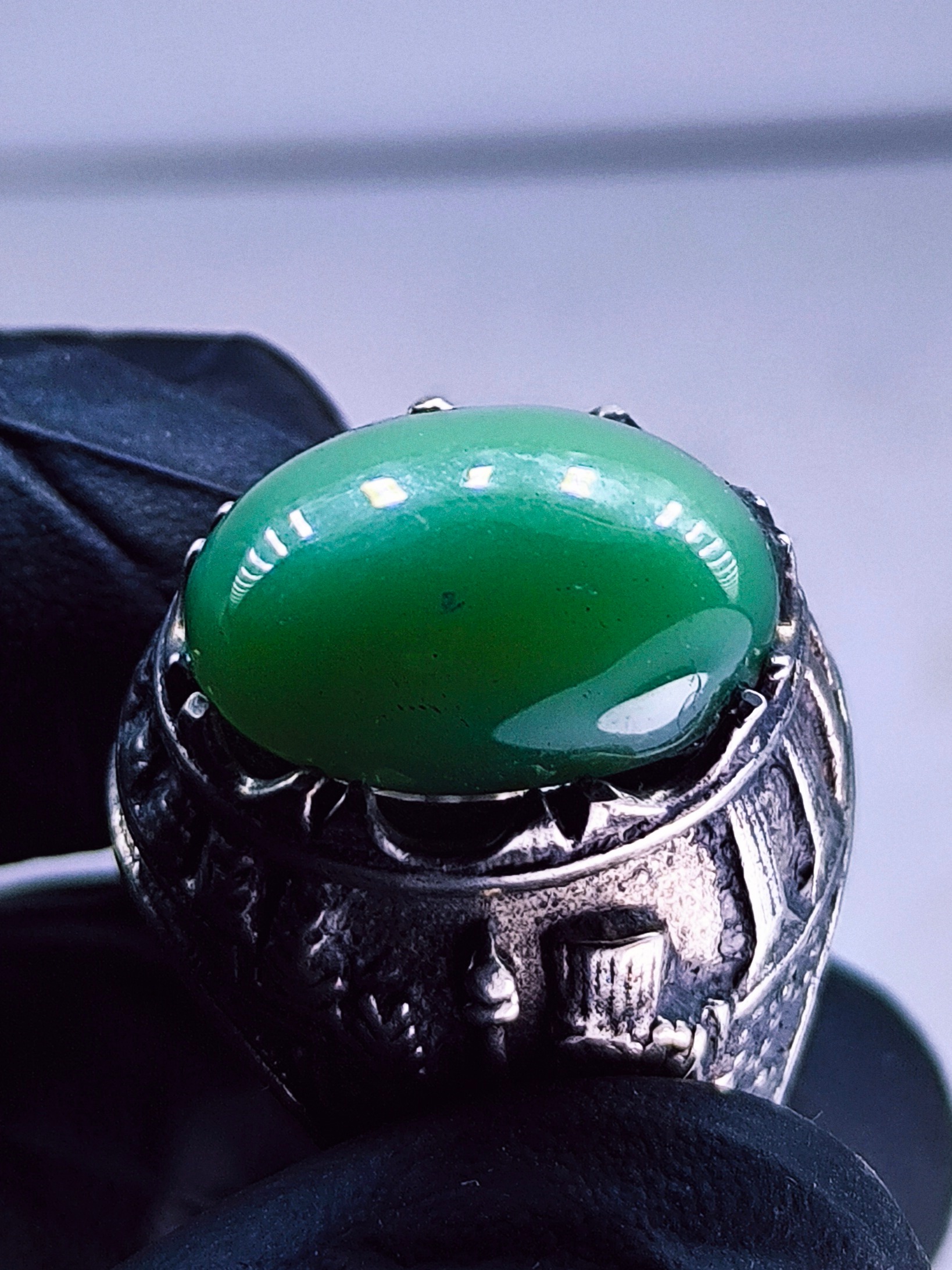 انگشتر لوکس آبدار عقیق سبز یمانی با تراش بکر عبدالرزاقی با هاله ای بینظیر سوار بر رکاب نقره طرحدار سایز 63