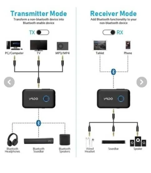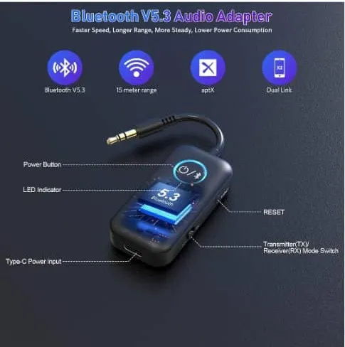 - گیرنده بلوتوث: در حالت TX، فرستنده بلوتوث از طریق جک 3.5 میلیمتری به دستگاههای غیر بلوتوثی مانند تلویزیون/هواپیما متصل میشود و صدا را به هدفون بلوتوث منتقل میکند؛ در حالت RX، گیرنده بلوتوث میتواند به بلندگوی سیمی/پورت ورودی صدای ماشین متصل شود و صدا را از