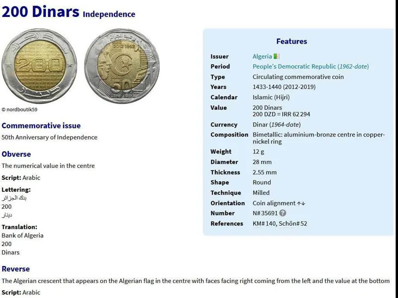 سکه یادبودی 200 دینار الجزایر 2015 (بسیار کمیاب)