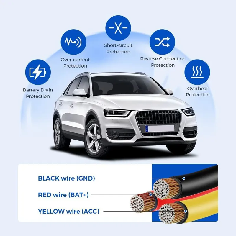 - کیت AZDOME 3-Lead Hardwire یک دستگاه مدیریت انرژی است که از طریق جعبه فیوز به داشکام شما از باتری ماشین شما کمک می کند تا داشکام شما را حتی پس از خاموش شدن موتور شما به طور مداوم کار کند تا از ویژگی مانیتور پارکینگ 24 ساعته استفاده