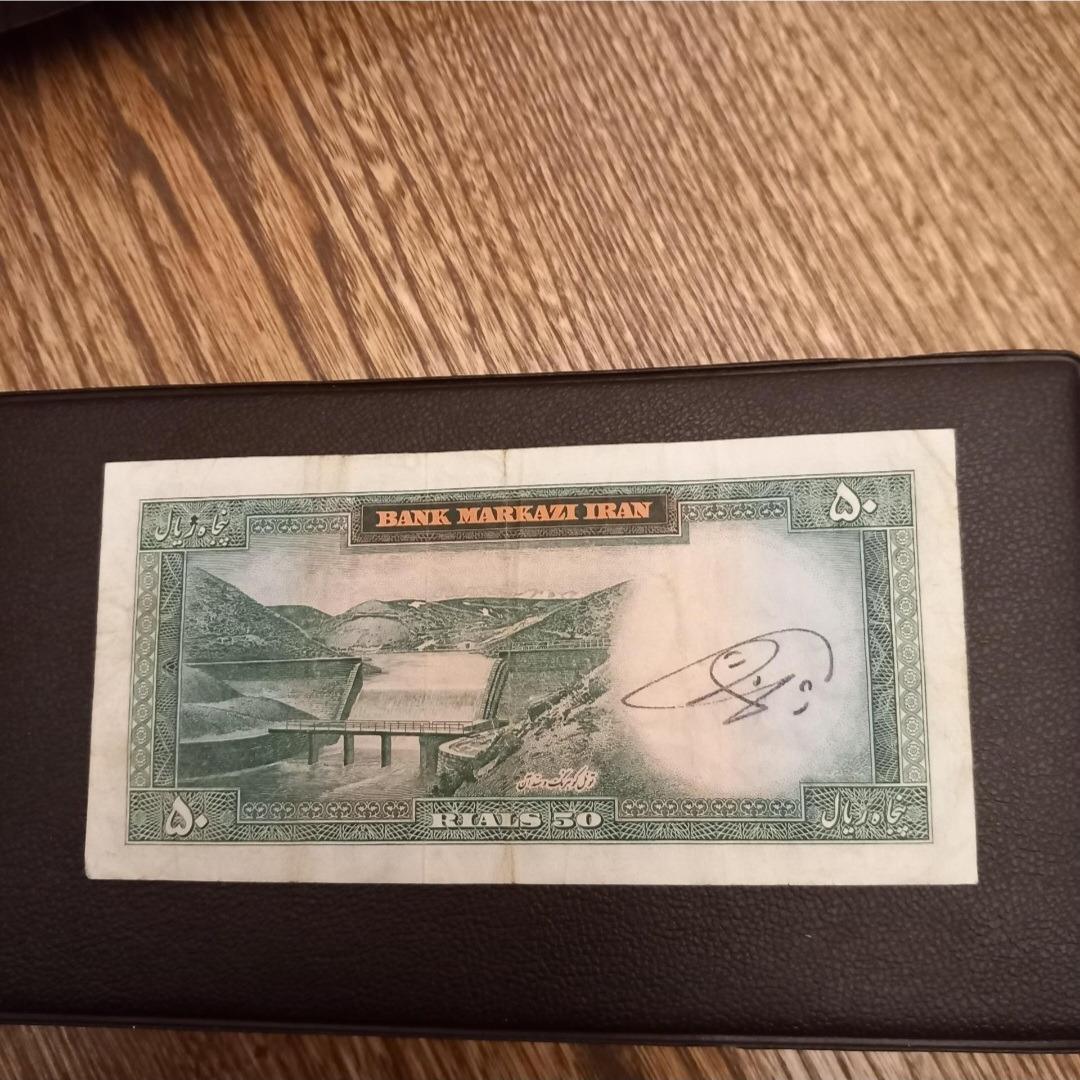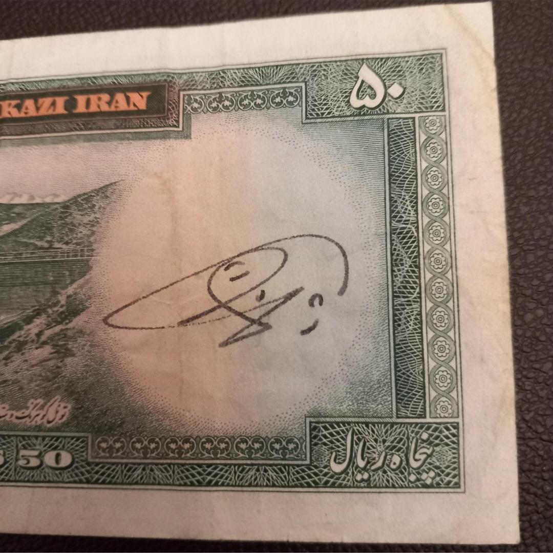 اسکناس 50ریالی کرواتی محمدرضا پهلوی/ کیفیت اسکناس خوب میباشد و کاملا جوندار بدون هیچ زدگی و مشکلی/ اما در پشت اسکناس یه امضا خودکاری وجود دارد که در تصاویر بصورت واضح مشخص میباشد/