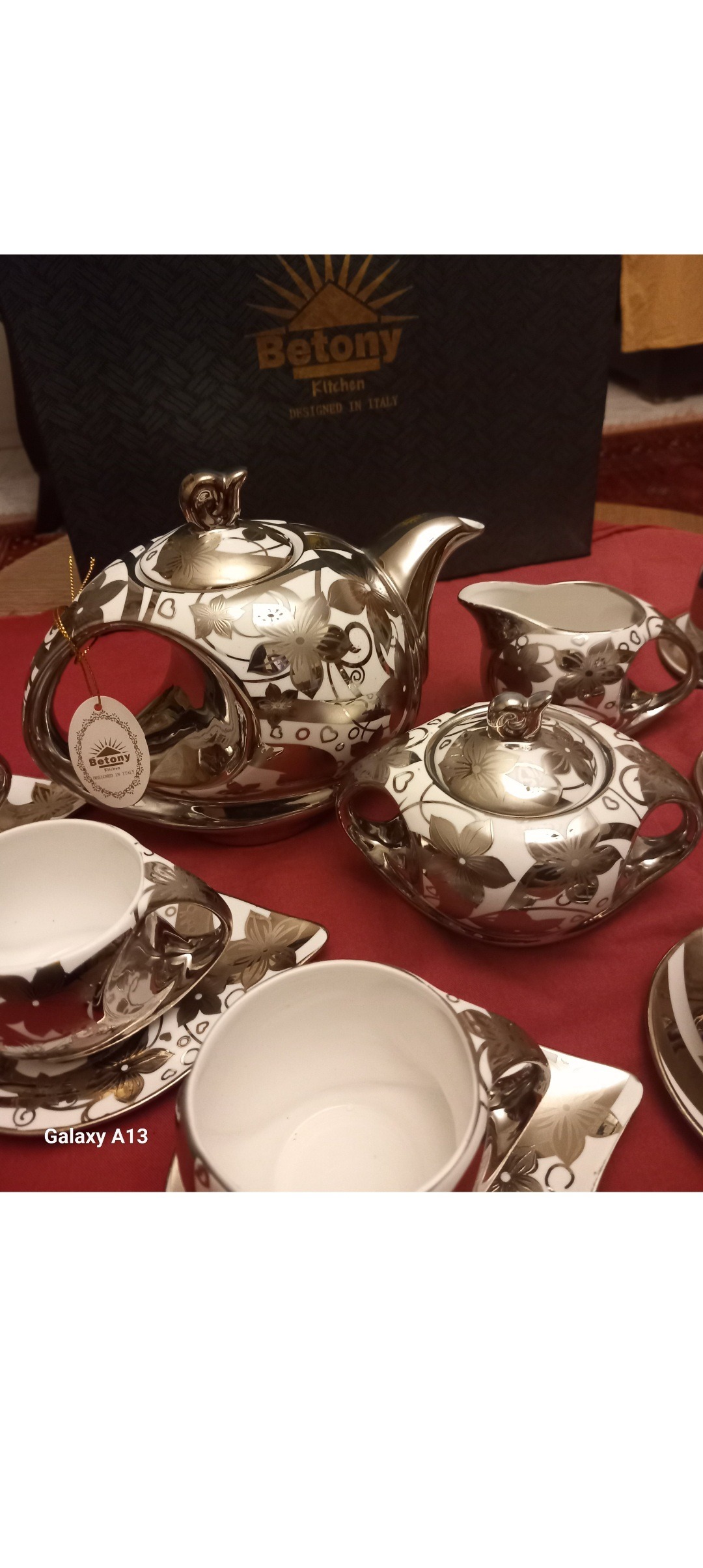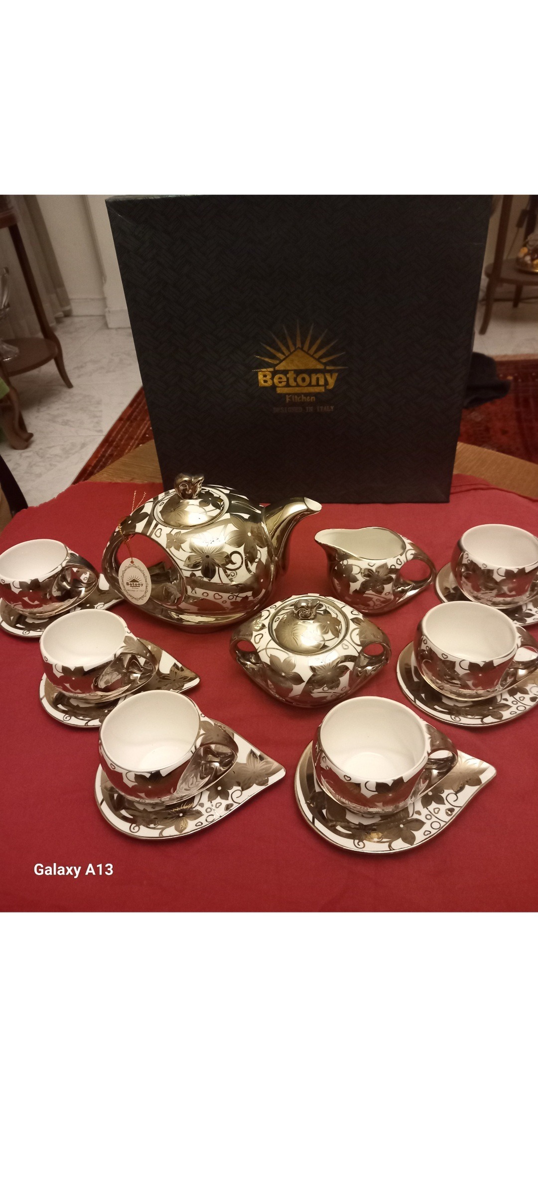 ست کامل صبحانه خوری ایتالیایی/ بسیار ظریف و چشم نواز/ برند معروف و قدیمی BeTony/ ست 15 پارچه_ شامل: 6عدد فنجان، 6عدد نعلبکی، قوری، قندان و شکرپاش/ بسیار خاص و زیبا/ سالهاست که بصورت نو و بدون استفاده در جعبه فابریک خودش نگهداری شده است/
