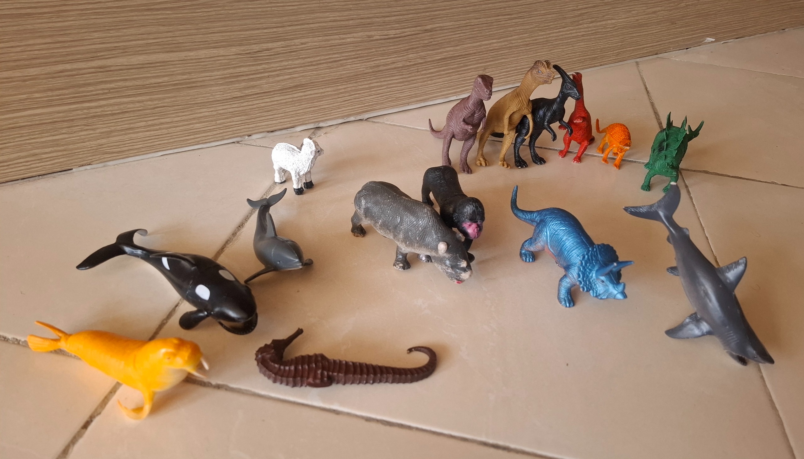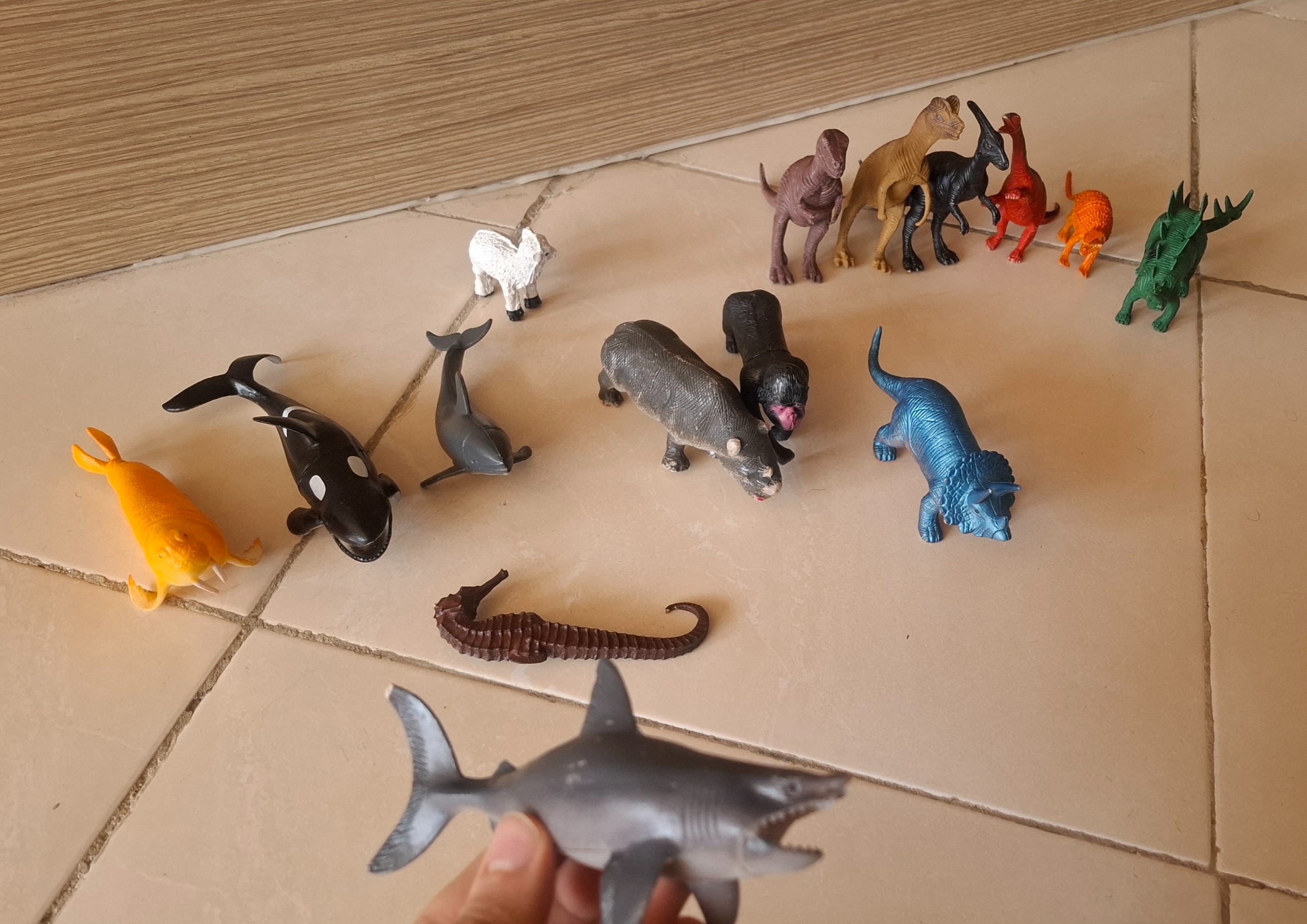 شناخت زیادی نسبت به اسم حیوانات ندارم ولی شش عدد دایناسور به نظر میان. پنج عدد هم کوسه و دلفین و مارماهی و اسب یا خوک دریایی و ایناس. بقیه هم گویا کرگدن و میمونه. یدونه هم گوسفند. لازم به ذکر است یکی از پاهای گوسفند شکسته ولی میتونه وایسته. عکسشو گذاشتم.