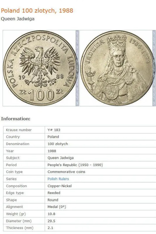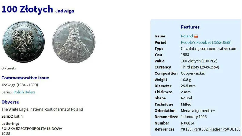 سکه 100 زلوتی یادبودی لهستان 1988 (نایاب) یادویگا