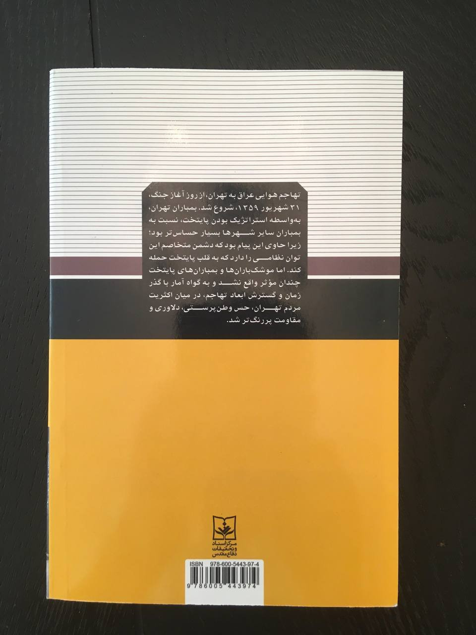 - کامل ترین کتاب تا کنون درباره بمباران ها و موشک باران های تهران در زمان جنگ، روزشمار حملات عراق و تمامی اطلاعات و تلاش های سیاسی و دیپلماتیک، همراه با تعدادی عکس از محل های اصابت و کمک های تیم های امداد و مردم