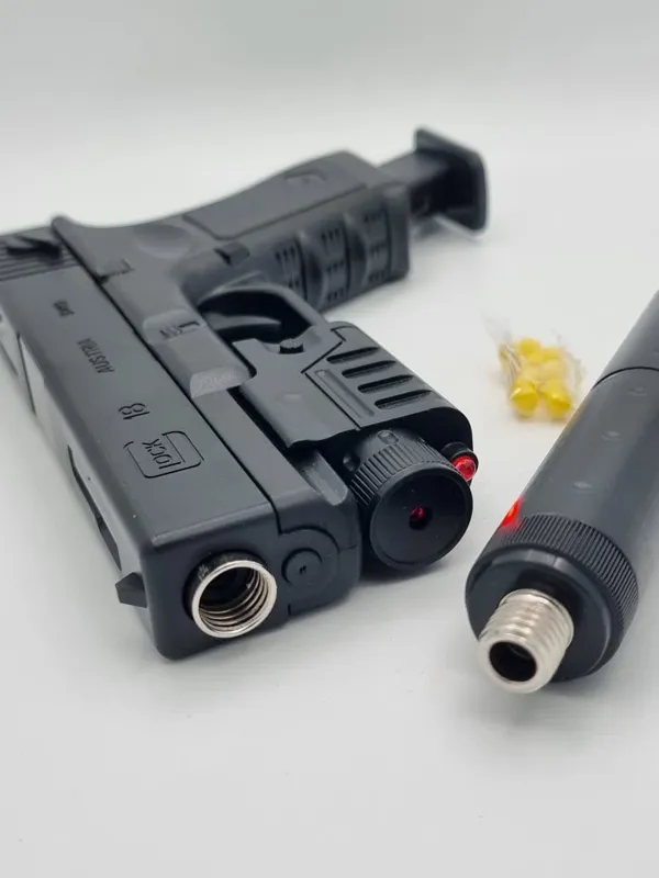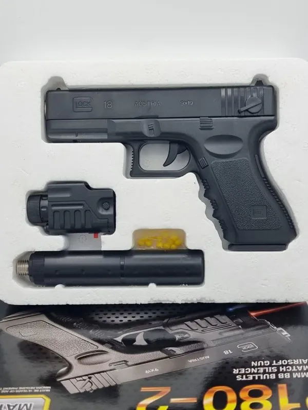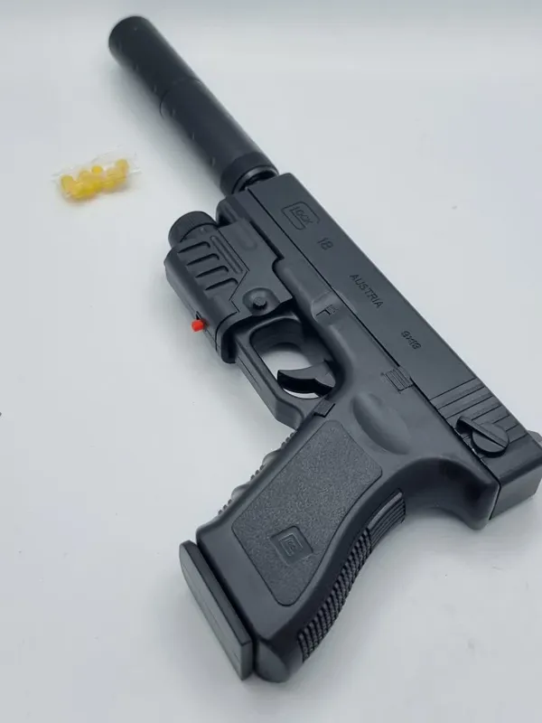 تفنگ اسباب بازی جنس بدنه پلاستیک و جنس لوله شلیک فلزی صدا خفه کن داره و لیزر دار هست و ساچمه پلاستیکی میخوره