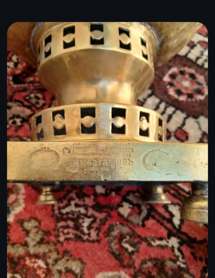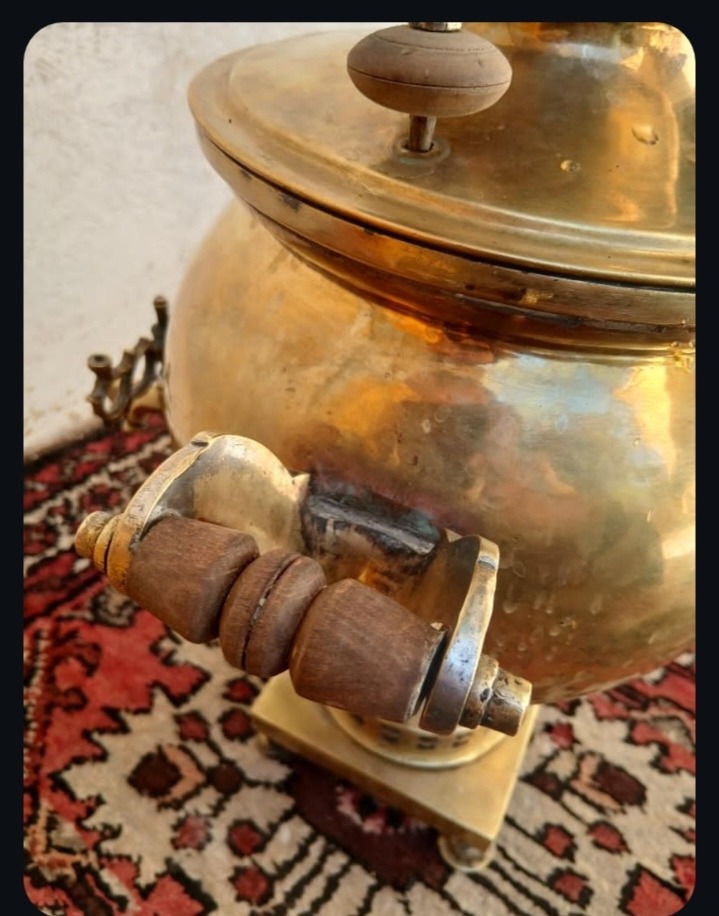 سماور قدیمی مدل شلغمی 4لیتری پاتاشوف روسی با حدود 100سال قدمت سالم و با نوشتار فارسی و خارجی تولید شده در شهر تولا روسیه جنس برنج