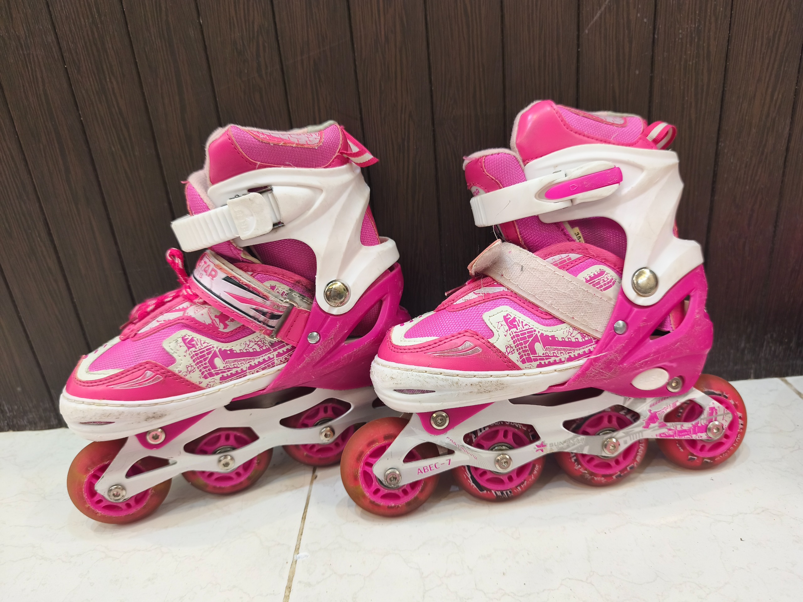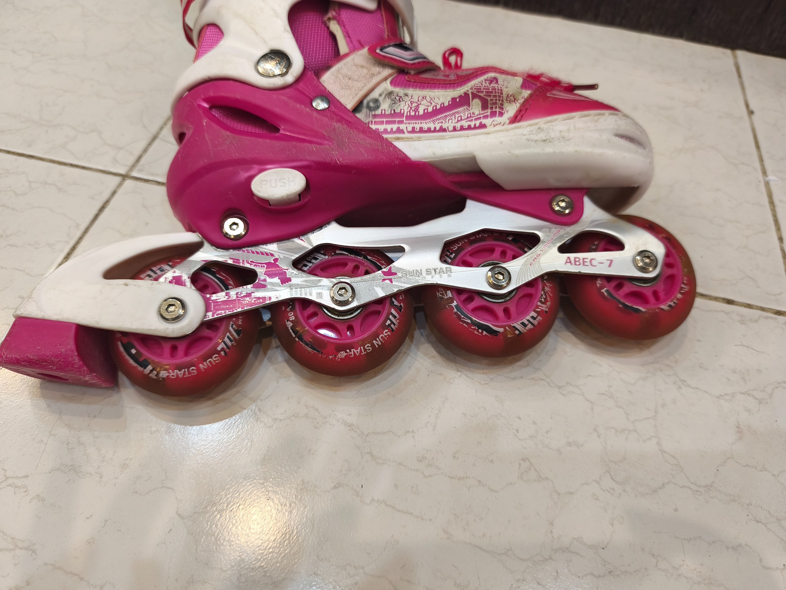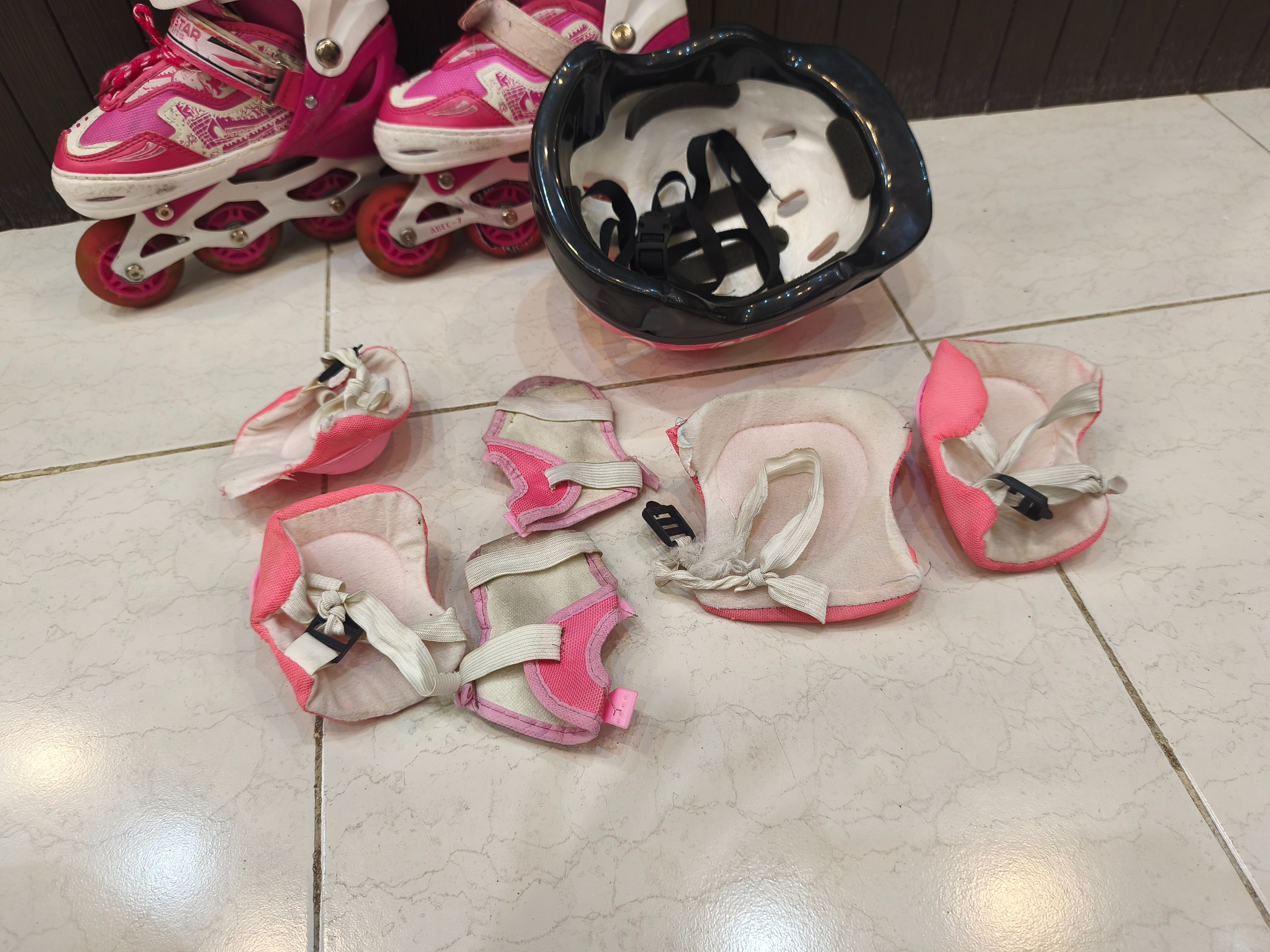 اسکیت کفشی صورتی سایز 35تا38 . چرخ ها سالم و چراغ کفشها سالم میباشد پد های ضربه گیر کفش جدا شده اند که قابل تعمیر است . کش زانو بند و آرنج بند خراب شده . کلاه کاملا سالم است طبق عکس ها