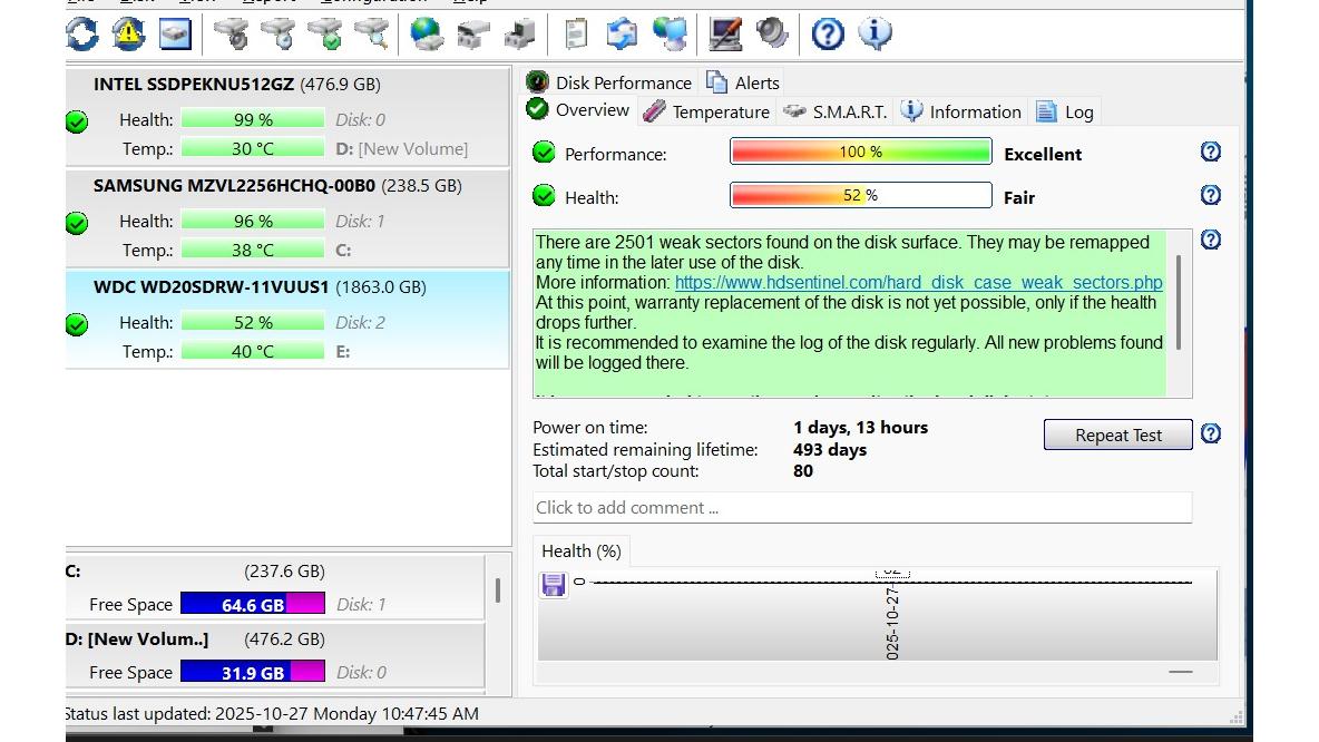 گویا بد سکتور داره: بعد از یکی دو دقیقه میاد بالا (ویندوز میشناسه) ولی فرمت نمیشه. ایراد Device Not Ready میده. فقط یکبار قبل از اینکه ویندوز بشناسه یه صدا تق میده و در باقی اوقات بدون صدا میچرخه. مطمئن نیستم، ولی اگر یکی وارد باشه شاید بتونه بالا بیاردش.