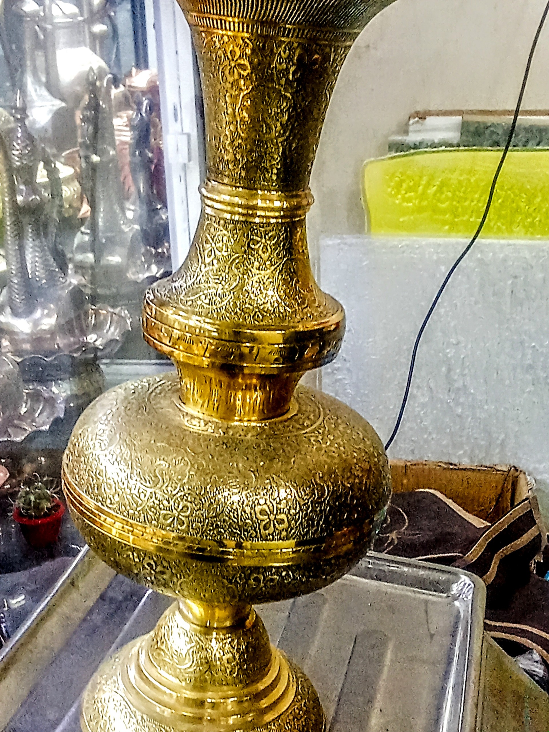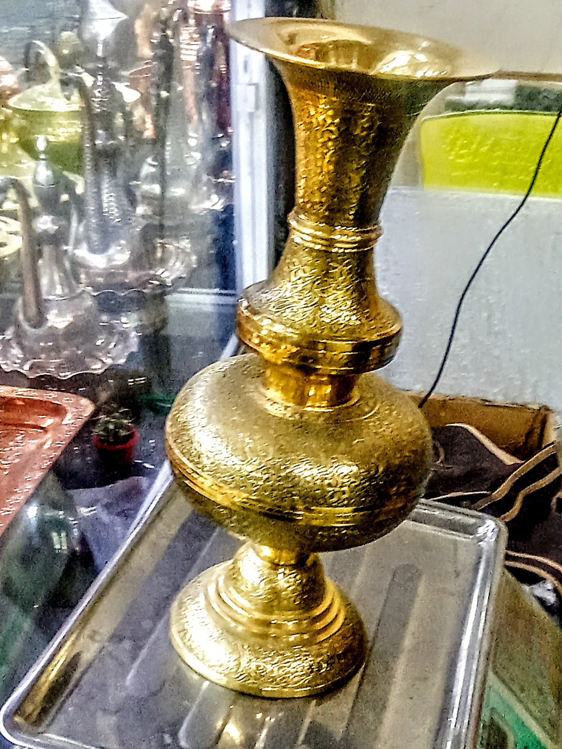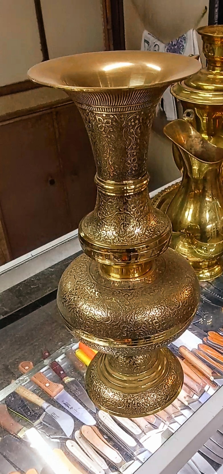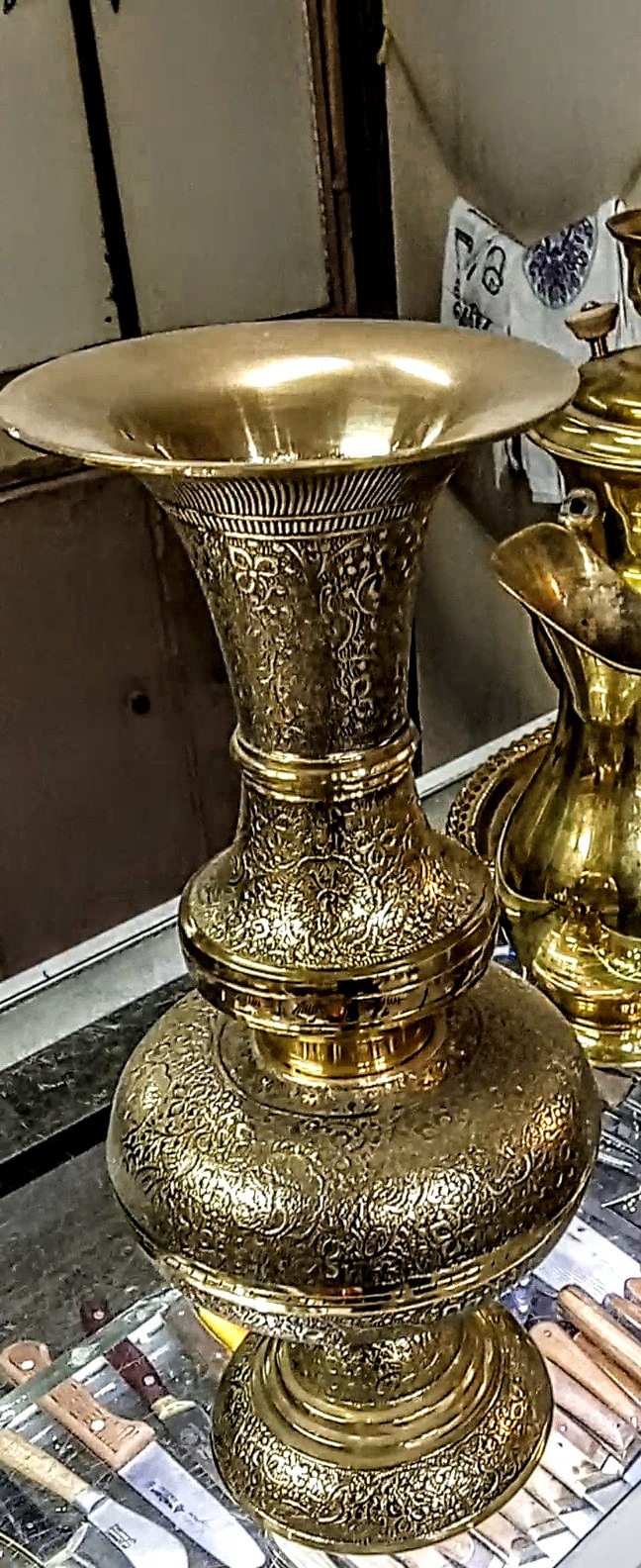 گلدان پایه دار برنجی طرحدارغرق قلم گل وبوته شکم کروی ورق ضخیم ارتفاع 50سانت بالای 3کیلووزن وکاملا نومیباشد ودکوری وانتیک وزیبا