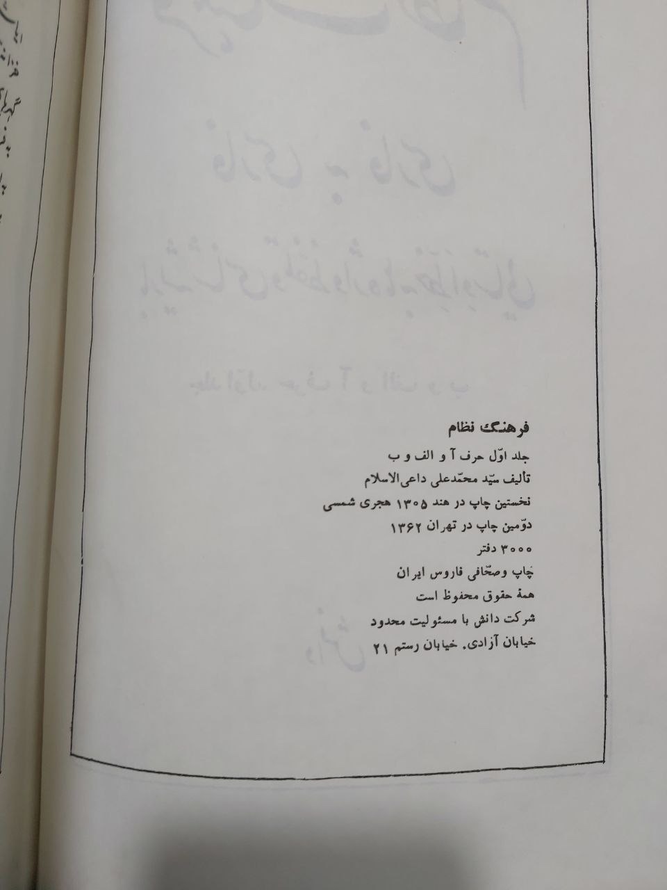 فرهنگ پنج جلدی فارسی به فارسی نظام با ریشه شناسی و تلفظ واژه ها به خط اوستایی نوشته سید محمد علی داعی الاسلام