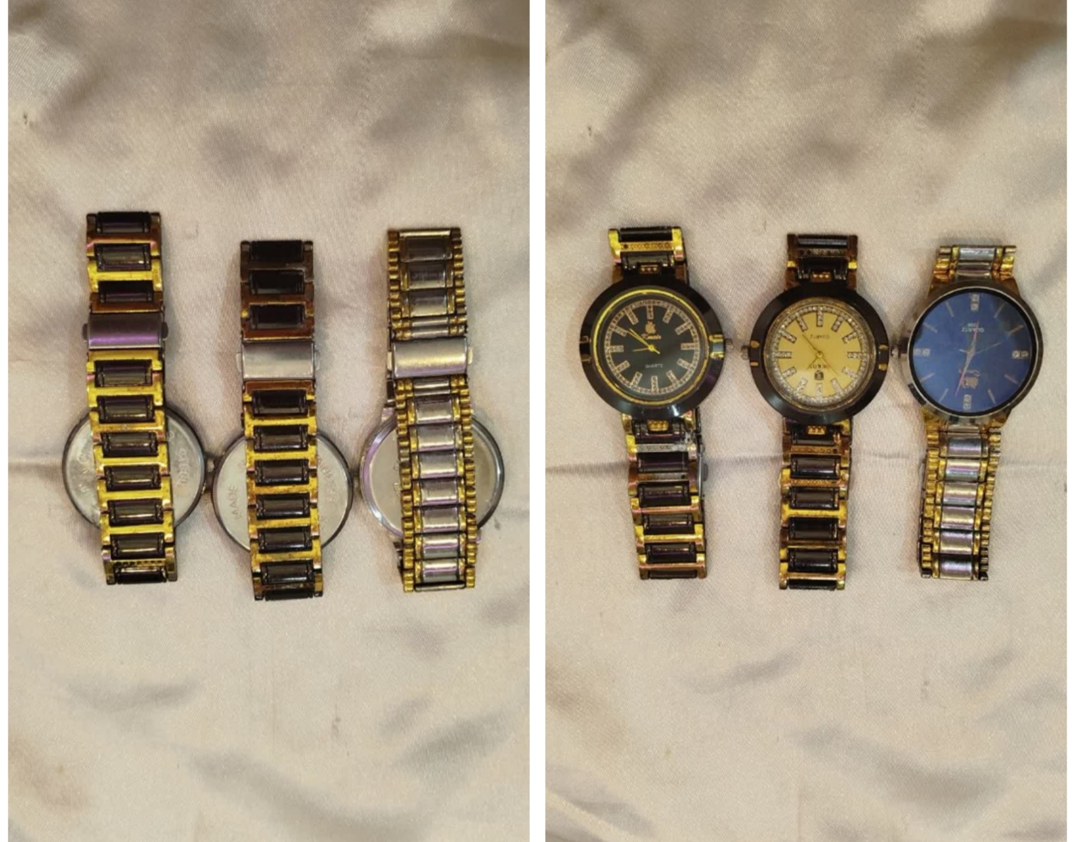 3 عدد ساعت چینی توی بار خیس شده یکیش داره کار میکنه دوتاش نه باتری نداشتم تست کنم .توی بلر خیس شدن و داخلش سولفات زده من بعنوان معیوب میفروشم