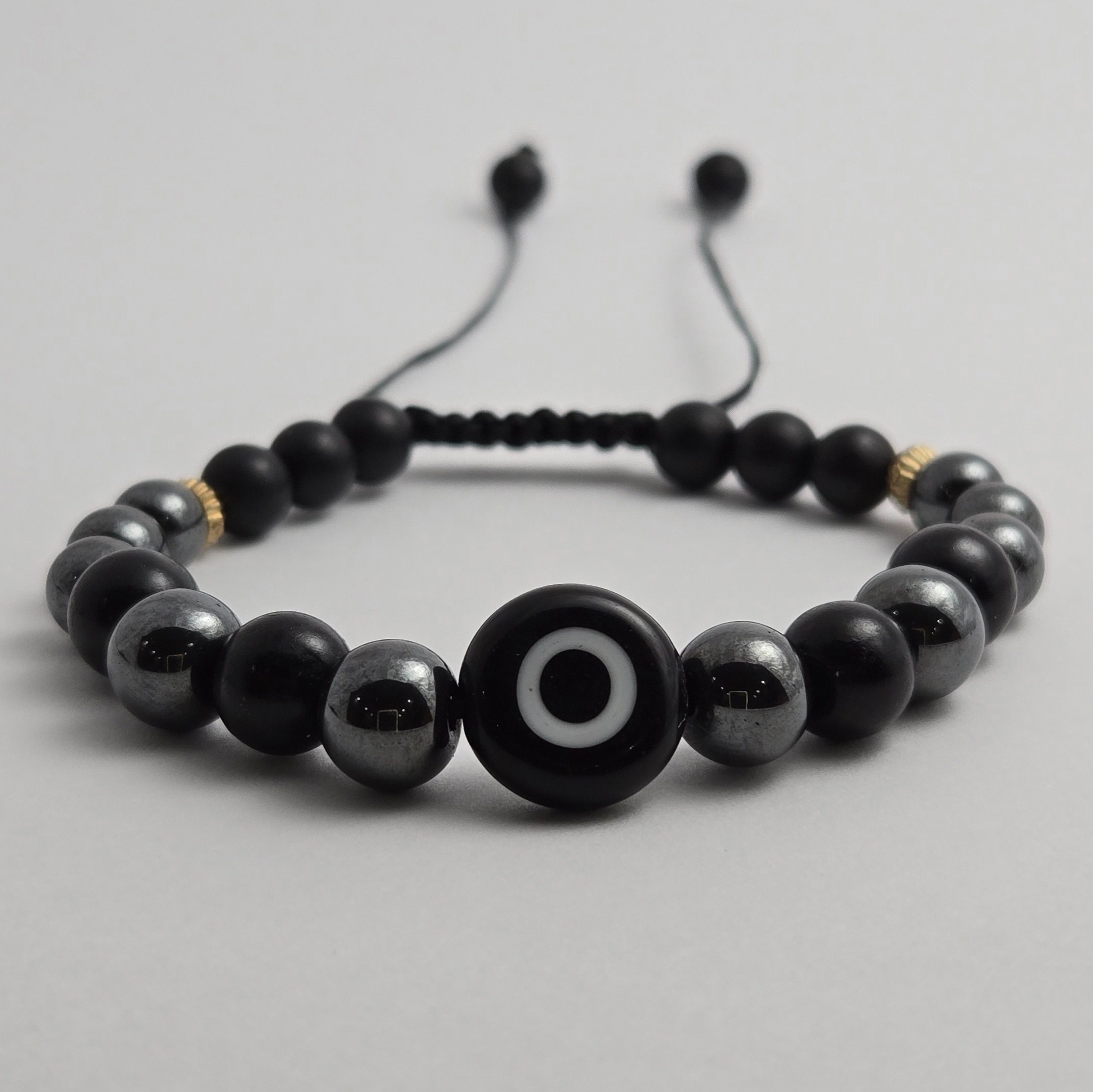 دستبند سنگی چشم نظر با مهره های سنگی حدید و عقیق سیاه معدنی